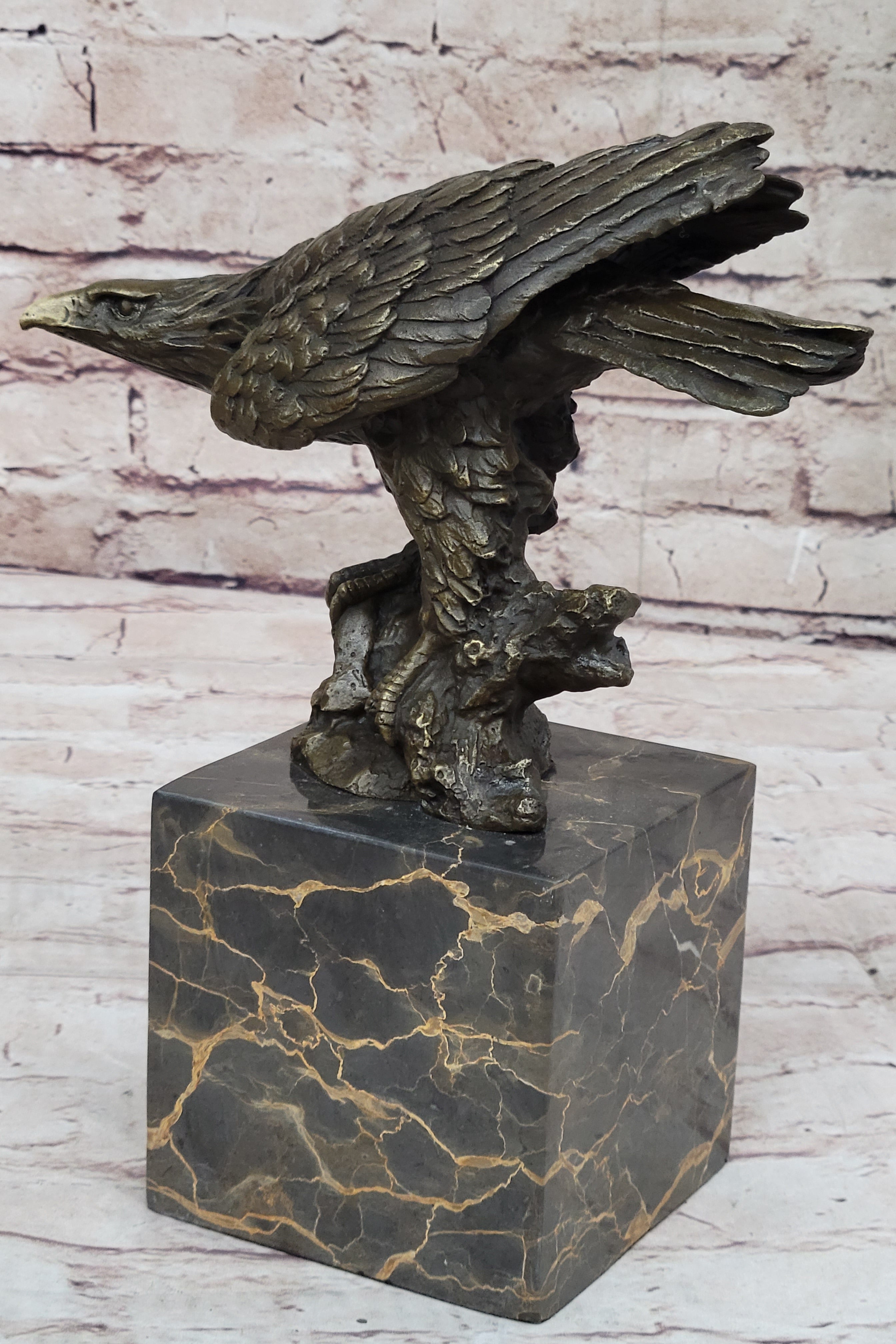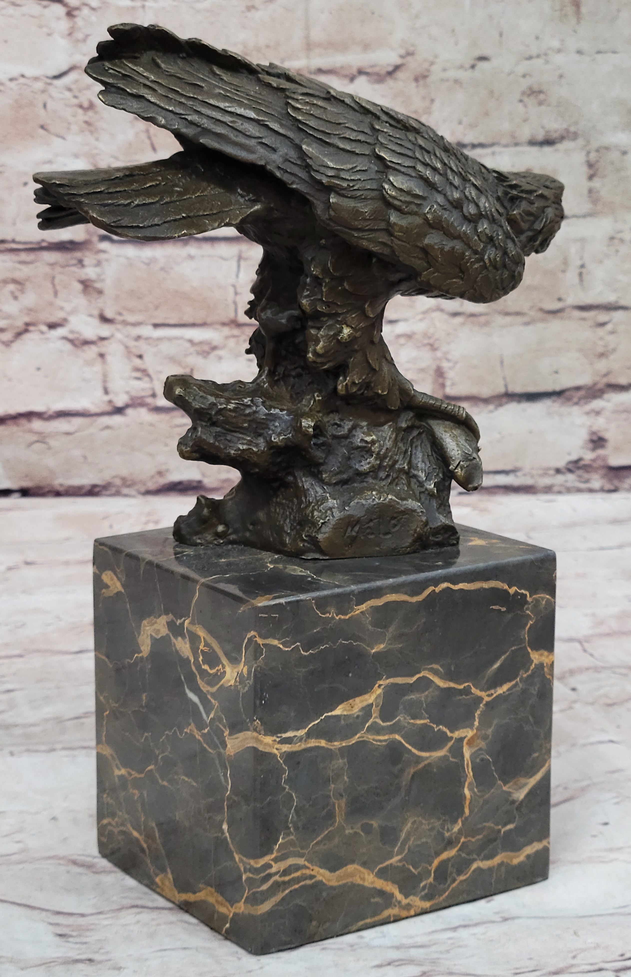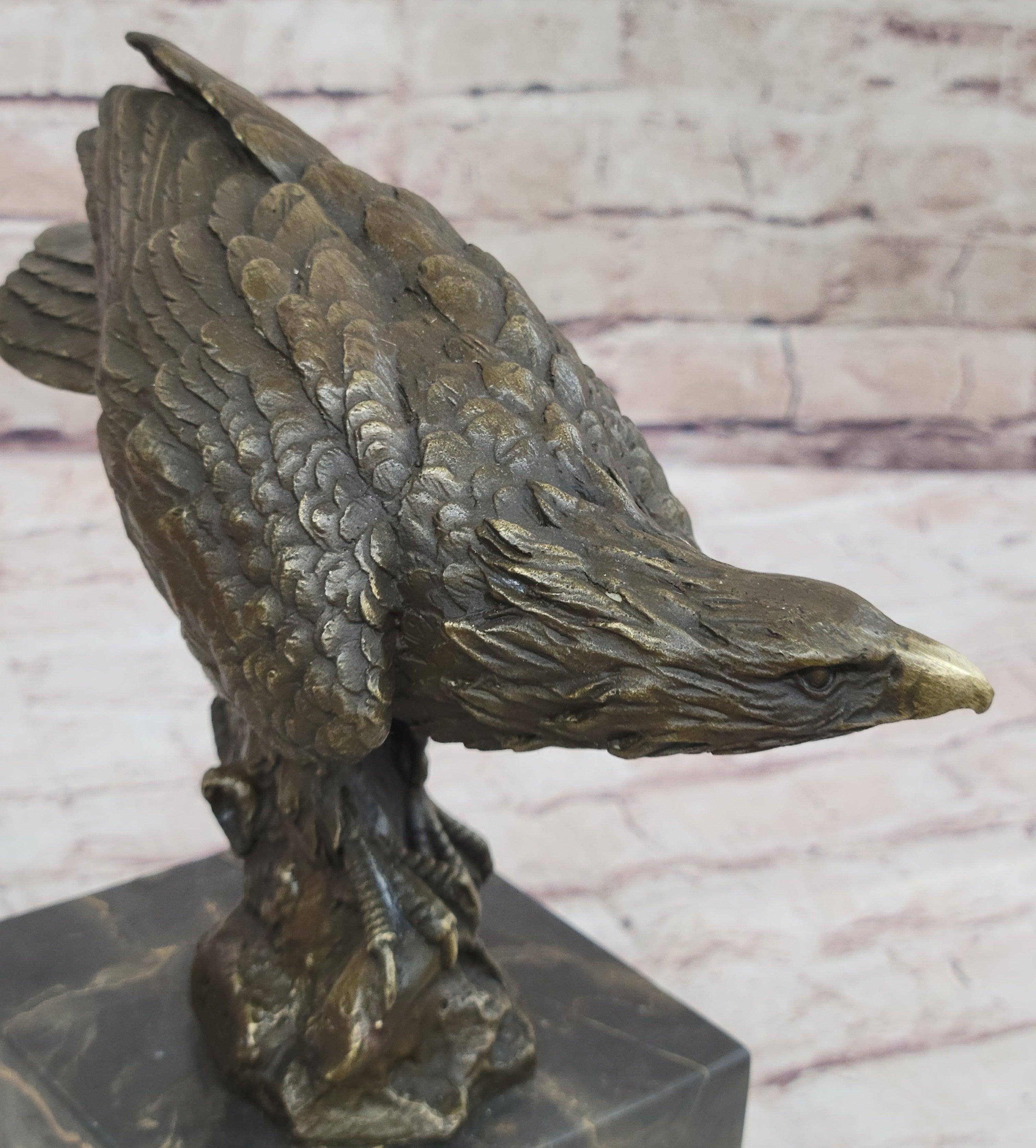 Crafted using the traditional lost-wax casting method, this bronze sculpture exemplifies the timeless artistry and craftsmanship associated with this ancient technique. The sculpture's rich brown patina finish enhances its lifelike appearance, further accentuating the intricate details of the eagle's form. It is mounted on a marble base, adding a touch of elegance and serving as a stable foundation for the artwork.