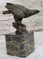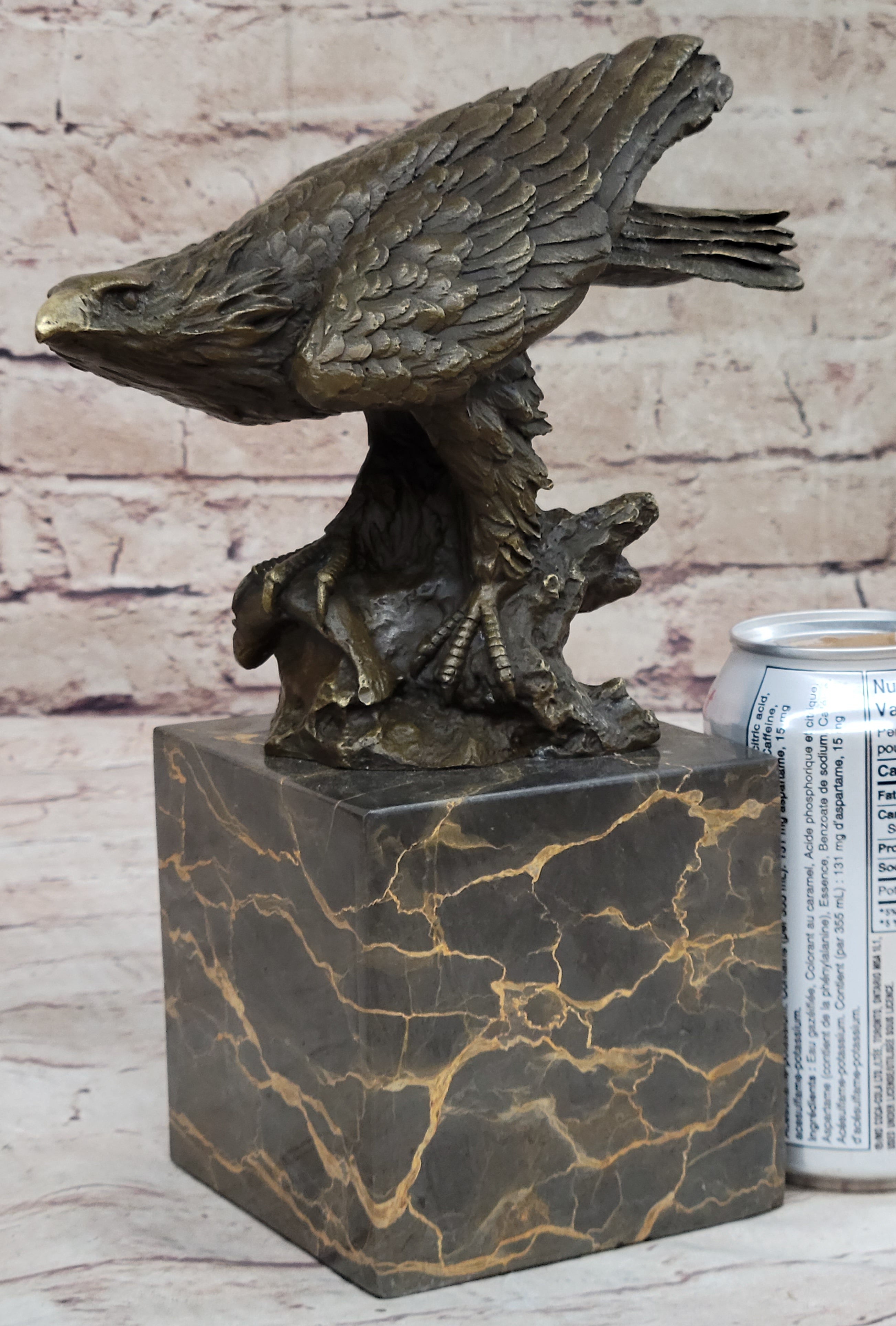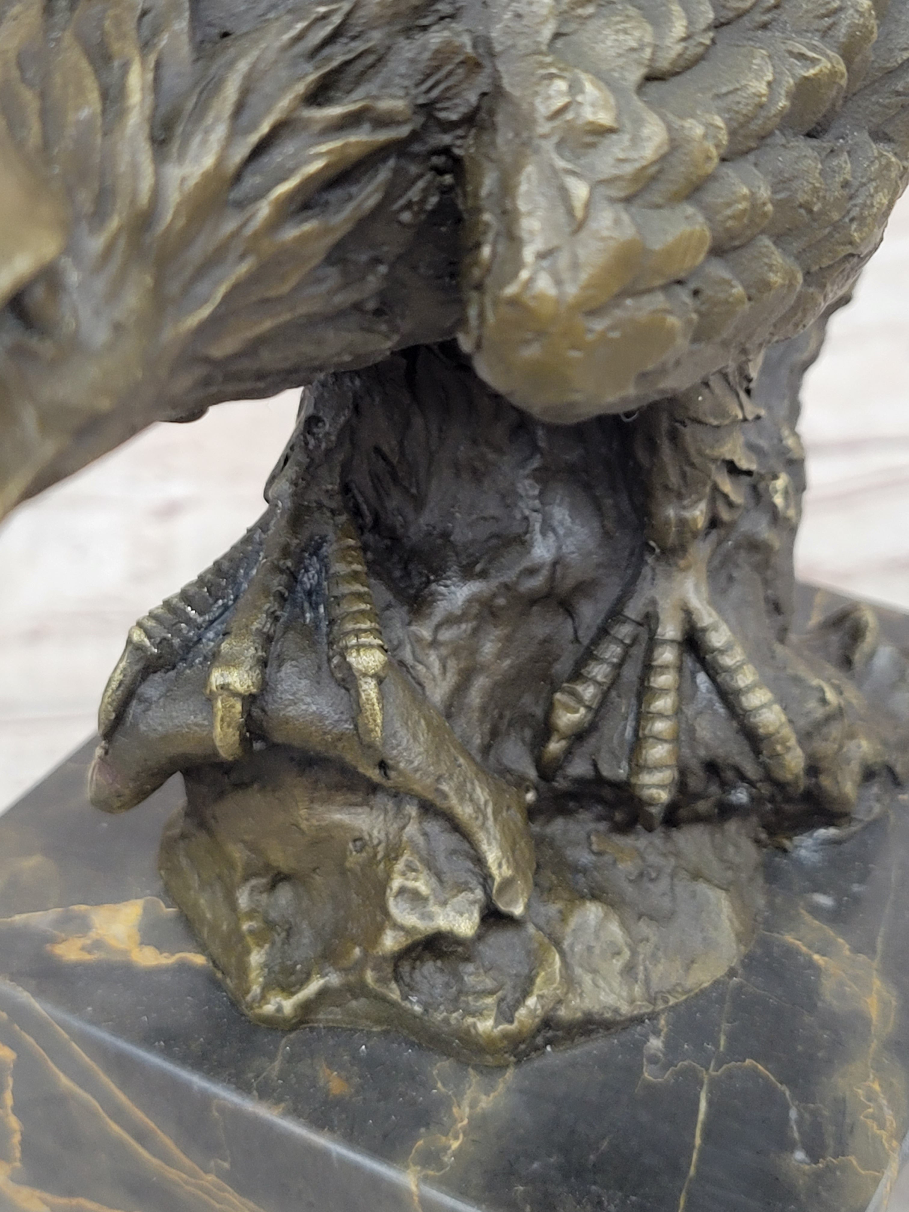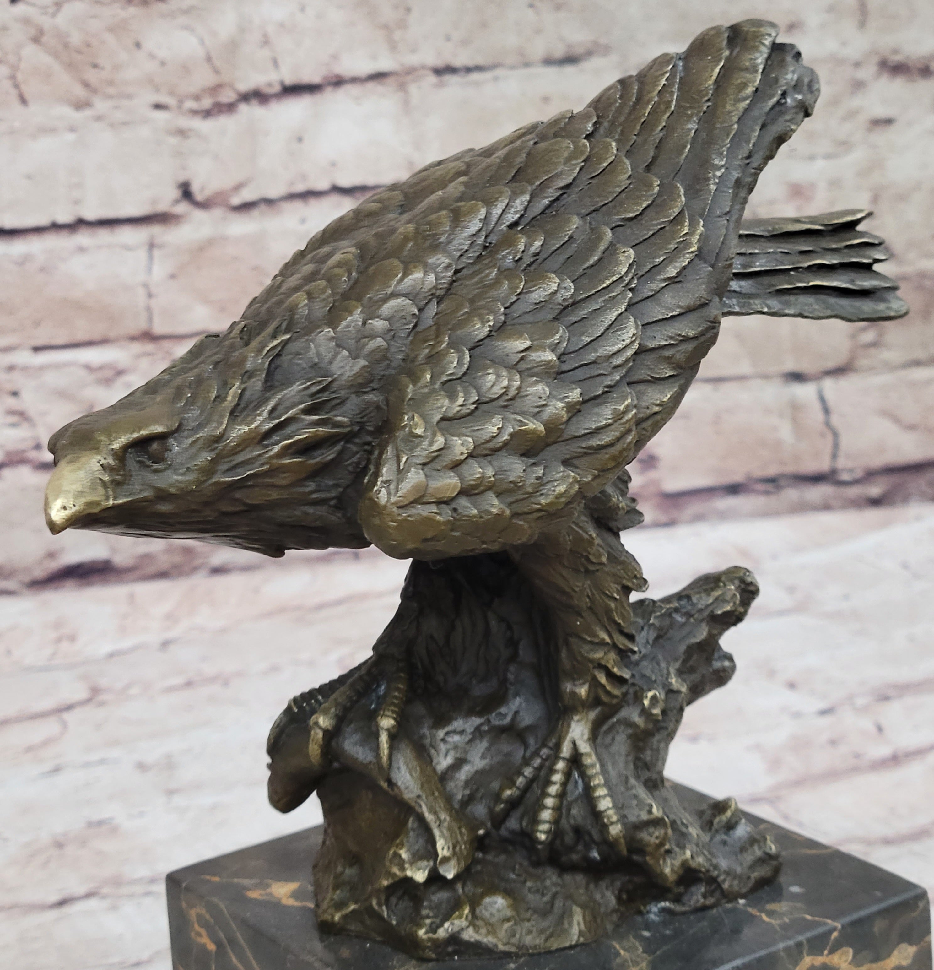 Crafted using the traditional lost-wax casting method, this bronze sculpture exemplifies the timeless artistry and craftsmanship associated with this ancient technique. The sculpture's rich brown patina finish enhances its lifelike appearance, further accentuating the intricate details of the eagle's form. It is mounted on a marble base, adding a touch of elegance and serving as a stable foundation for the artwork.