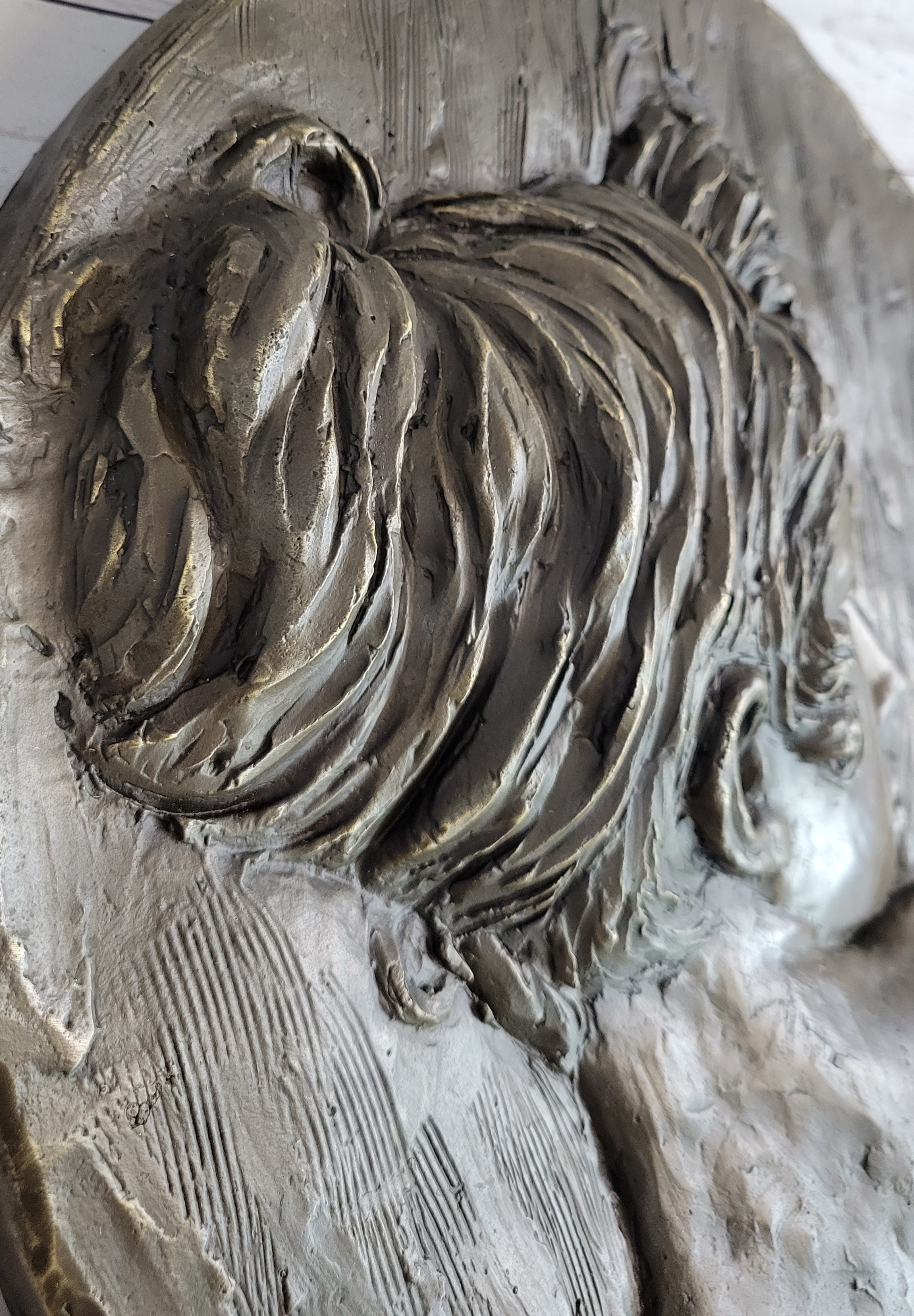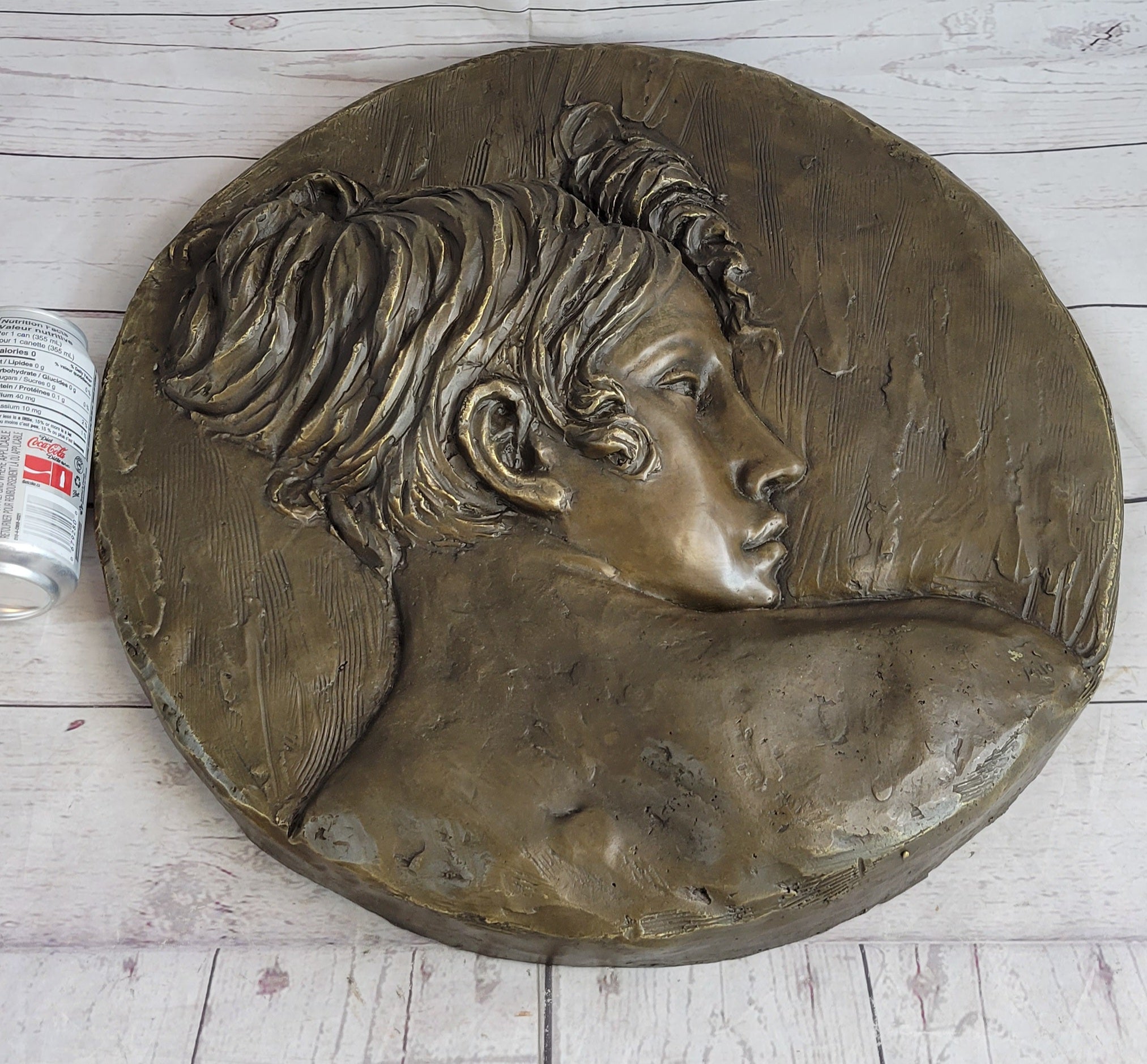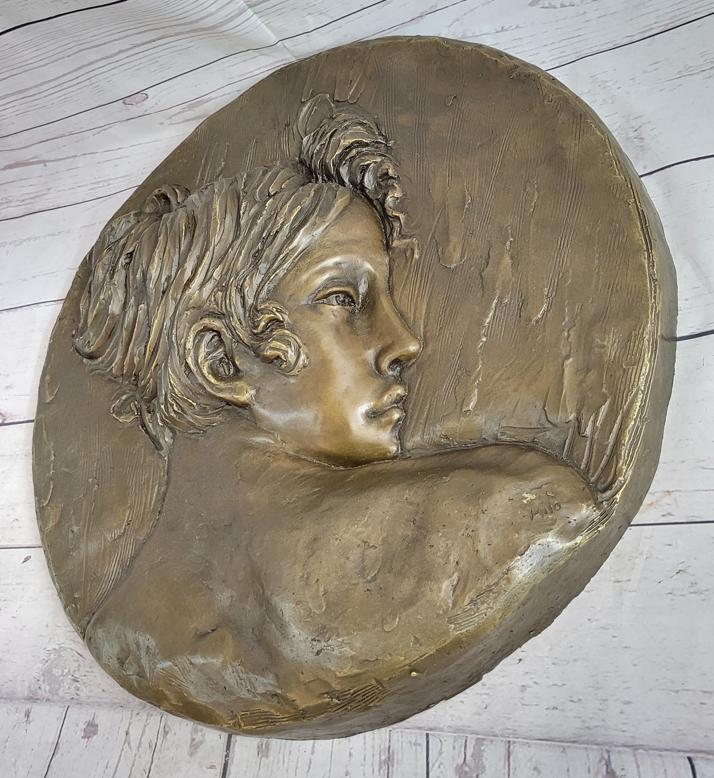 This beautiful wall piece depicts a the profile a young woman. Her expression is solemn. Freshly blossomed flowers surround the whole piece. Her hair hare is styled in soft waves. This elegant piece will add class and style to any living room, dining room or parlor. The piece wax crafted using the lost wax method. It is signed by the artist MiloBronze Dimensions :Height 17" x Width 17"