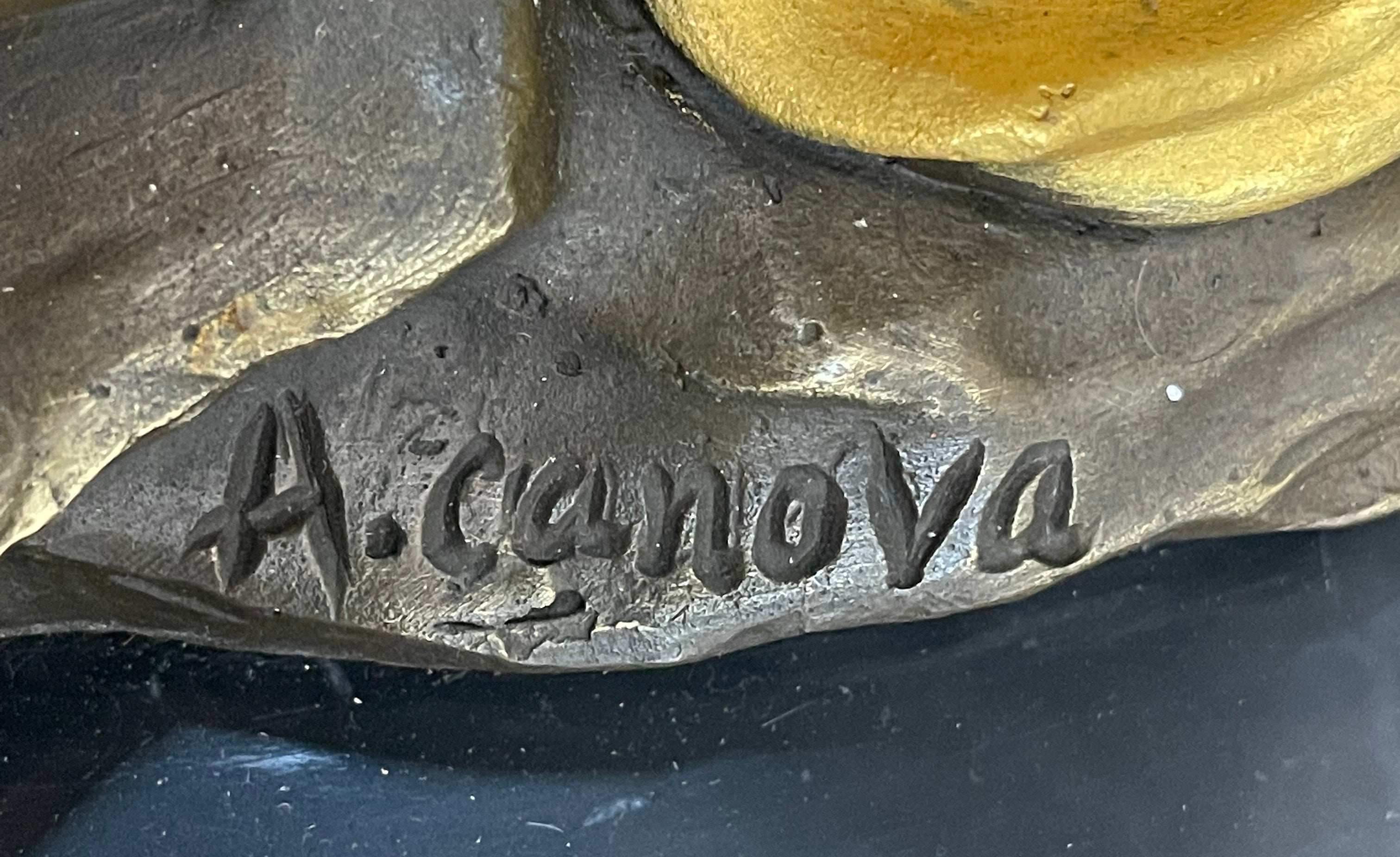 This captivating sculpture is meticulously handcrafted from 100% bronze, employing the revered "Lost Wax Method." Its rich brown patina, accentuated with delicate gold accents, lends depth and enchantment to every intricate detail. Mounted on a marble base, it exudes an air of sophistication. The sculpture proudly bears the signature of A. Canova, a testament to its quality and artistic merit.
