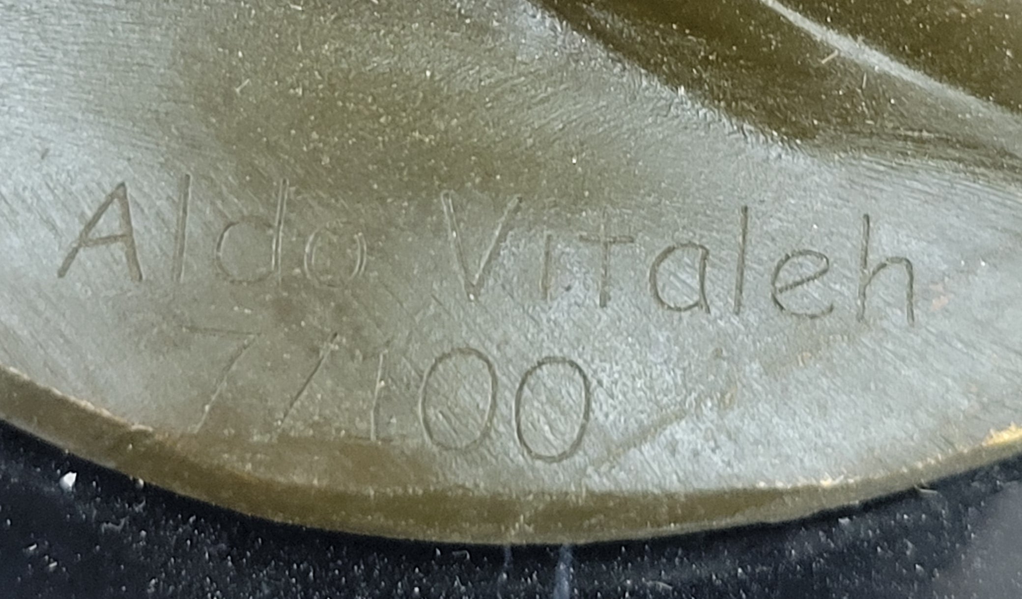 Each piece is signed and numbered by the artist Aldo Vitaleh, ensuring its authenticity and value as a collector’s item. Perfect for lovers of mythology, fine art, and classical sculpture, this Aphrodite figurine is a testament to timeless beauty and artistic mastery.Bronze Dimensions with Marble Base: Height 13" X Width 5"