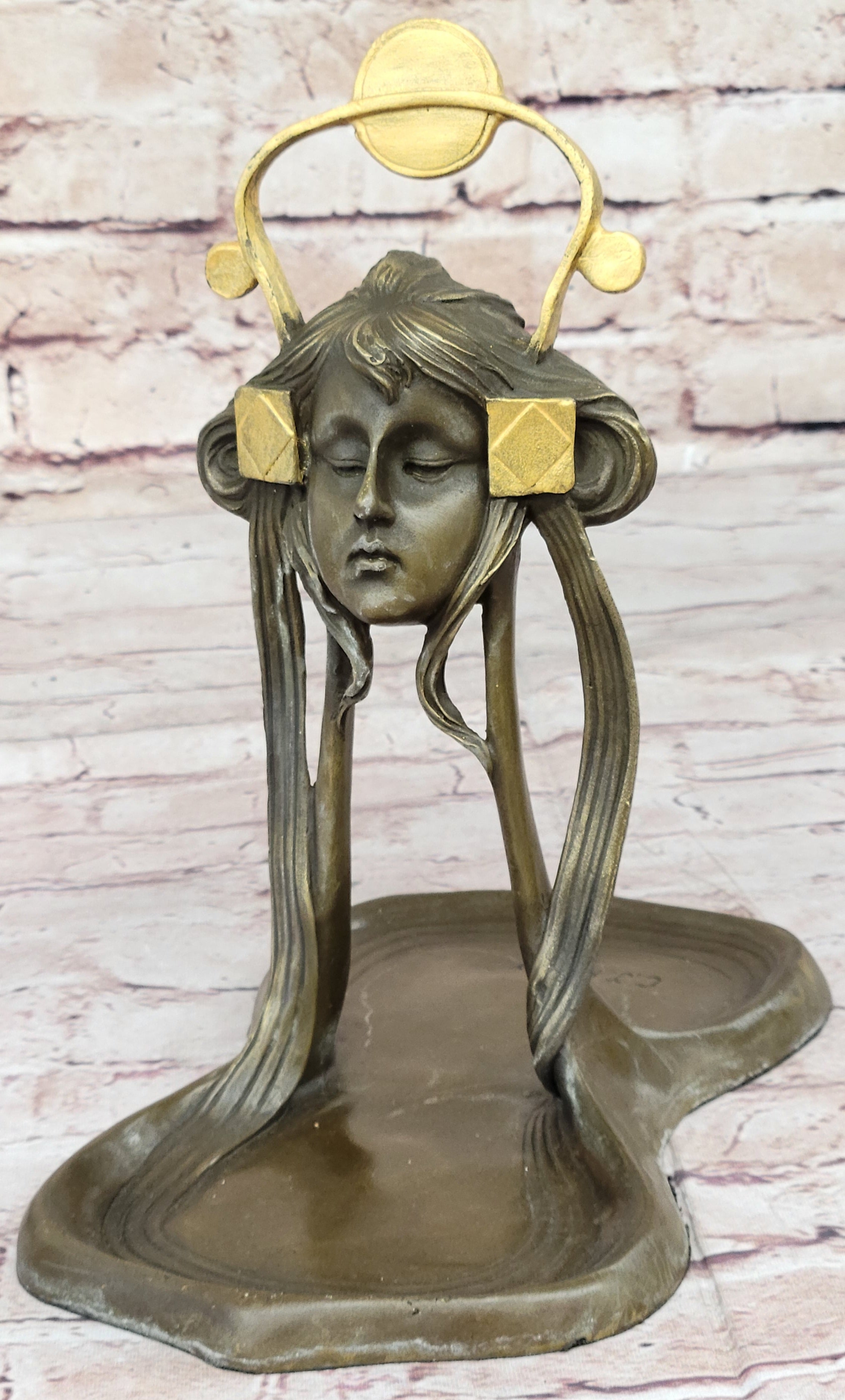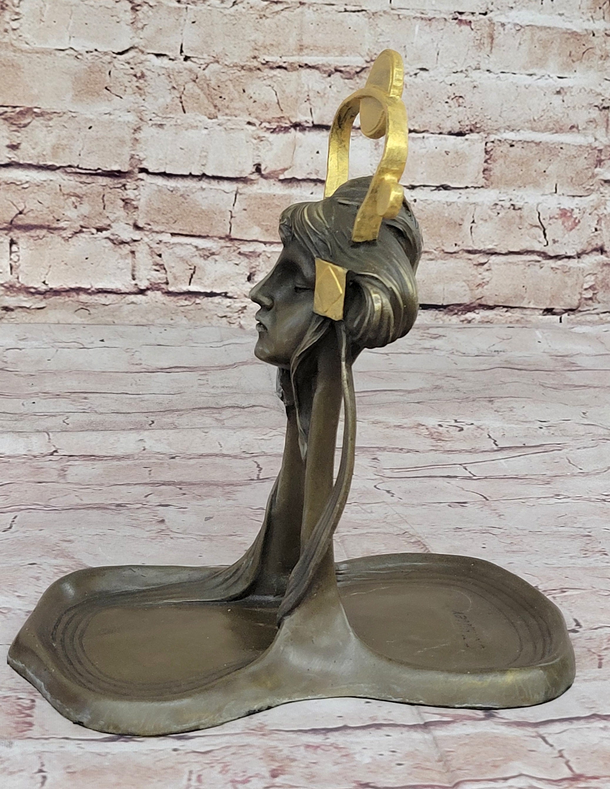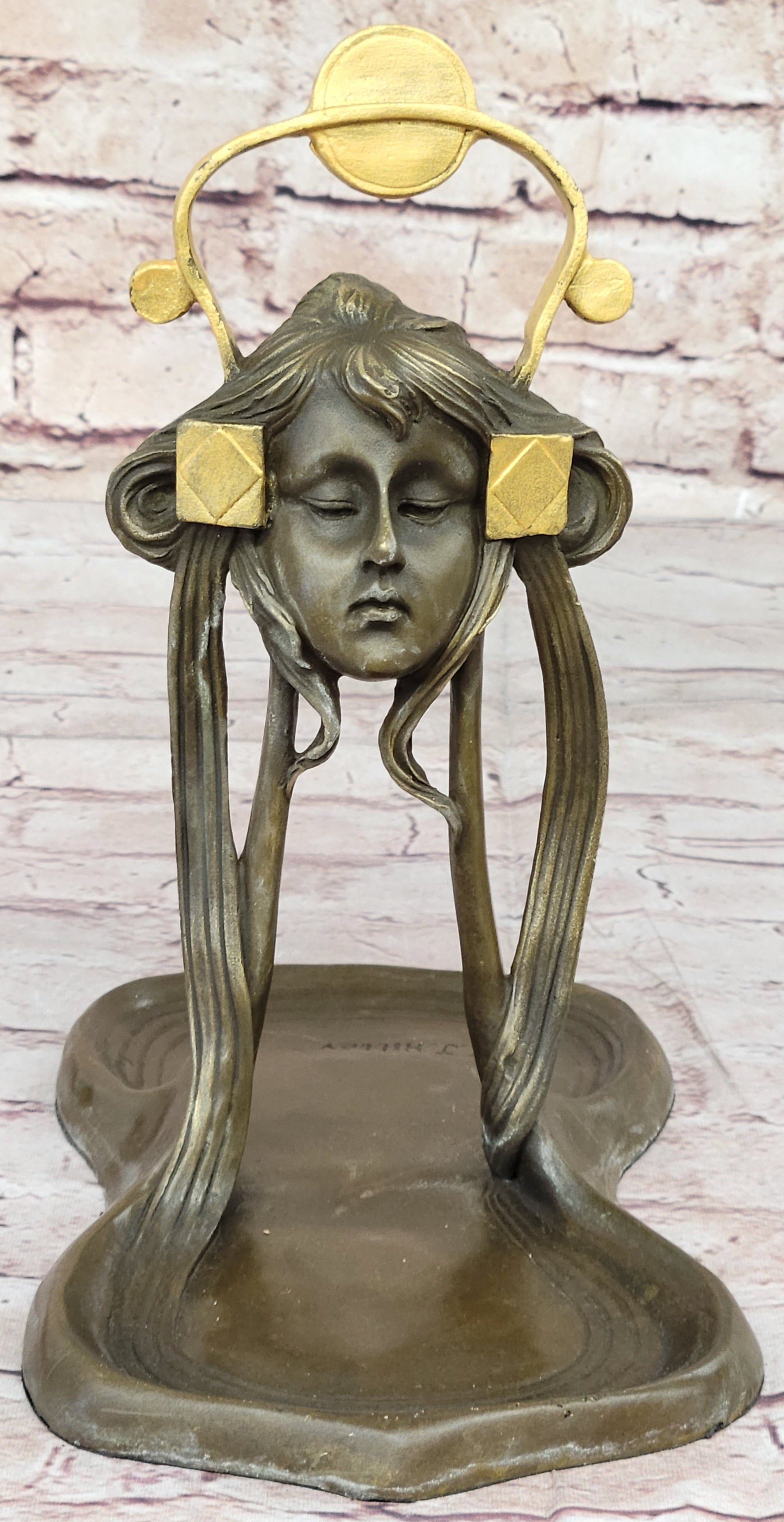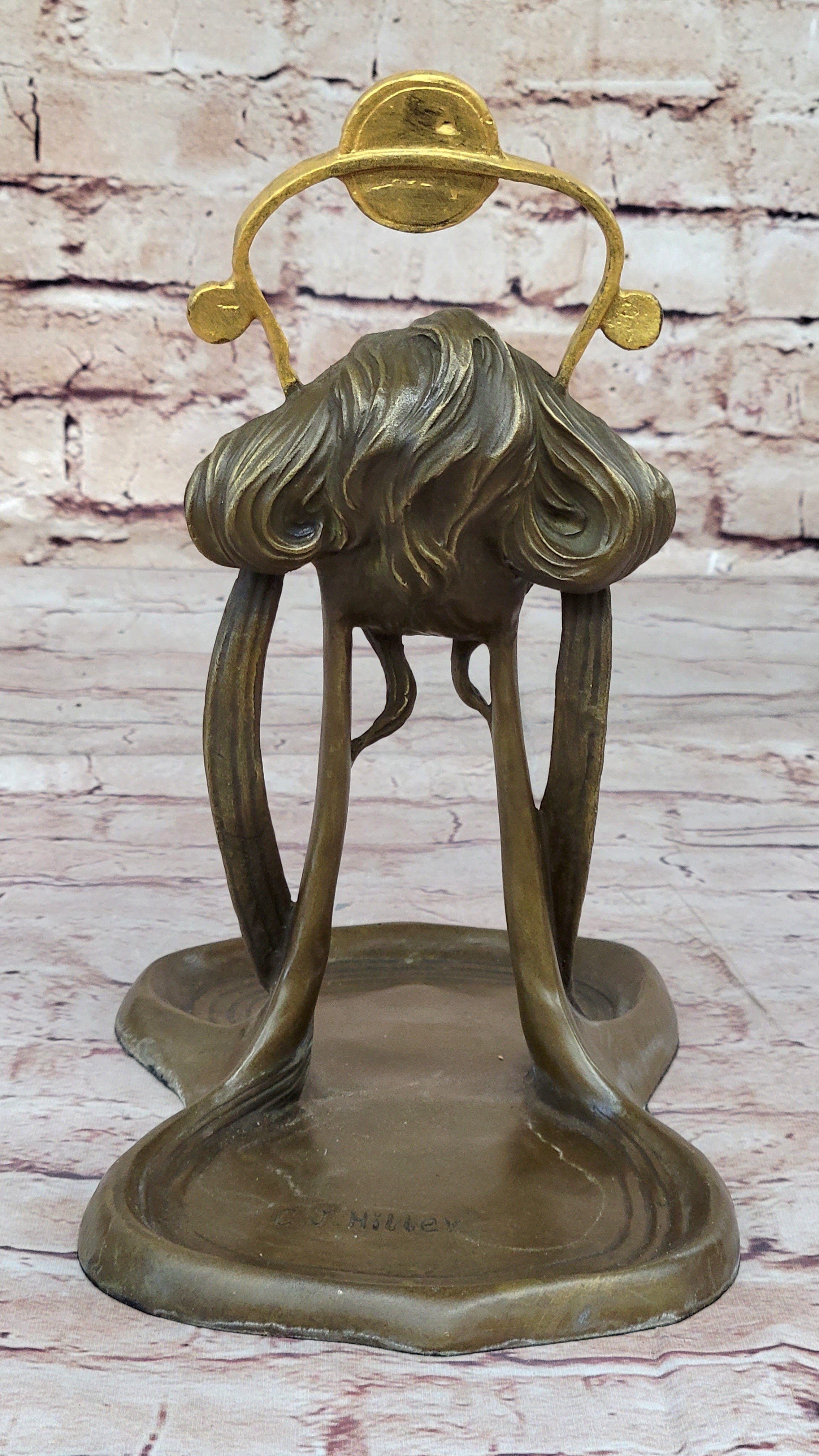 With a combination of a rich brown patina and delicate gold accents, this tray exudes sophistication and charm. Its functionality is paired with aesthetics, making it a perfect gift or a cherished keepsake. The thoughtful addition of a felt-like pad on the base ensures your wooden surfaces remain free from scratches. This Art Nouveau Jewelry Tray is a stunning embodiment of timeless beauty and artistic finesse, sure to enhance any space it graces.Bronze Dimensions: Height 9.5" X Width 9"