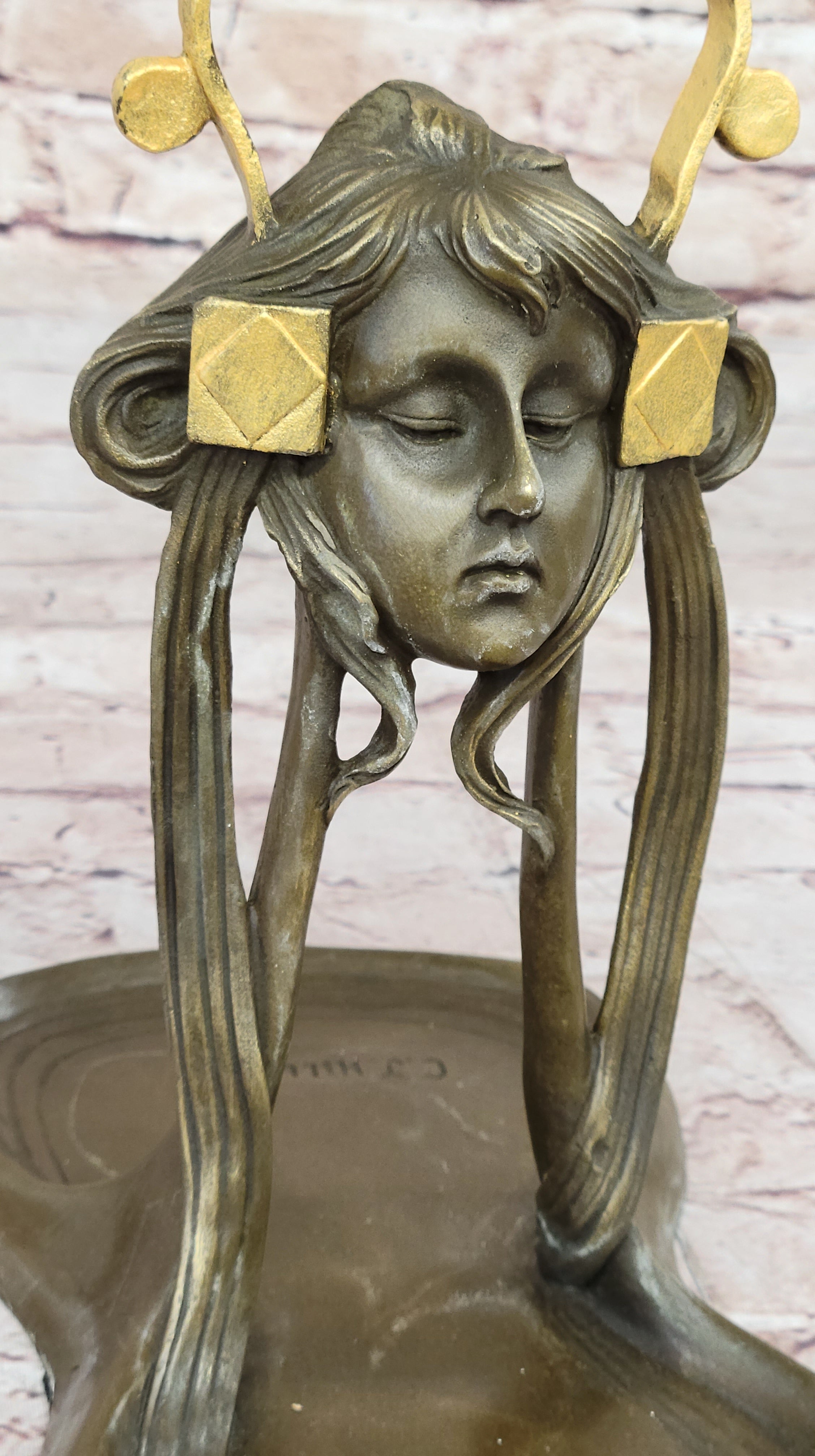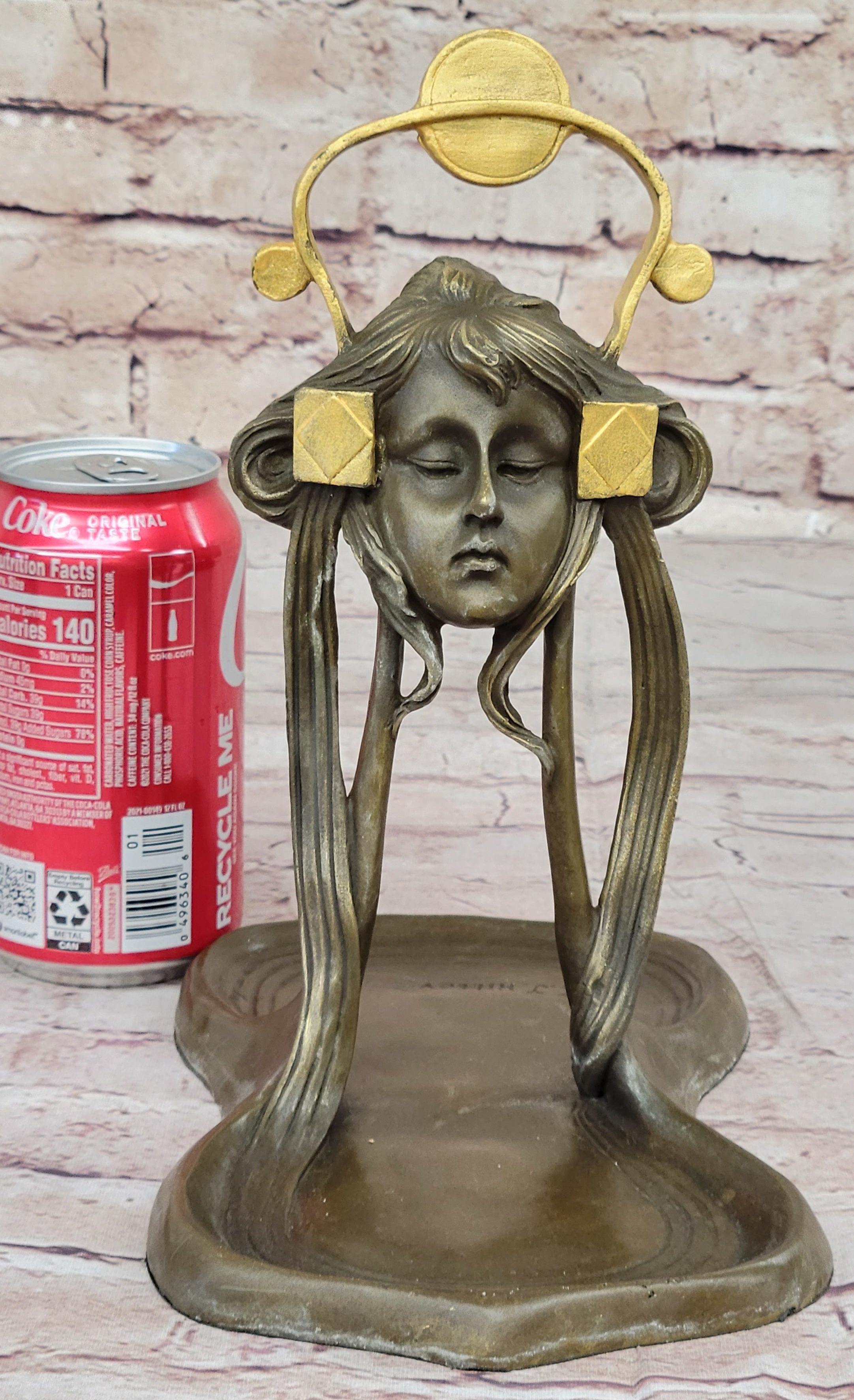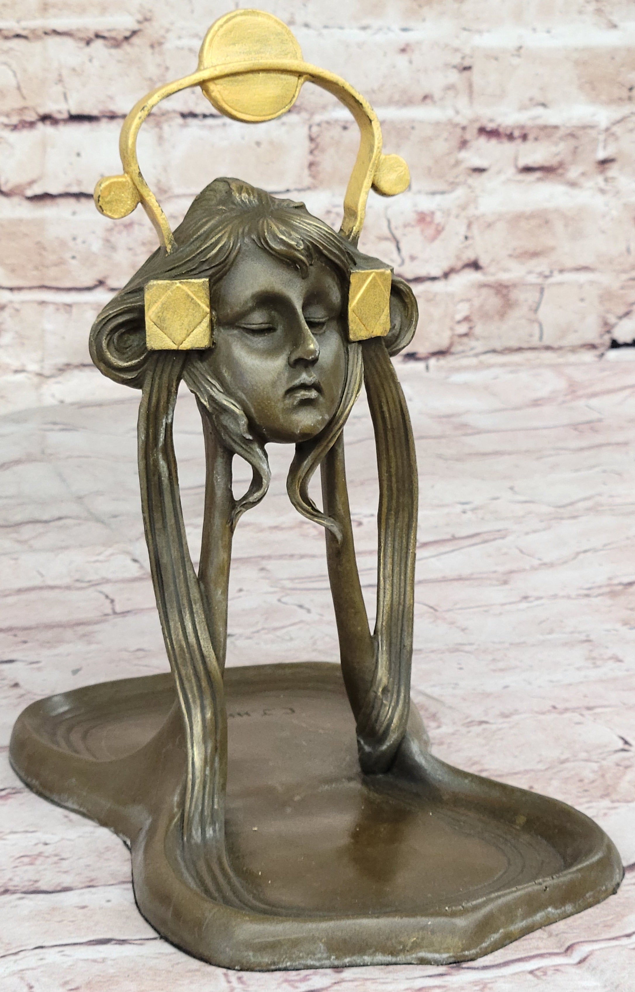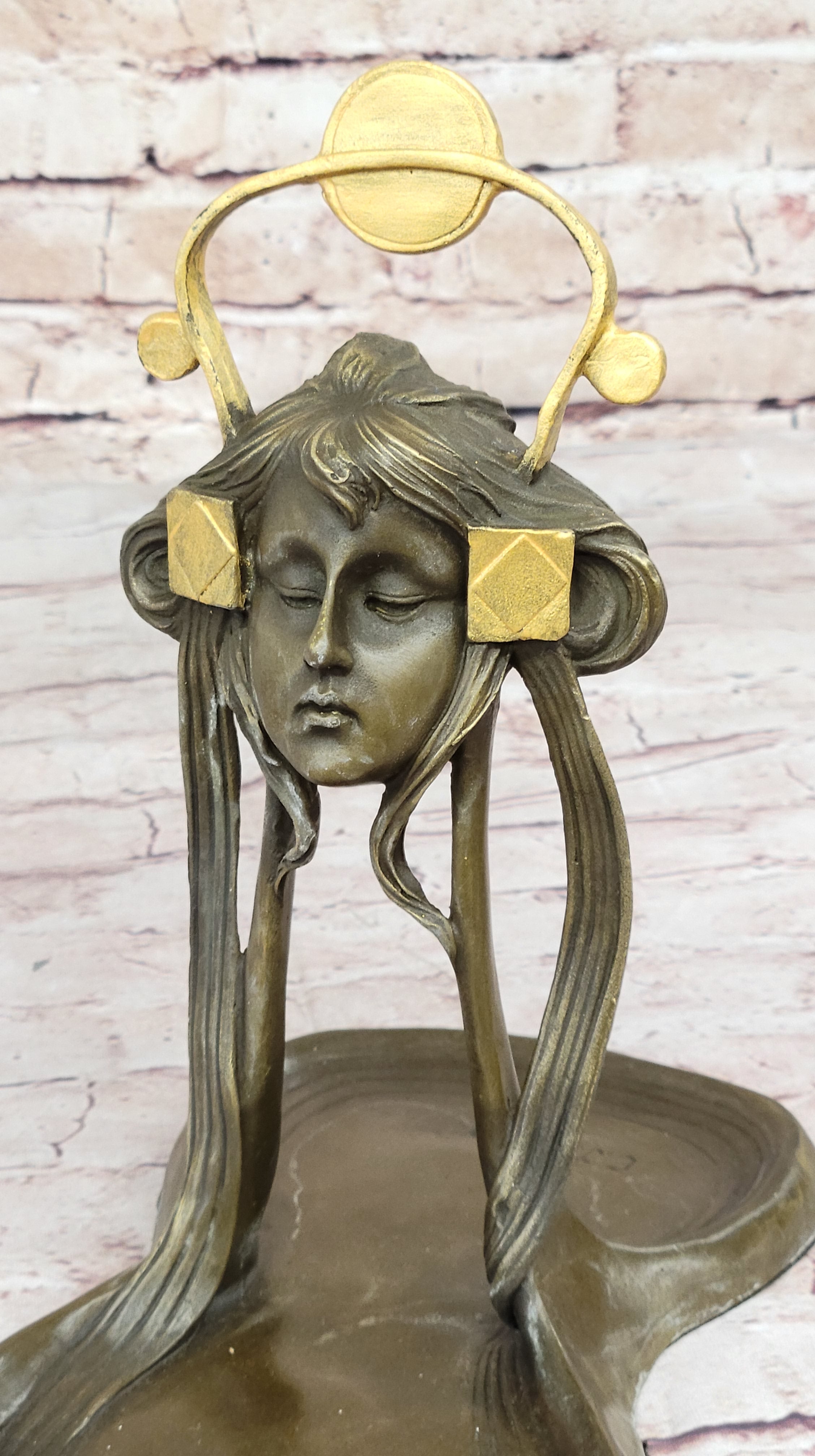 With a combination of a rich brown patina and delicate gold accents, this tray exudes sophistication and charm. Its functionality is paired with aesthetics, making it a perfect gift or a cherished keepsake. The thoughtful addition of a felt-like pad on the base ensures your wooden surfaces remain free from scratches. This Art Nouveau Jewelry Tray is a stunning embodiment of timeless beauty and artistic finesse, sure to enhance any space it graces.Bronze Dimensions: Height 9.5" X Width 9"