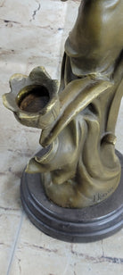 This exquisite bronze candle holder captures a serene moment of feminine grace and tranquility. A woman reclines gracefully, gently wiping sweat from her brow in a gesture that suggests peaceful rest. One hand is placed behind her for support as she leans back, radiating an effortless inner beauty. She is draped in a flowing robe that clings elegantly to her figure, revealing her legs up to the thigh and pooling dramatically around her on the ground. Her poised stance and subtle curves lend dynamic dimension and visual intrigue to the piece.