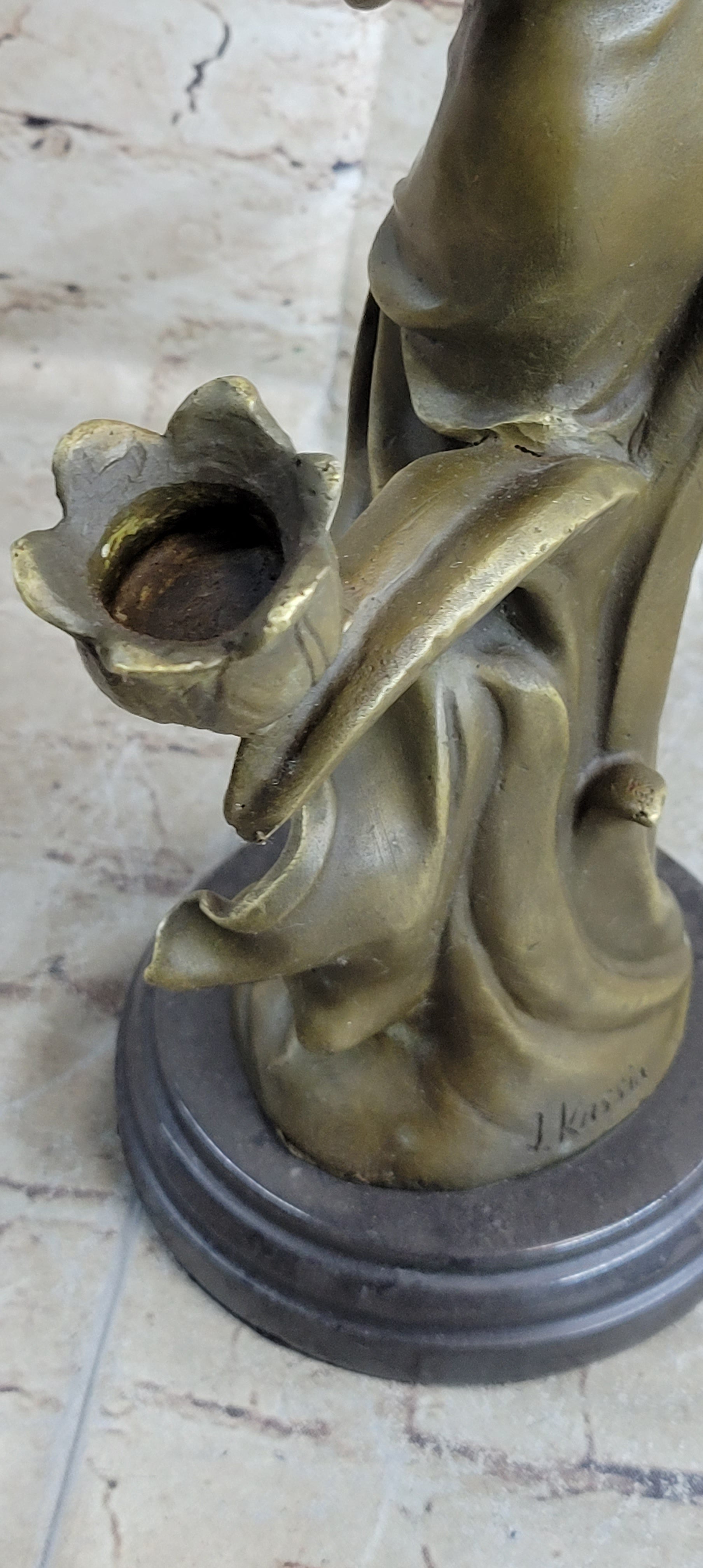 Floral elements delicately integrated into the sculpture serve as candle holders, blending art and function with seamless elegance. When lit, the candlelight dances across the bronze surface, casting a soft, golden glow that enhances the figure’s refined contours and brings the artwork to life. The interplay of light and form creates a breathtaking ambiance that elevates the mood of any room.