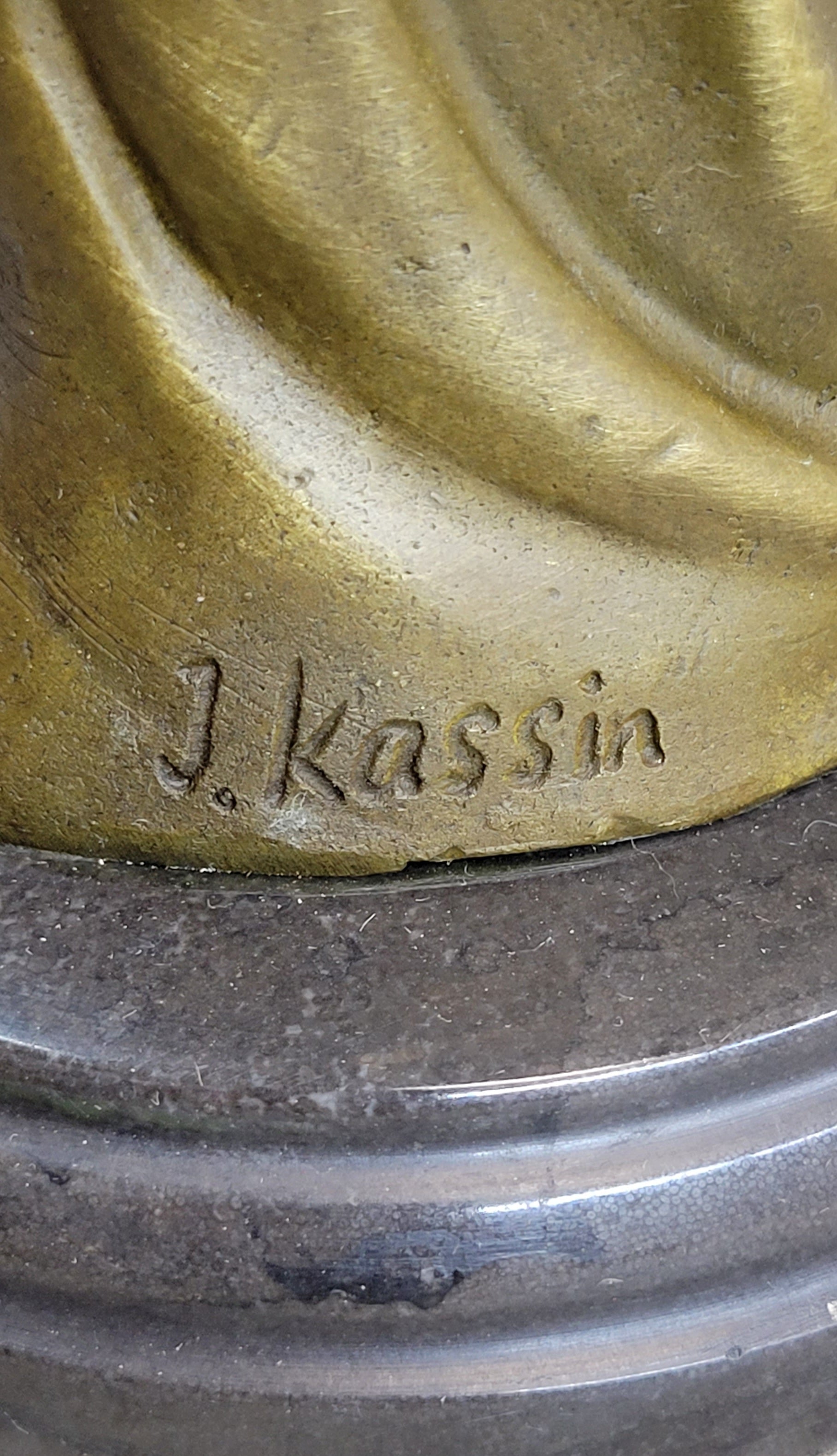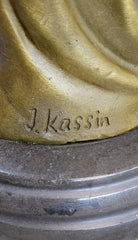 Handcrafted with exceptional attention to detail and finished with a warm patina, this candle holder is a true work of art. Signed by the artist J. Kassin, it is an elegant and sophisticated addition to any home, offering both decorative beauty and a touch of romantic lighting.Each Bronze Dimensions with Marble Base: Height 16" X Width 7"