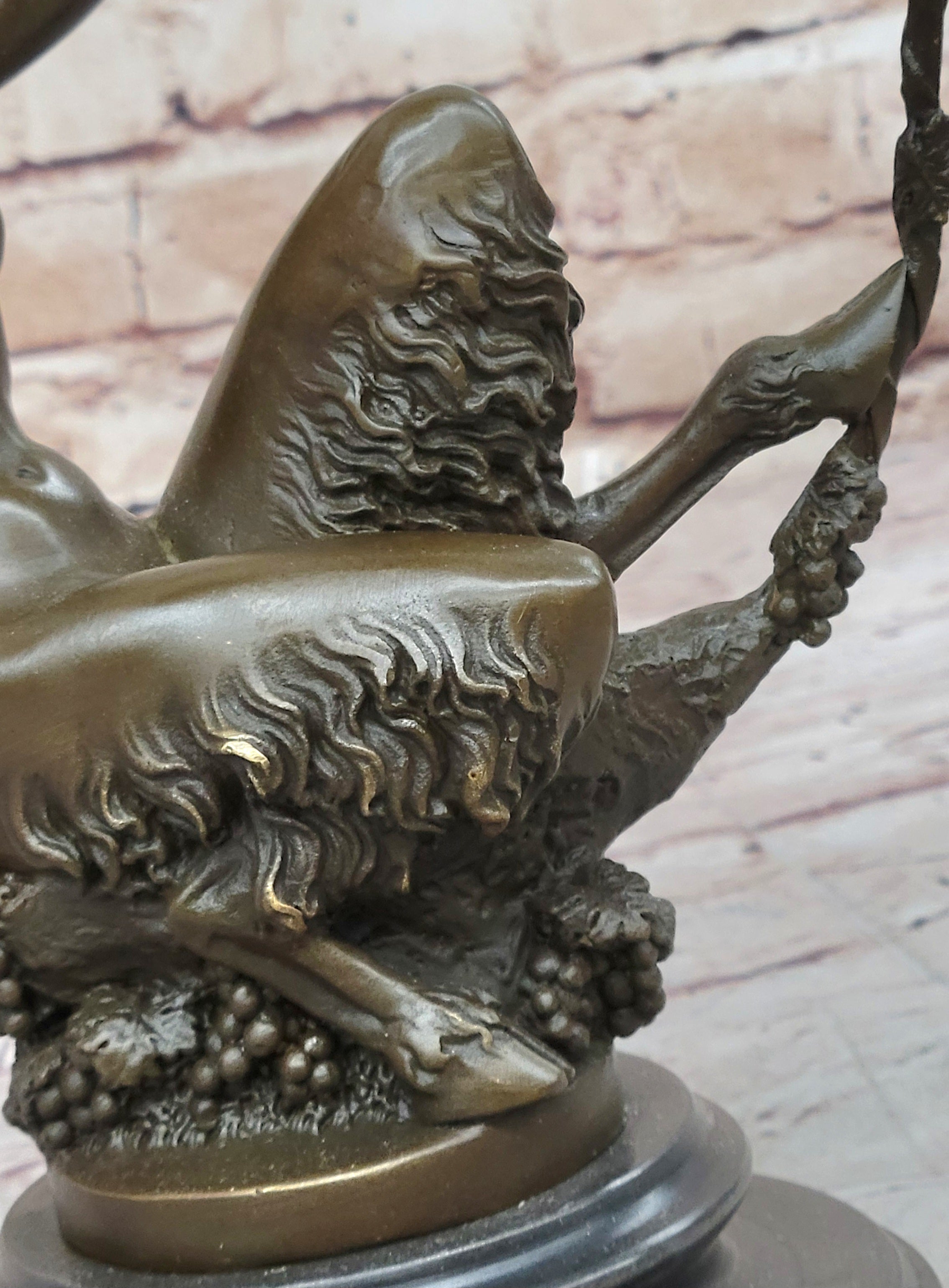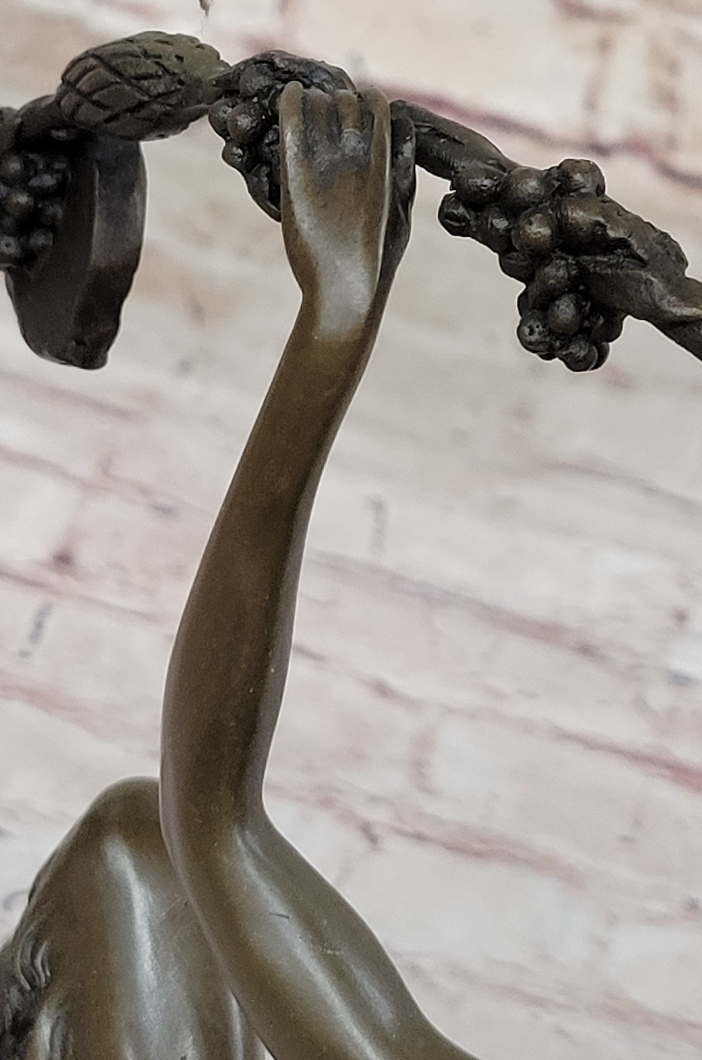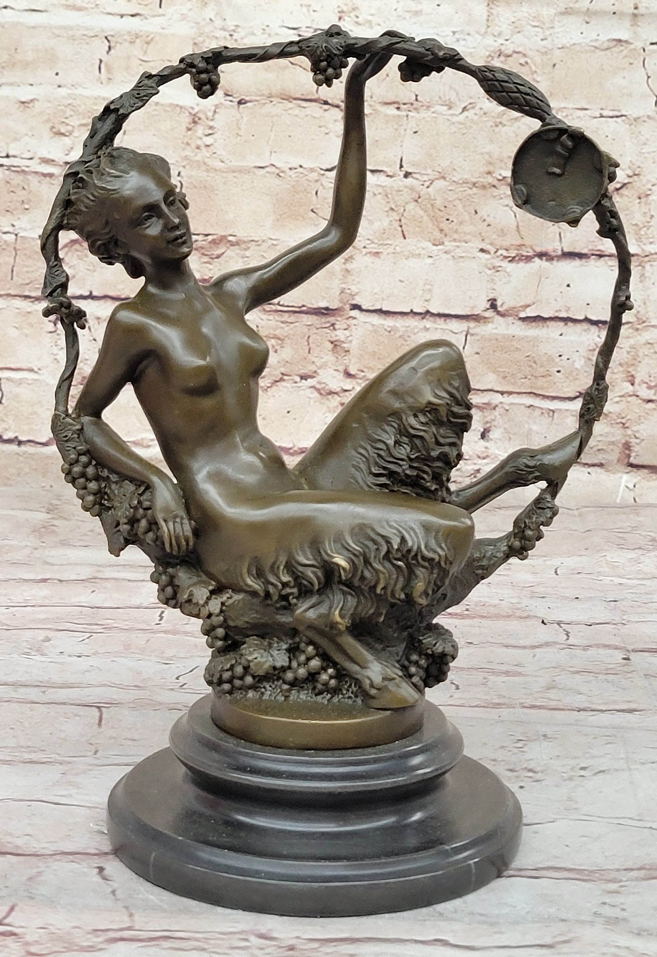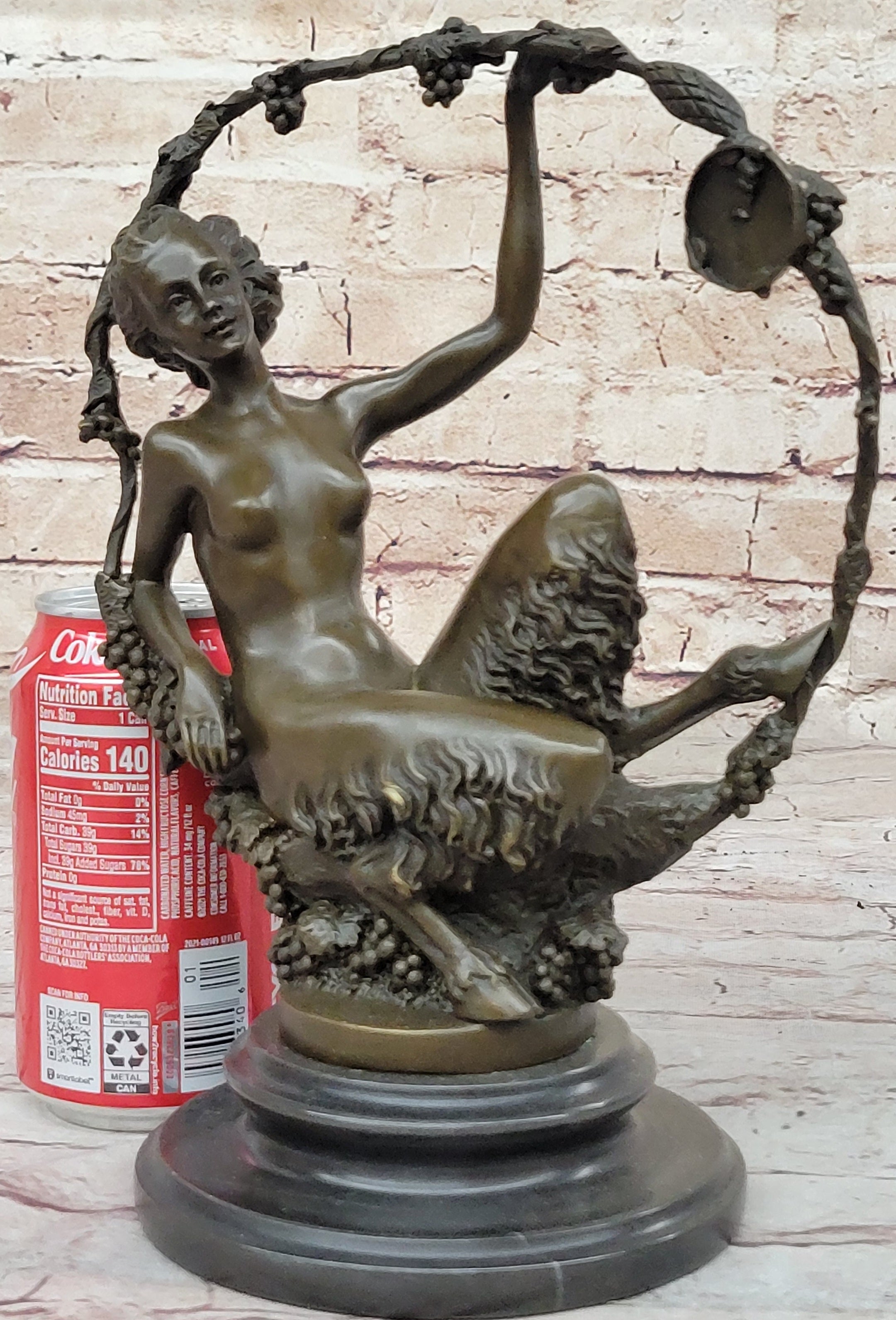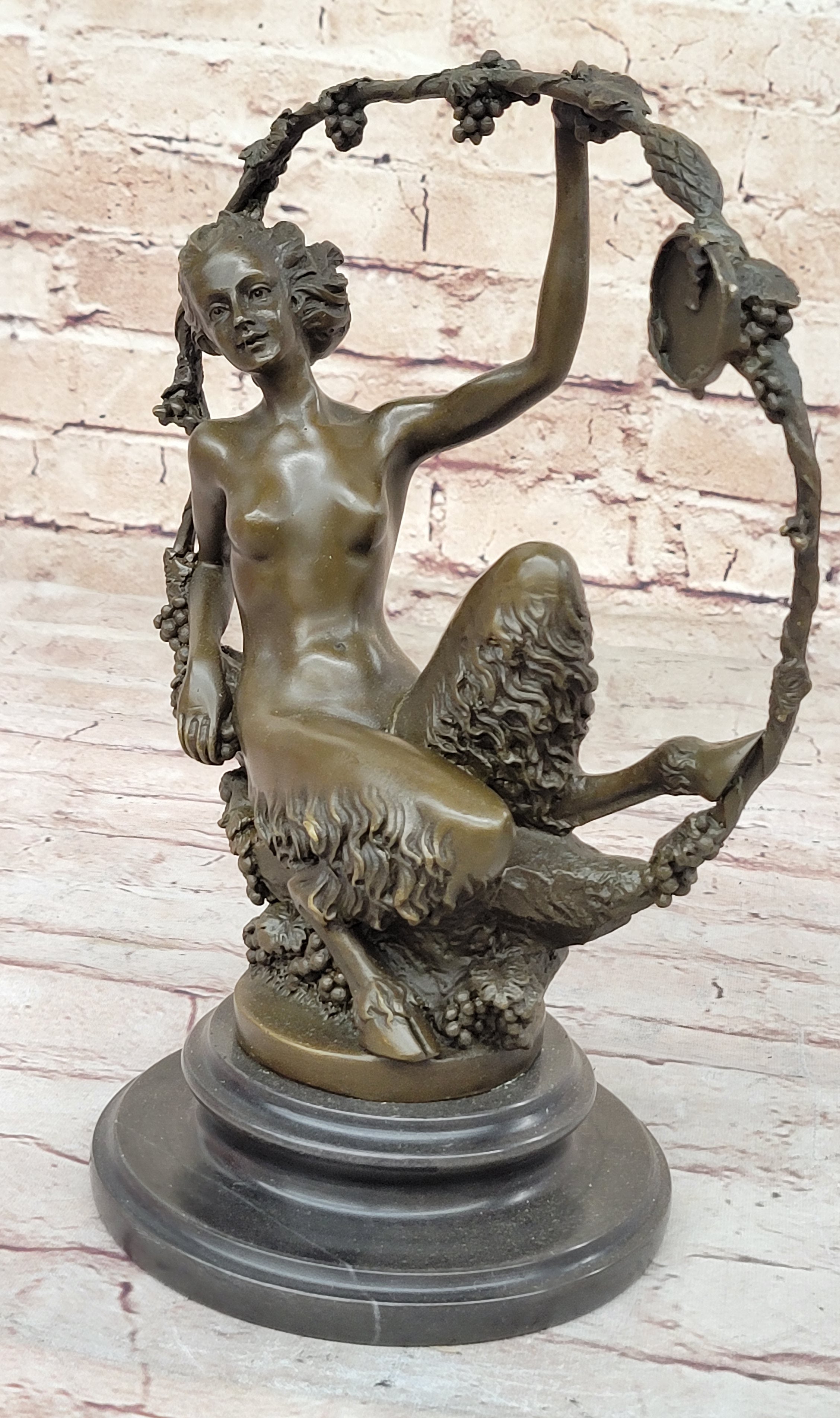 Step into the captivating realm of Greek mythology with our alluring Nude Female Faun in Wreath of Vines Bronze Sculpture. This exquisite artwork is a meticulous reproduction of the original masterpiece by Aurore Onu, a distinguished French sculptor renowned for her creations. This sculpture vividly portrays a nude female faun, a mystical being with the features of both a human and a goat. Nestled within a delicate wreath of vines, the faun's presence is a testament to the artist's dedication to intricate detailing, capturing the essence of this legendary creature in every curve and contour. Fashioned using the revered lost wax casting technique, the sculpture boasts a hot cast bronze finish, ensuring both its exceptional quality and long-lasting endurance. Anchored upon a marble base, this piece is a versatile addition, befitting display on a table, bookshelf, or mantle. Blending lightweight elegance with remarkable robustness, it infuses your home or office decor with a captivating touch of Greek mythology. With the Nude Female Faun in Wreath of Vines Bronze Sculpture, you welcome a conversation-stirring masterpiece that commands attention and admiration from all beholders. As the premier distributor of small to medium-sized bronze sculptures, we're committed to delivering the finest European bronze art at competitive prices. All sculptures are promptly shipped from our New York warehouse within a single business day, ensuring swift arrival and impeccable condition. Embrace the allure of Greek mythology with this remarkable sculpture today.