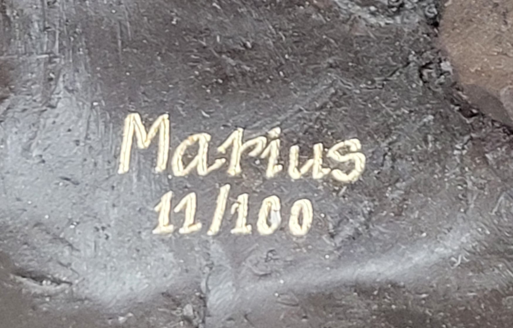 Cast using the ancient “Lost Wax Method”, the sculpture boasts a rich brown patina that enhances its texture and visual depth. The dragon is mounted securely on a polished black marble base, which adds elegance and stability to the piece. Every curve and scale of the dragon’s form reflects the meticulous detail expected of a limited edition artwork, and the piece is proudly signed by the artist Thomas, underscoring its authenticity and collectible appeal.
