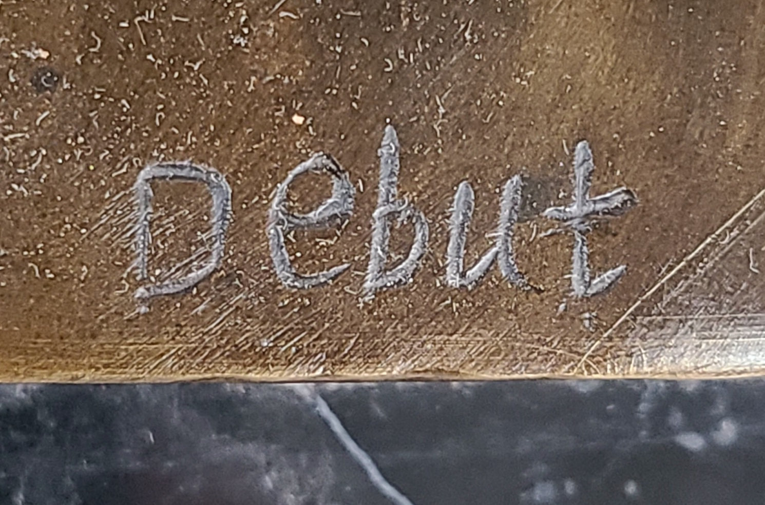 Crafted using the timeless lost-wax casting technique, this bronze sculpture embodies the mastery of ancient sculpting methods. The rich brown patina finish adds depth and character to the piece, enhancing its visual appeal. Resting upon a black marble base, adorned with the signature of the esteemed artist J. Debut, this sculpture is a testament to its artistic excellence and historical significance.
