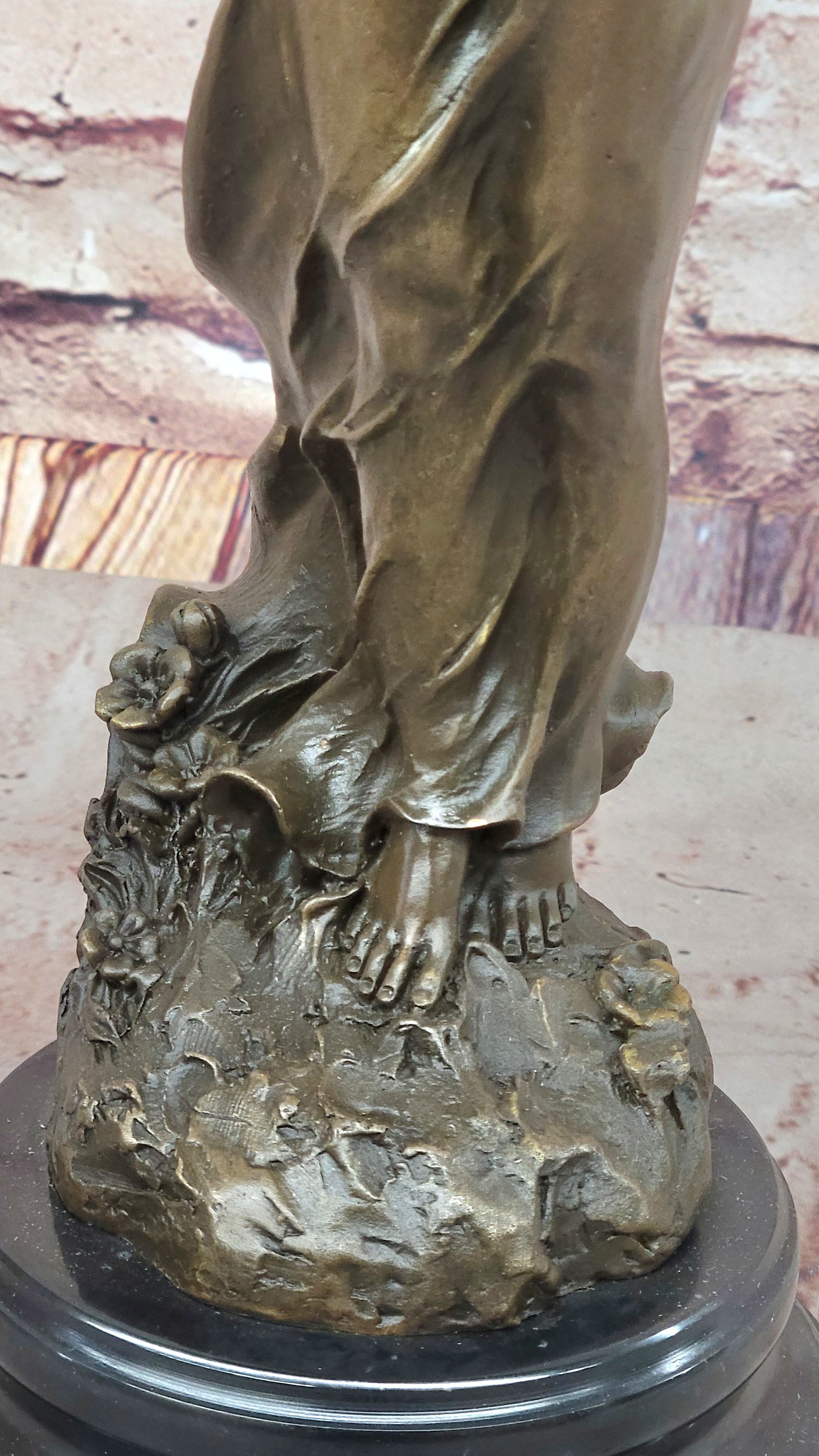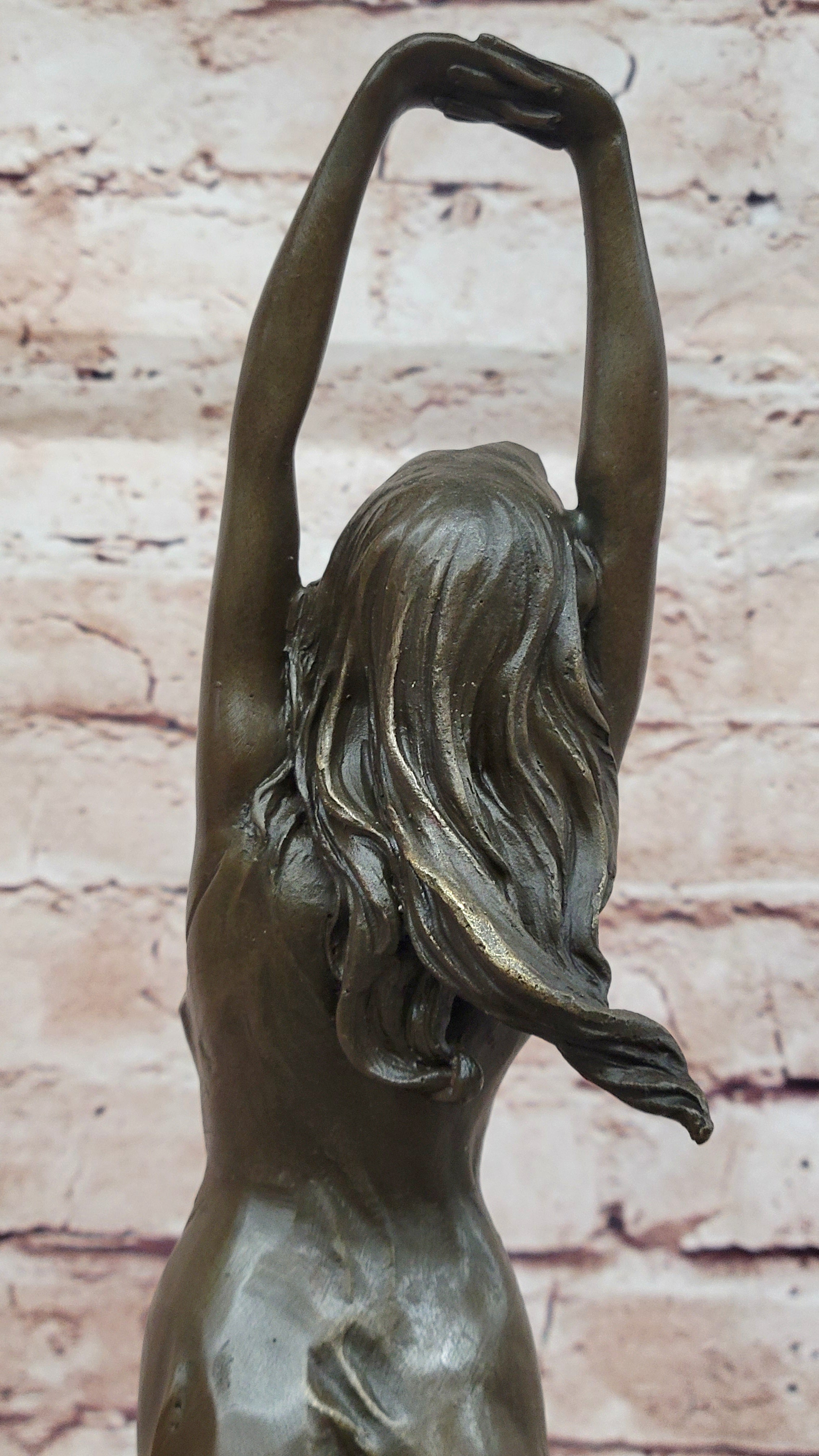 Mounted on a polished black marble base, this bronze masterpiece is not just a work of art but a timeless symbol of beauty and sensuality. Crafted using the ancient lost wax method, the sculpture showcases intricate details and a lifelike quality that will undoubtedly elevate the aesthetic appeal of any space, whether it's a business setting or a cherished spot in a home.Bronze Dimensions with Marble Base: Height 17" X Width 5.5"
