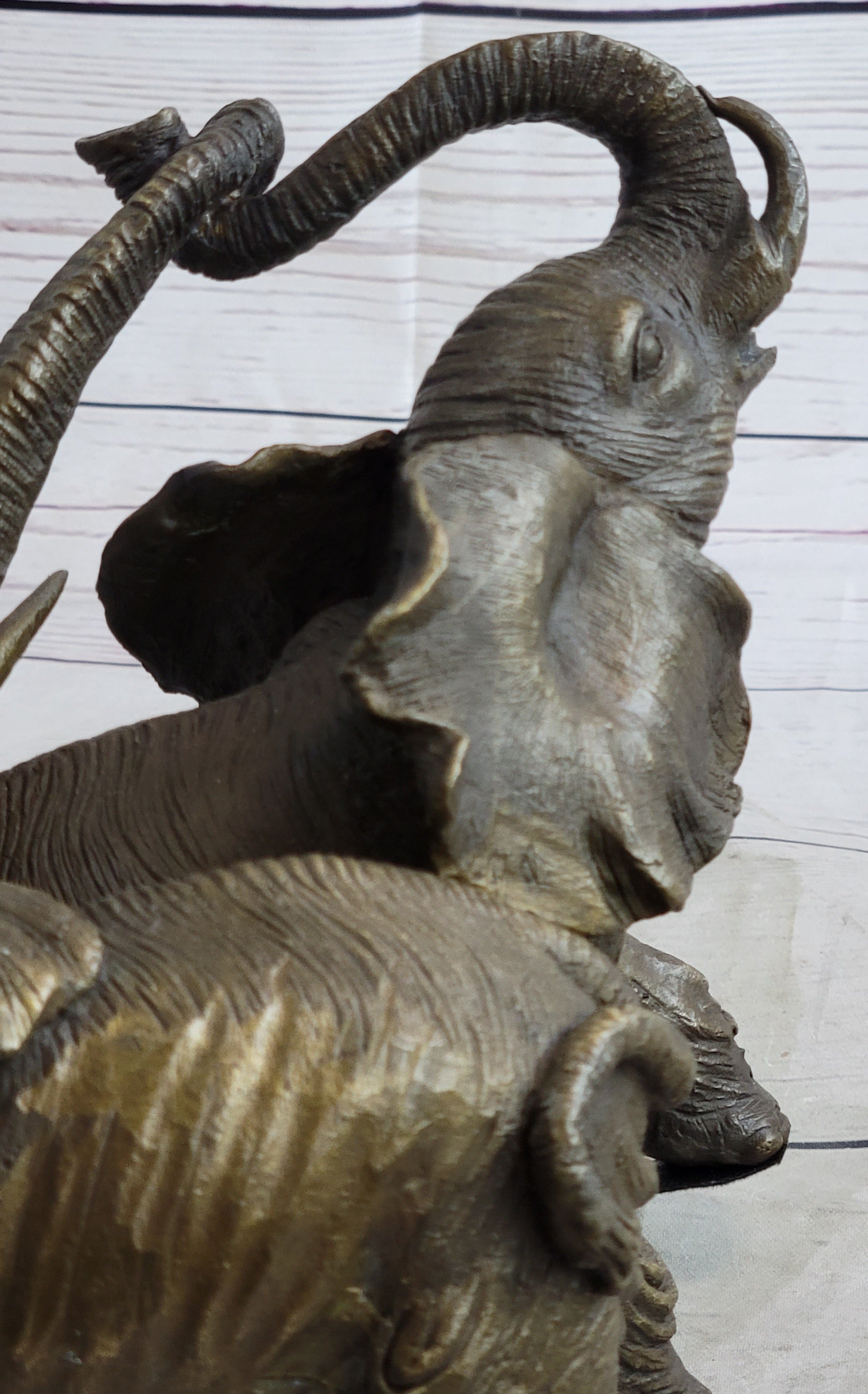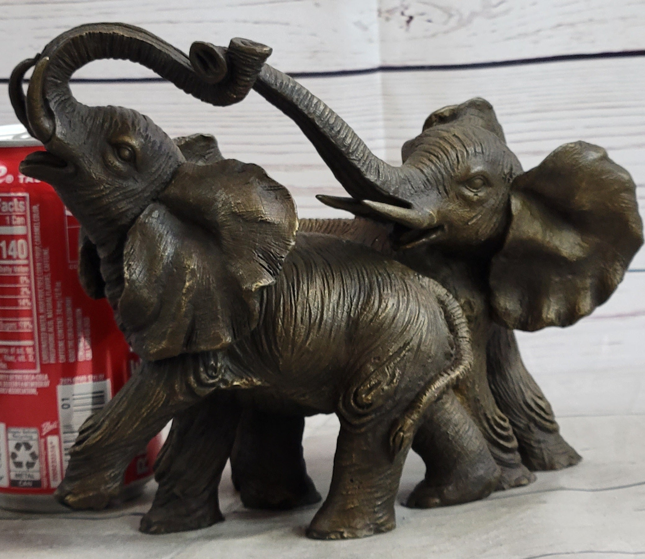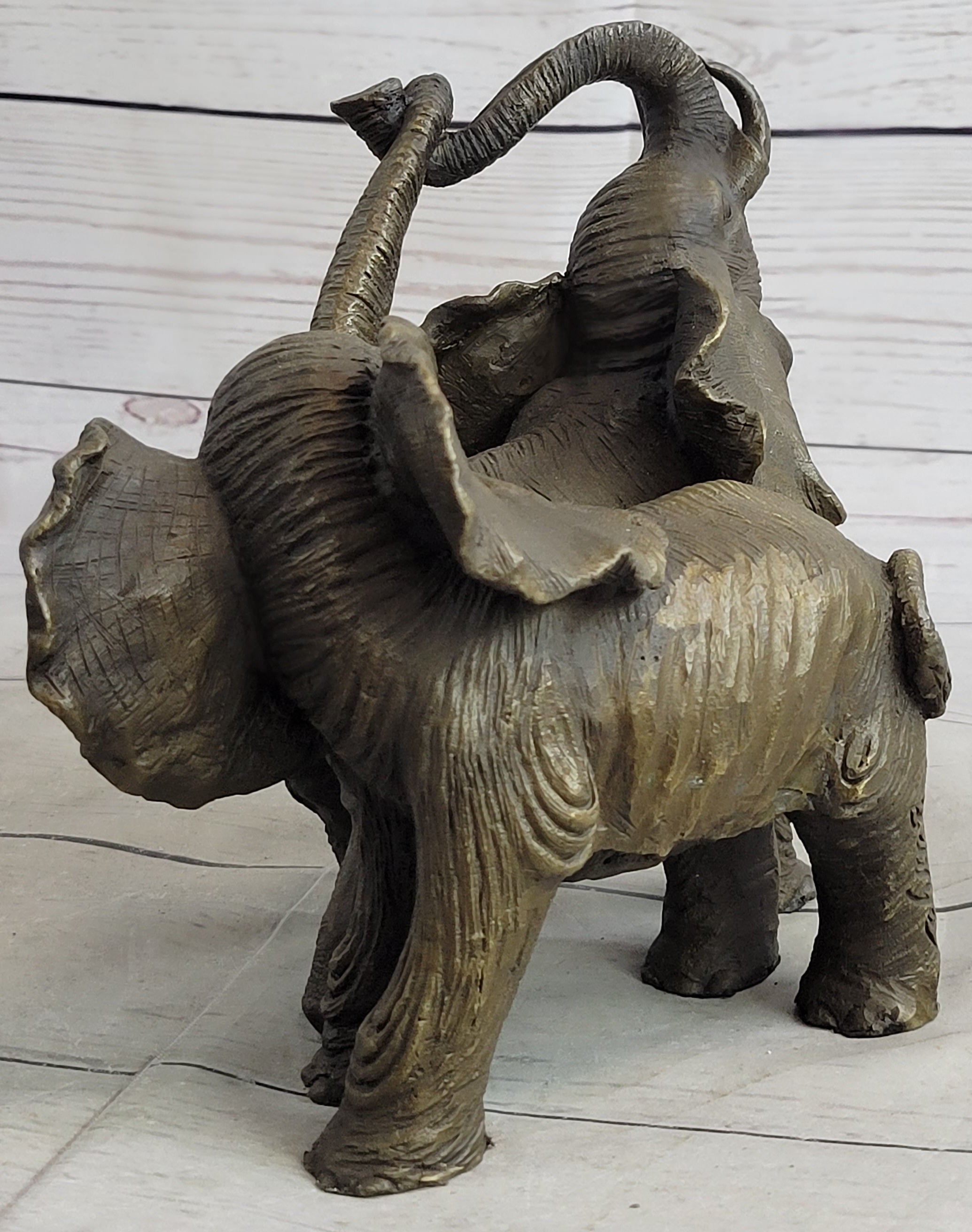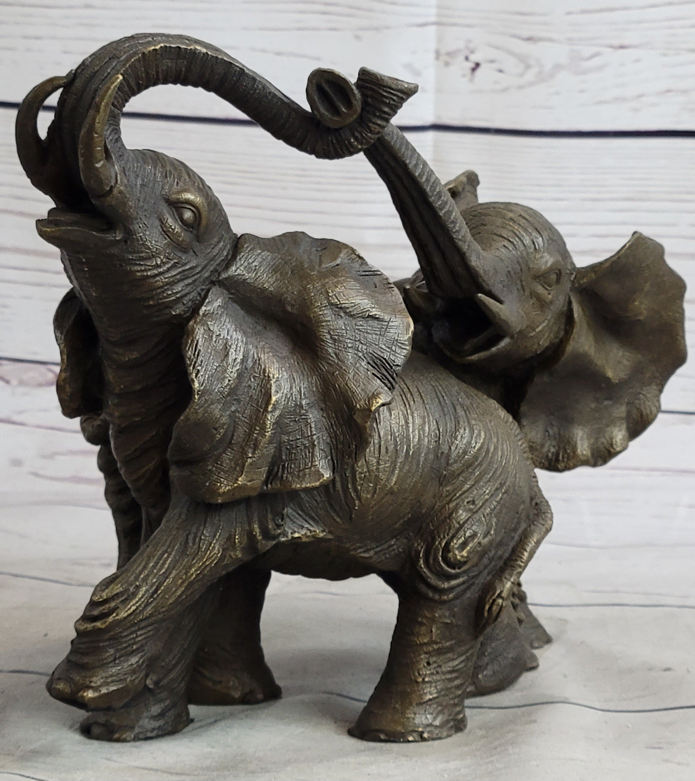 In the East, the elephant is revered as a sacred animal. In Buddhist cultures, white elephants symbolize patience and wisdom, while the Chinese view elephants as representations of energy, strength, and power. Ganesha, a Hindu deity, is depicted with an elephant's head, signifying divine wisdom and overcoming obstacles. This handmade bronze sculpture captures the majesty of these revered creatures in a poignant moment, highlighting their symbolic importance across cultures.
