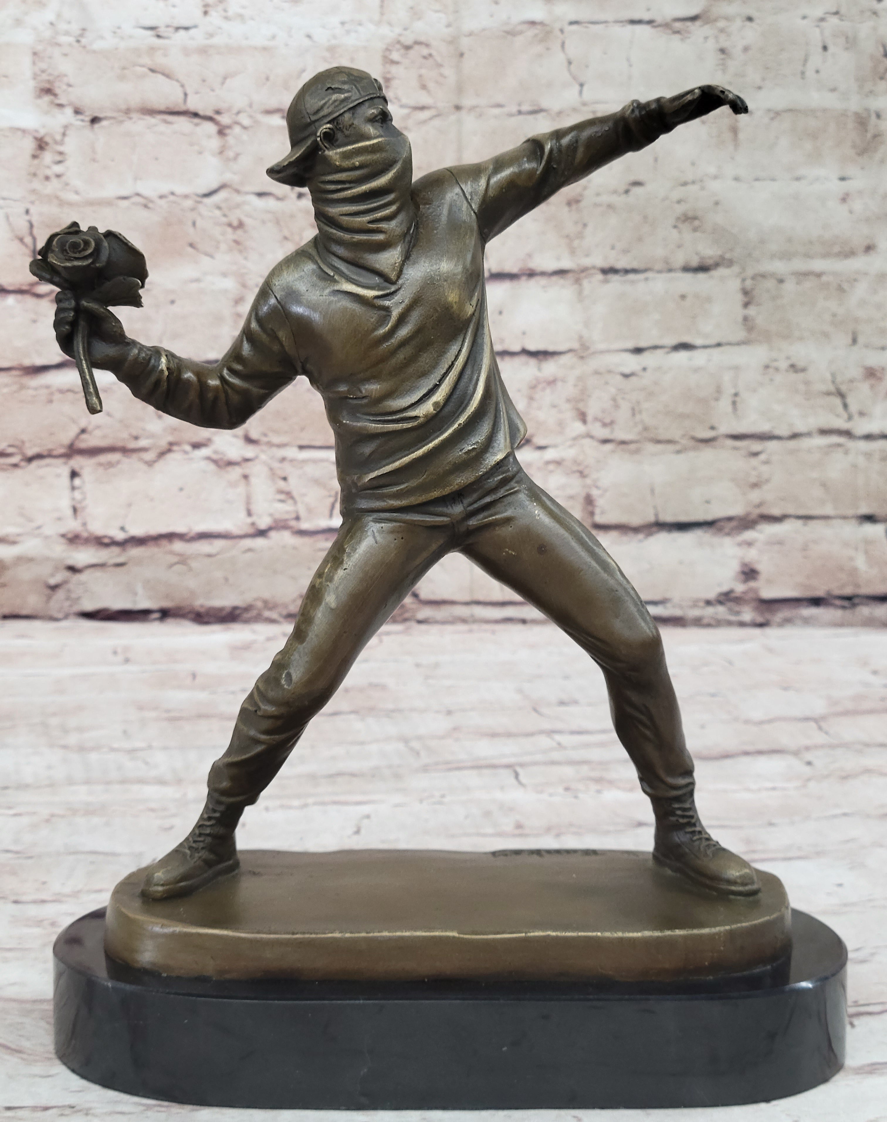 Embodying the spirit of modern urban art, this bronze piece titled "Rose Flower Thrower" encapsulates the power of art to convey nuanced narratives. The enigmatic nature of the artist only enhances the sculpture's allure, inviting viewers to engage with its meaning and symbolism. Add a touch of modern artistic expression and cultural significance to your space with this exceptional statue, a representation of the dynamic fusion between contemporary urban art and traditional sculptural technique.Bronze Dimensions with Marble Base: Height 10.5" X Width 8.5"