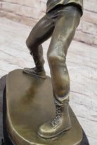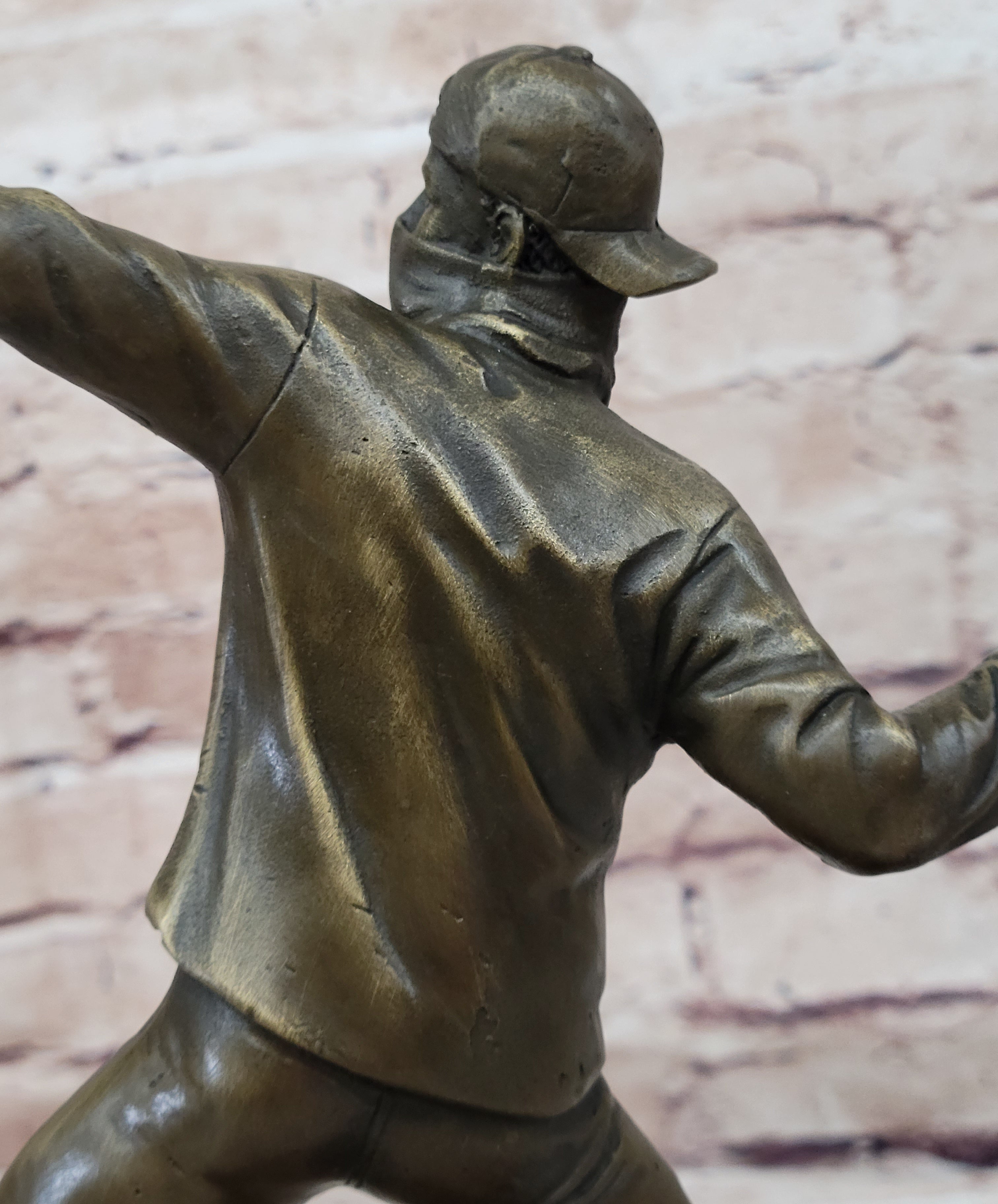 Resting atop a sleek black marble base, this sculpture stands as a testament to the fusion of contemporary urban art with traditional craftsmanship. The intricate details and lifelike textures achieved through the lost wax method showcase the artist's dedication to their craft. The sculpture is adorned with a rich brown patina, adding depth and character to the artwork's appearance.