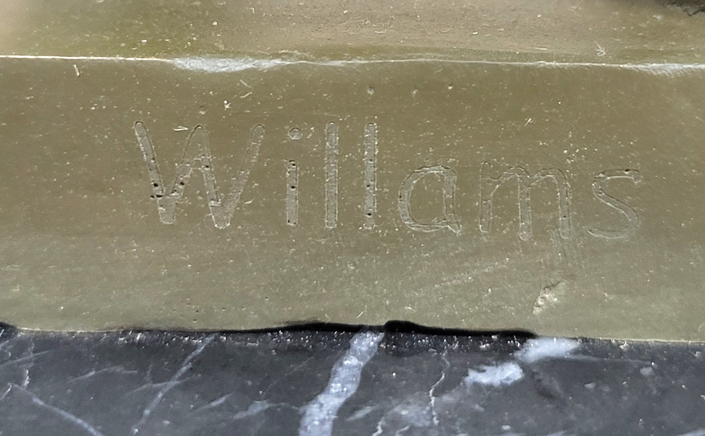 The sculpture is mounted on a solid black marble base, providing a striking contrast to the bronze and giving the figure a grounded presence. Signed by the artist Williams, this piece is a unique blend of art, humor, and musical spirit — perfect for collectors or anyone with a love for animals and jazz.Bronze Dimensions with Marble Base: Height 8.5" X Width 5.5"