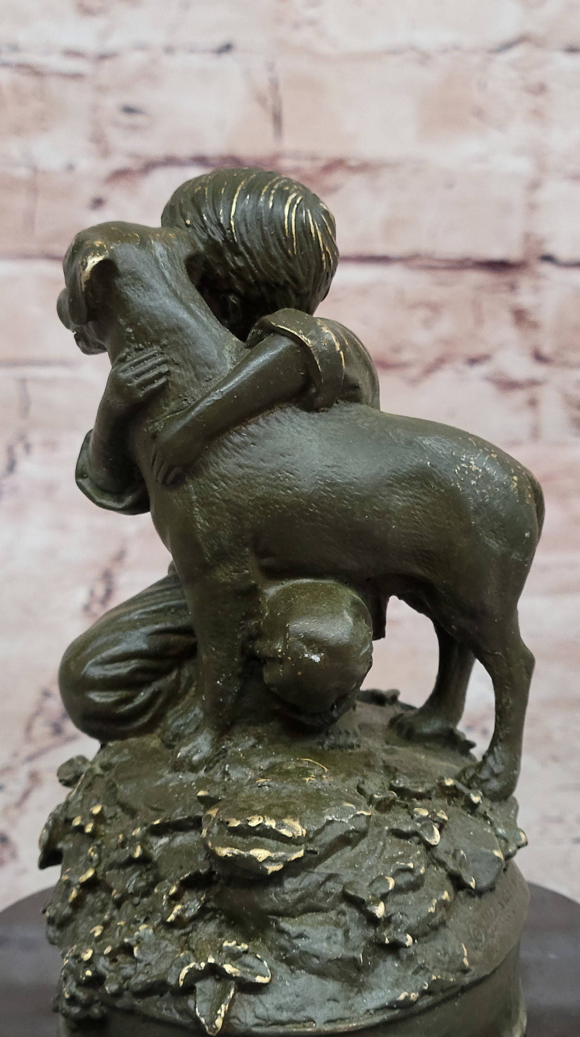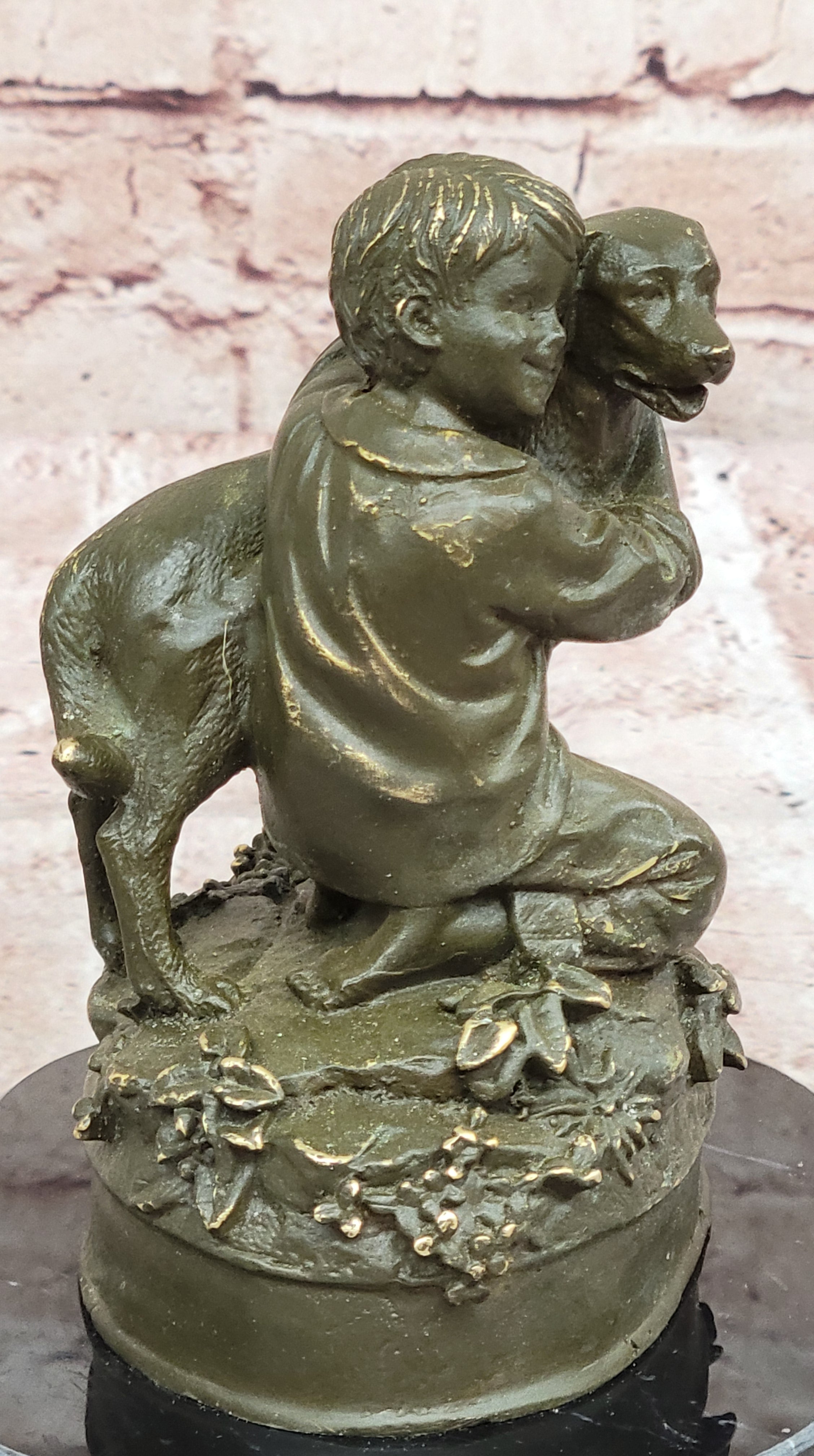 Expertly handcrafted using the traditional lost wax method, this sculpture is made from 100% genuine bronze and finished with a rich brown patina that highlights its finely rendered details. From the boy’s gentle expression to the textured fur of the dog, every element of this piece is brought to life with meticulous craftsmanship. The statue is securely mounted on a polished black marble base, providing a striking contrast and elegant presentation.