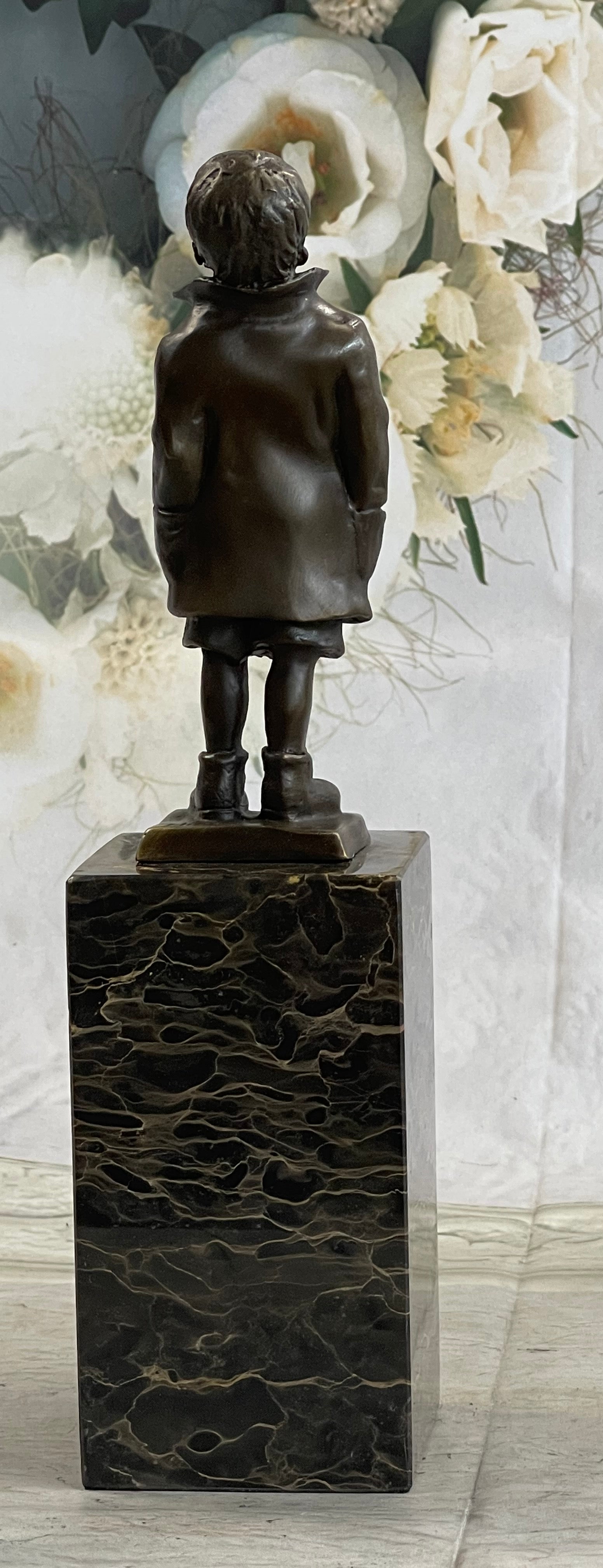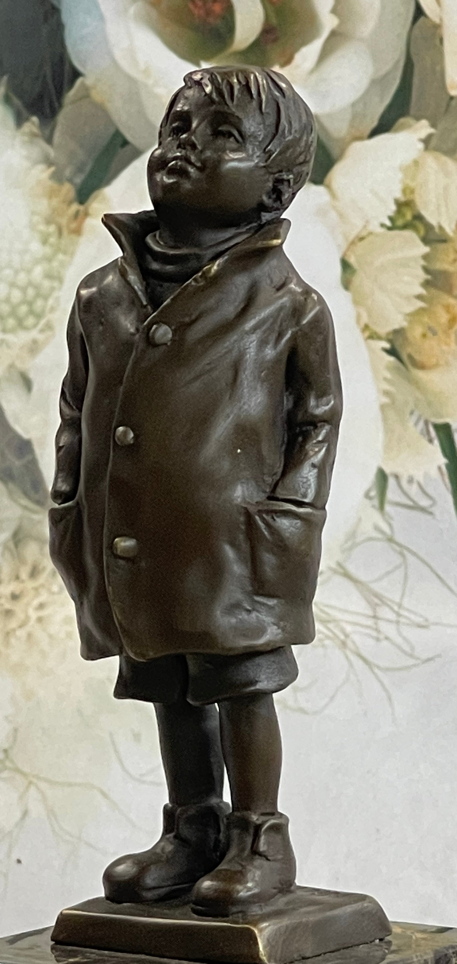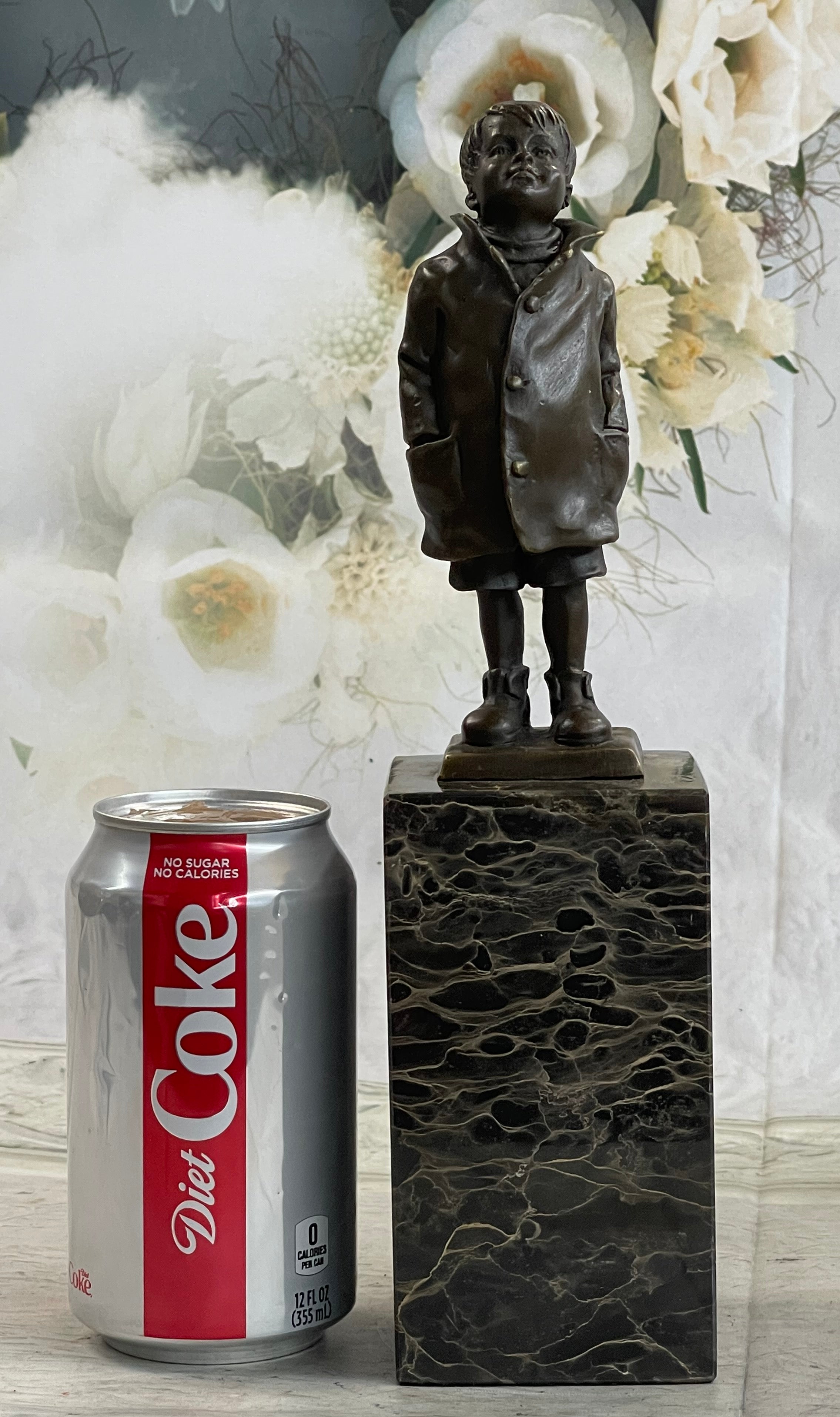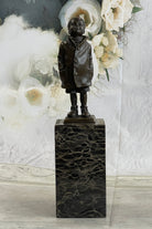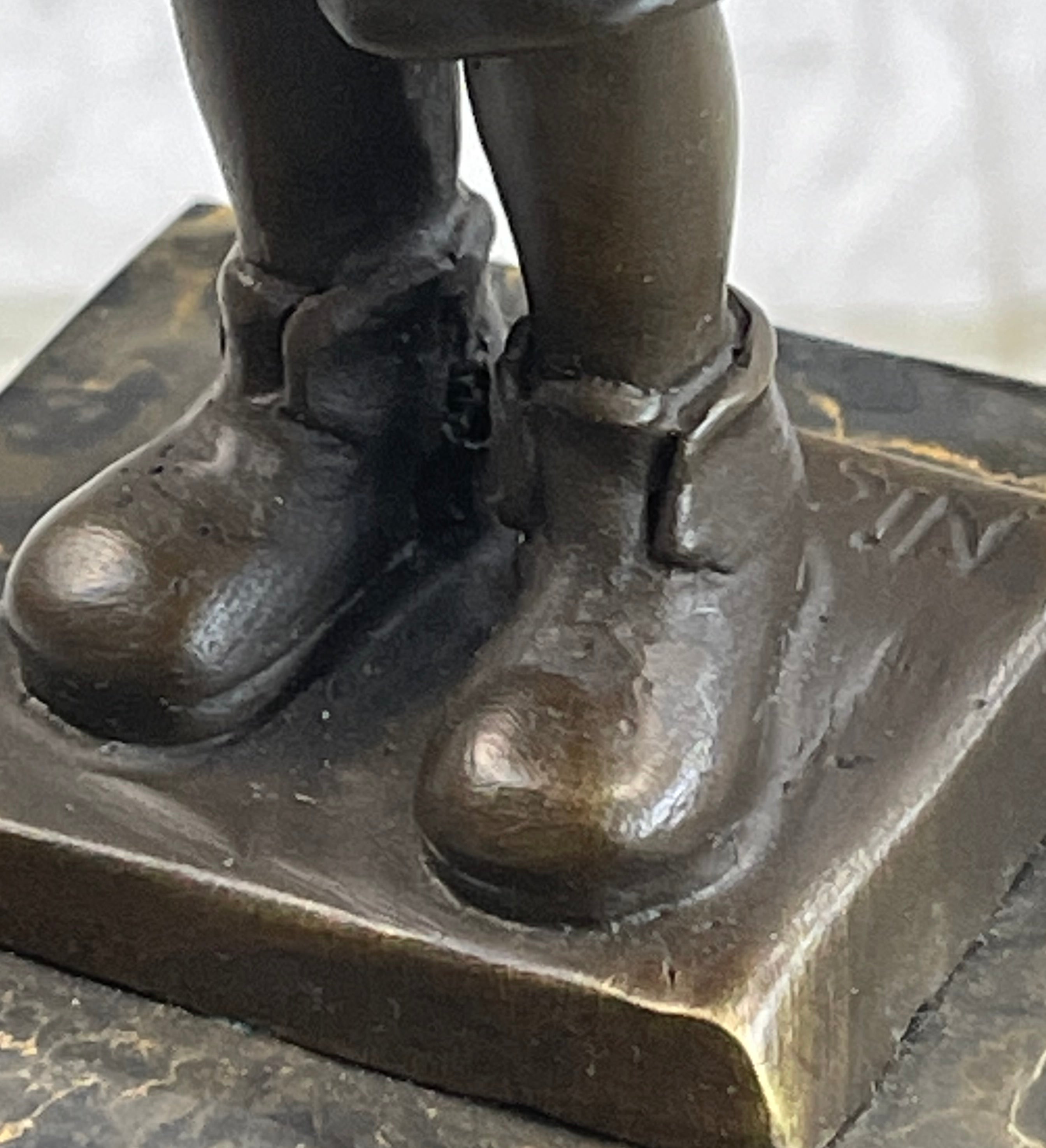 Mounted on a marble base, this charming sculpture is signed by the artist Nick, ensuring its authenticity and artistic value. Perfect for adding a touch of nostalgia and charm to any space, this piece is a timeless tribute to the simple pleasures of life.Bronze Dimensions with Marble Base: Height 11" X Width3" Marble Dimensions:3" X 3"