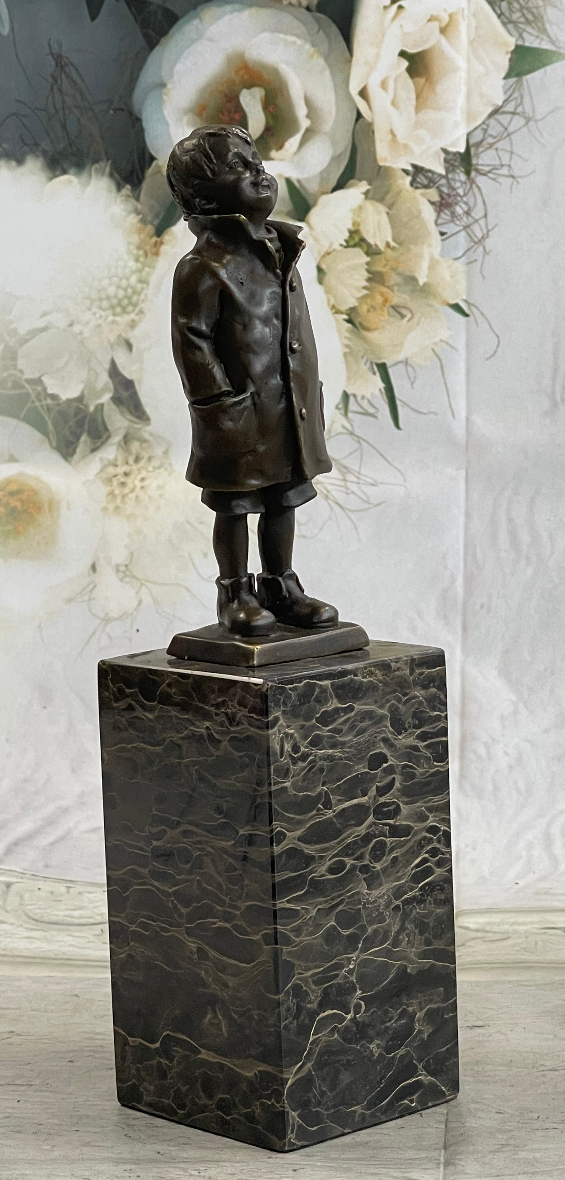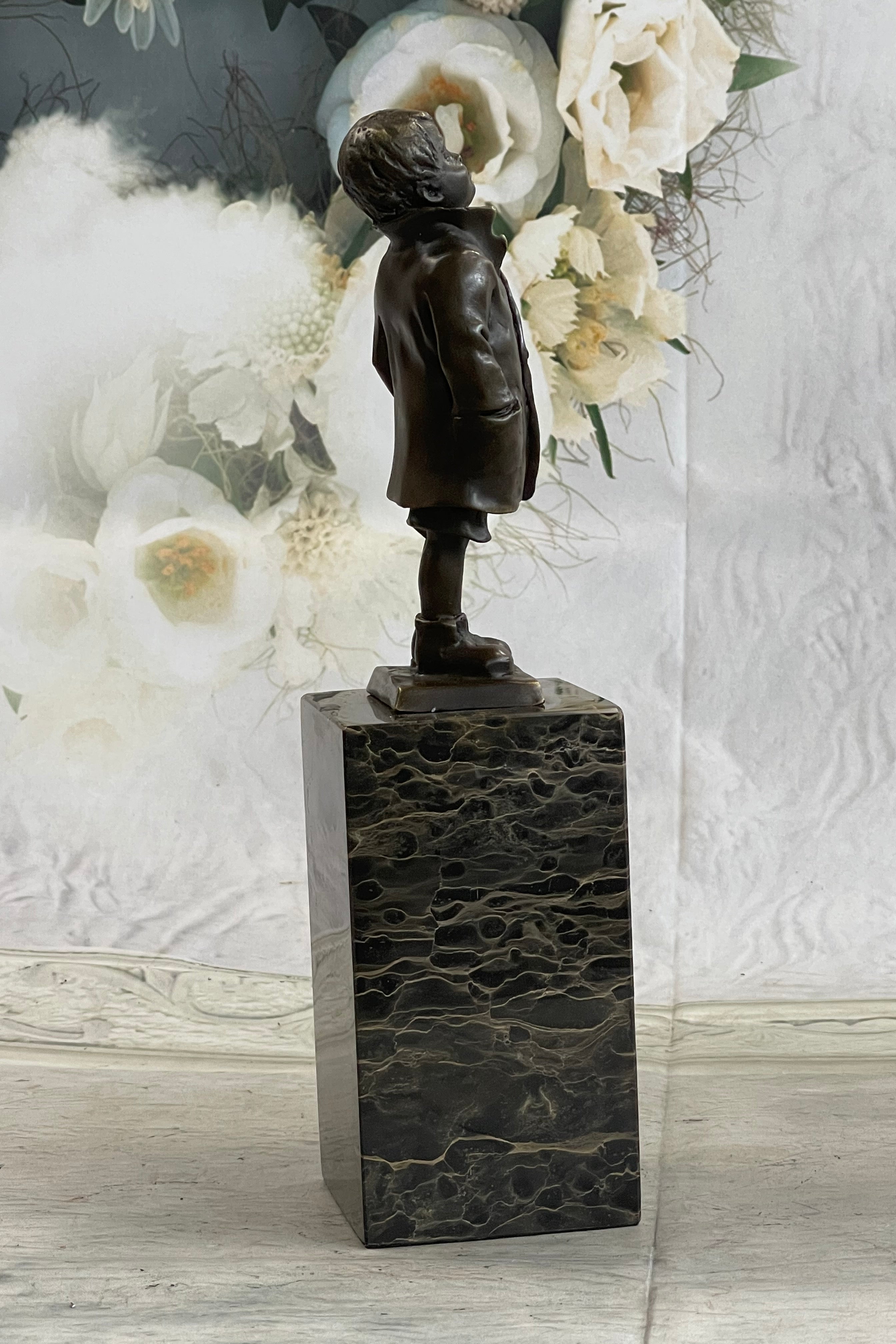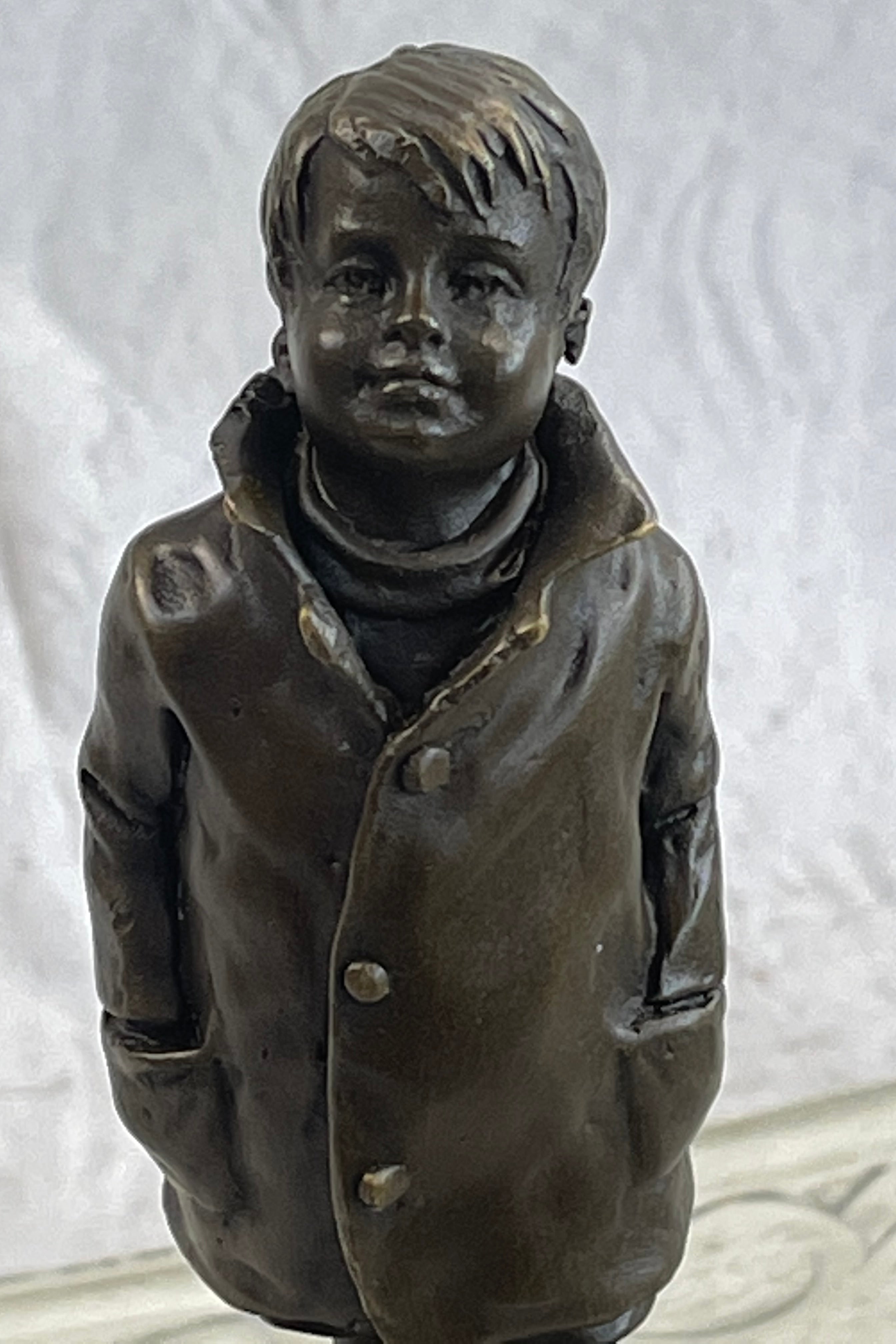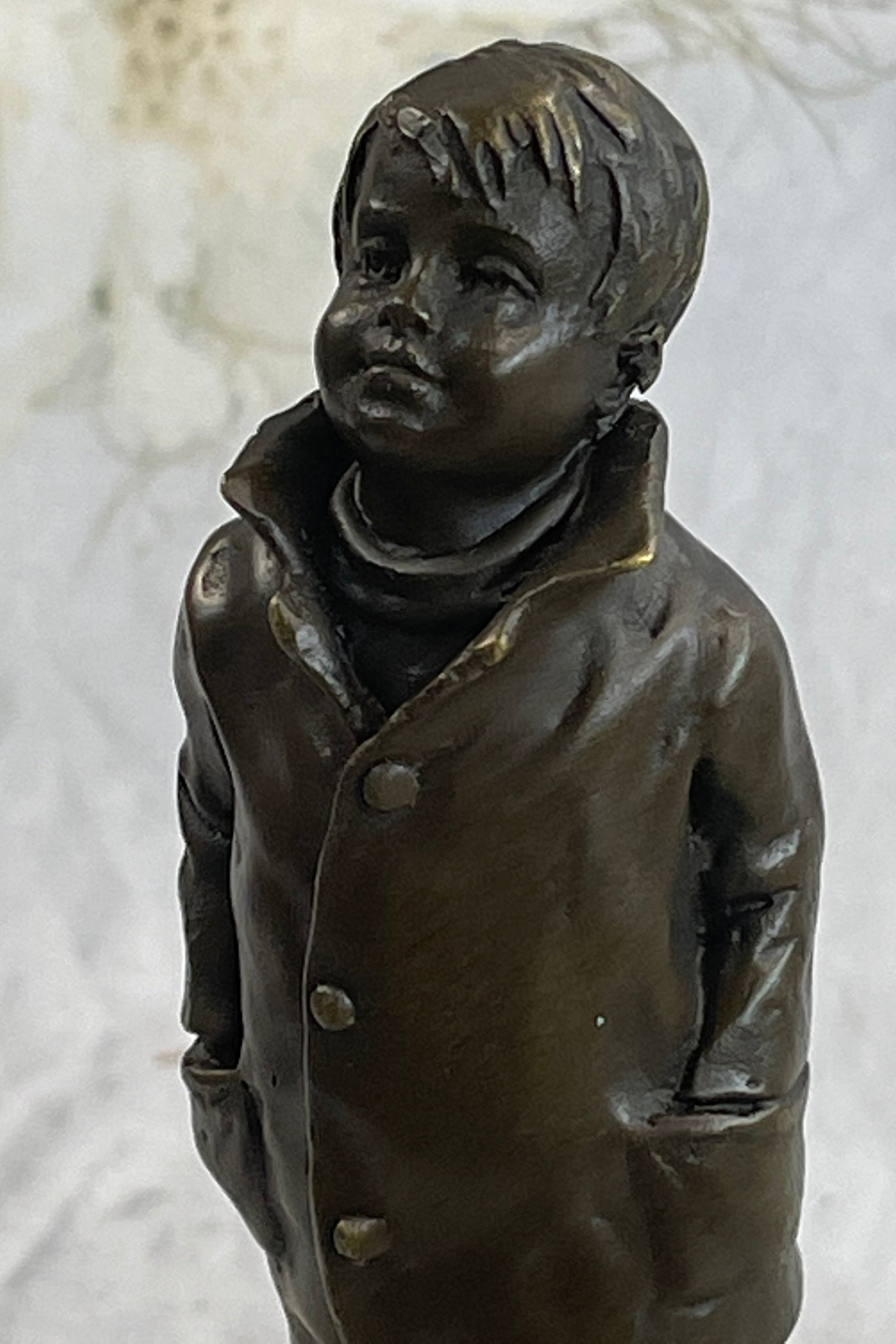 Mounted on a marble base, this charming sculpture is signed by the artist Nick, ensuring its authenticity and artistic value. Perfect for adding a touch of nostalgia and charm to any space, this piece is a timeless tribute to the simple pleasures of life.Bronze Dimensions with Marble Base: Height 11" X Width3" Marble Dimensions:3" X 3"