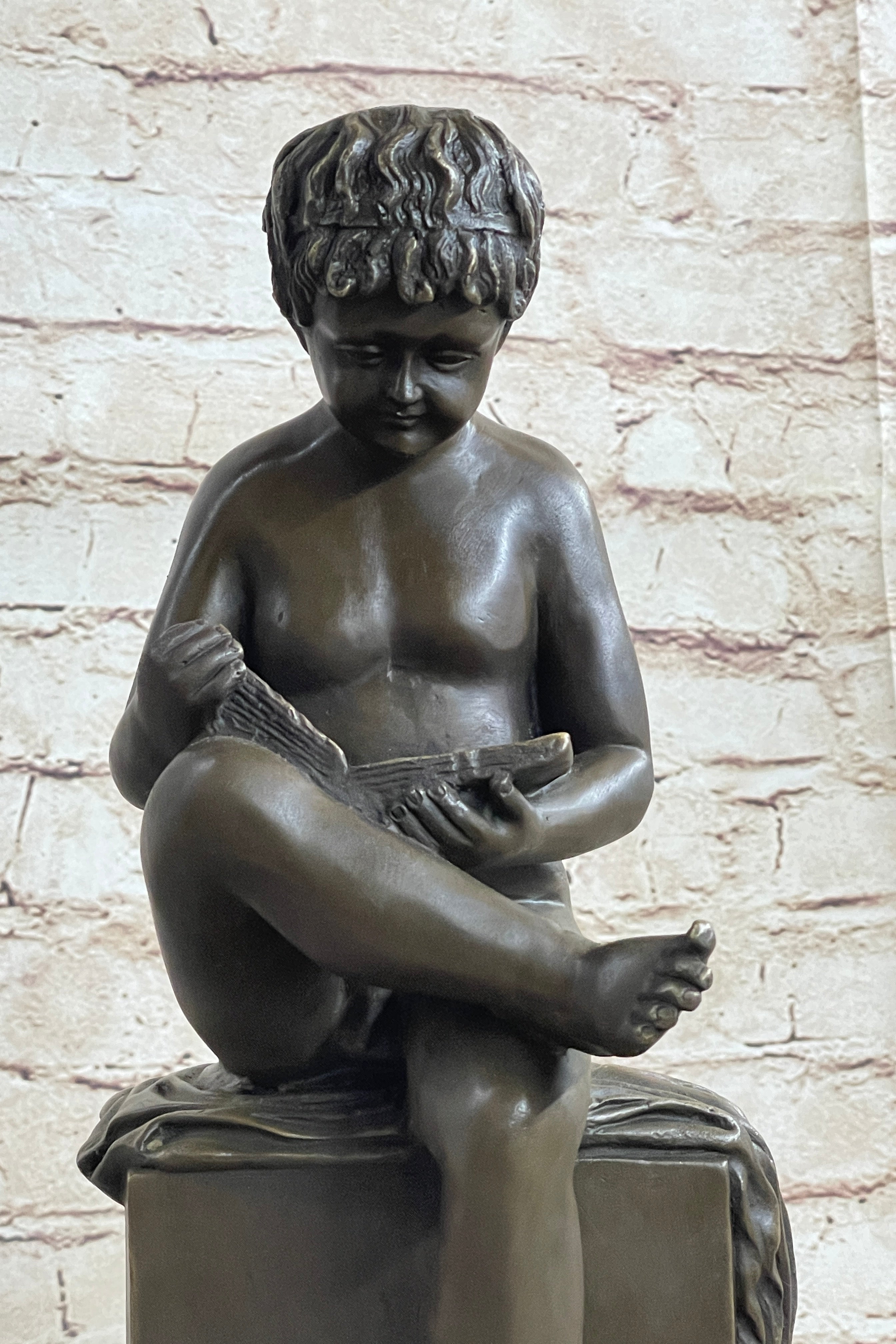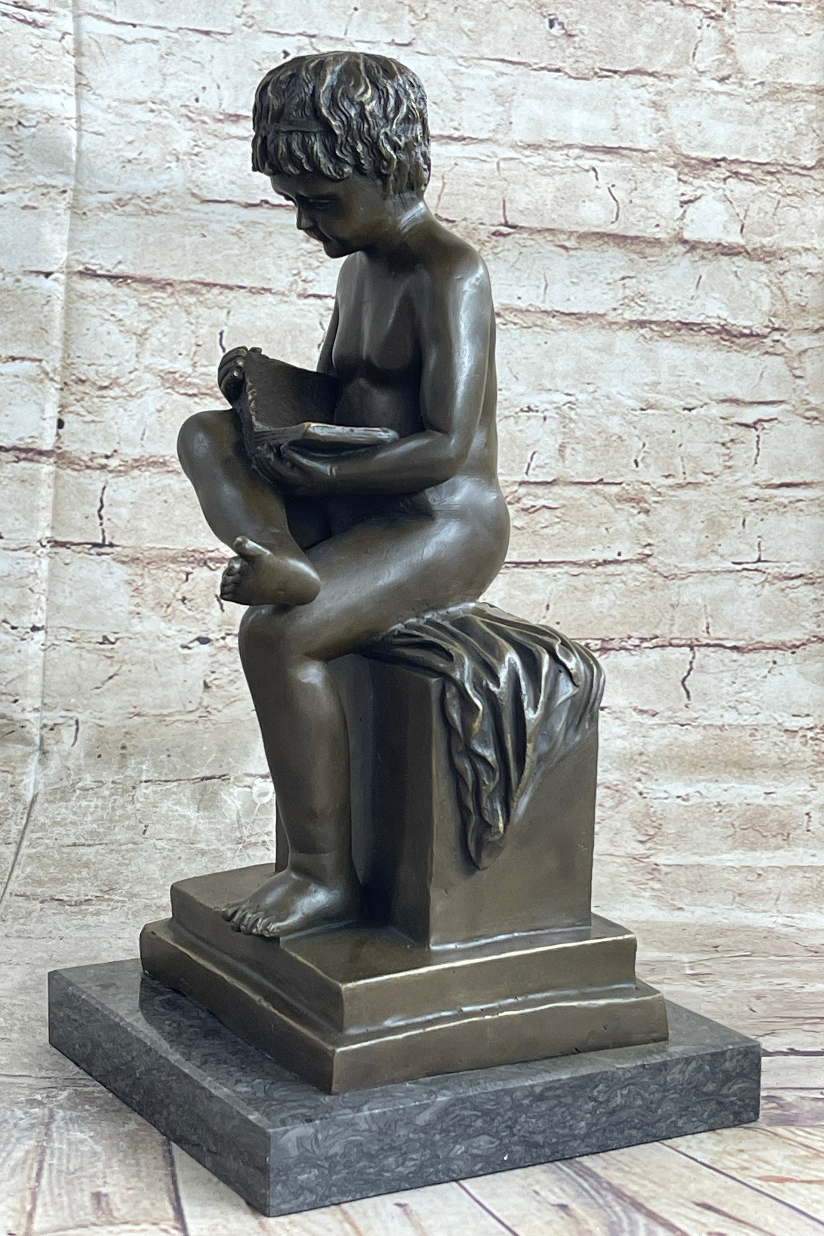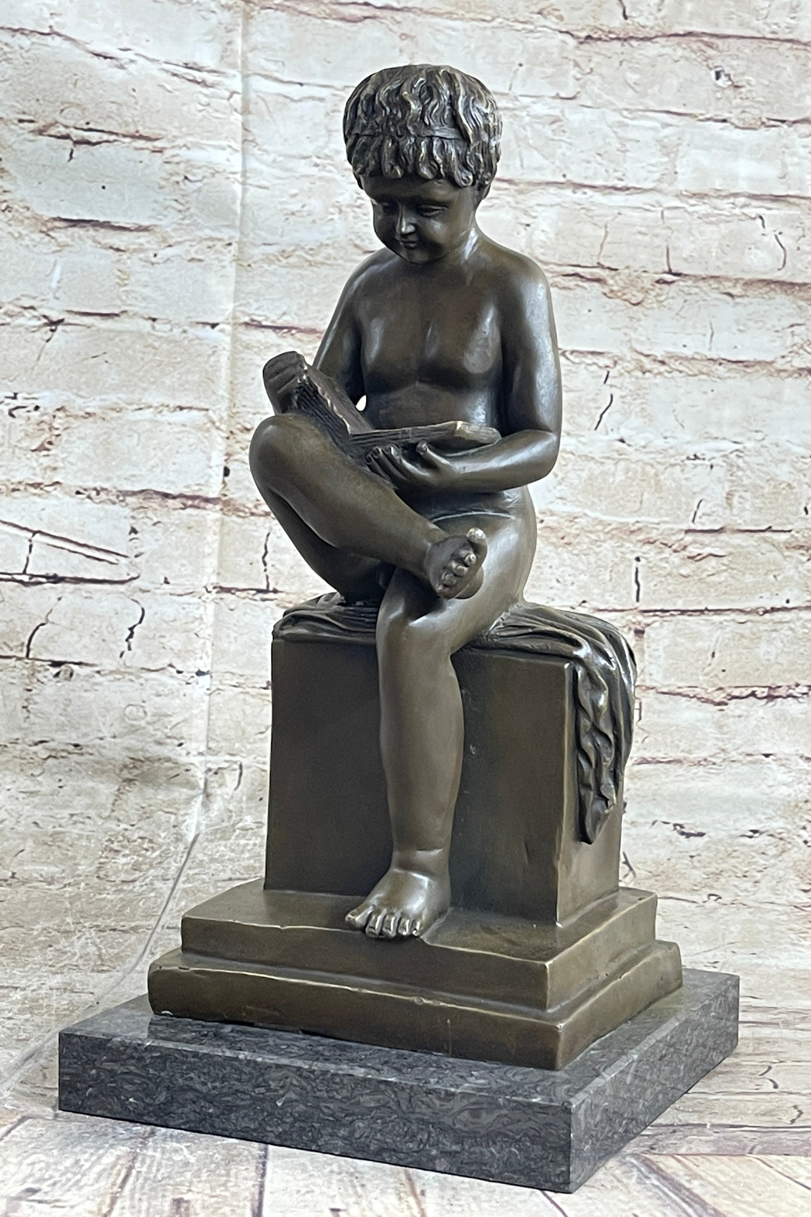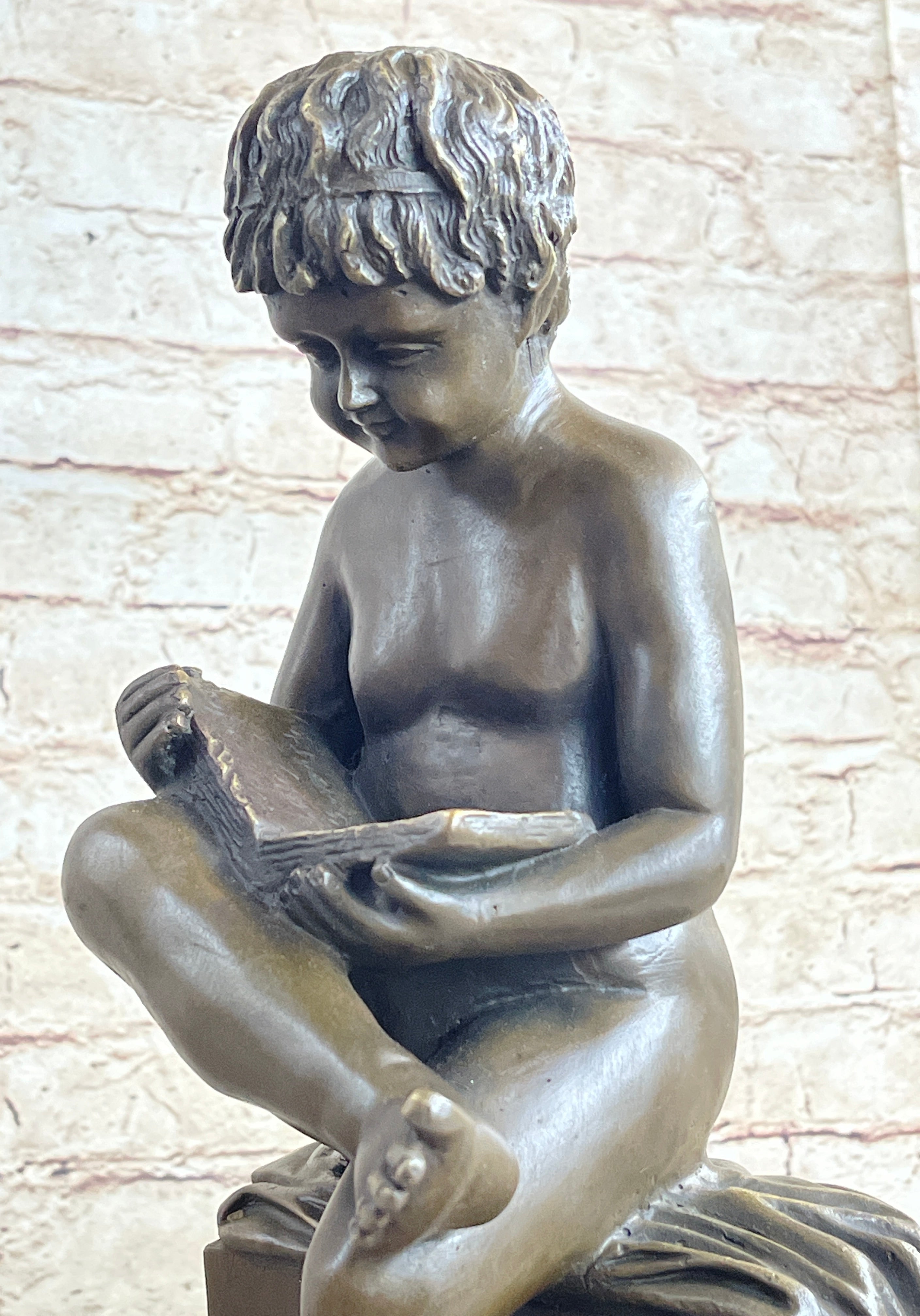 Boy Reading a Book - Bronze Sculpture Statue Original Signed Art on Marble Base