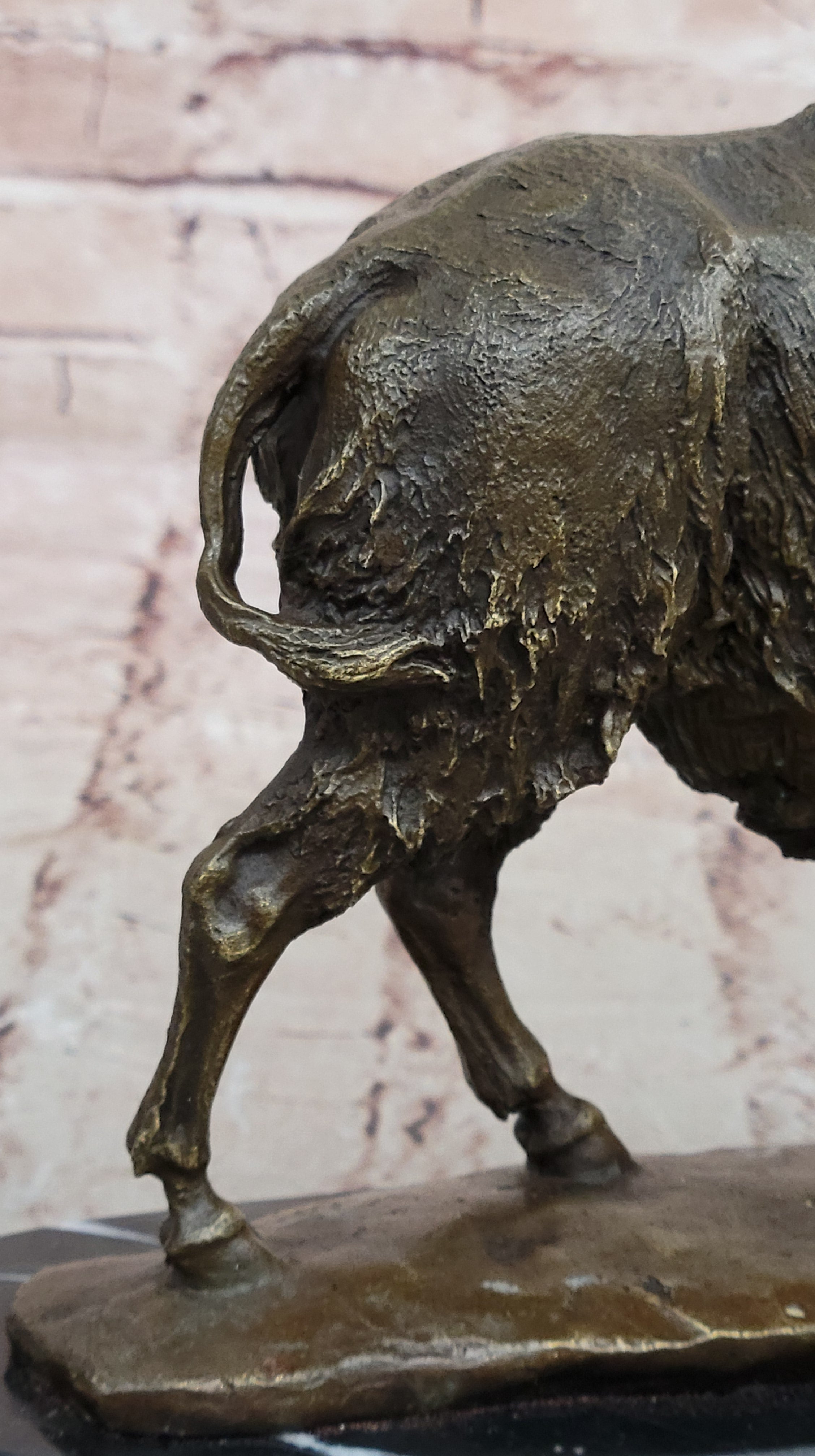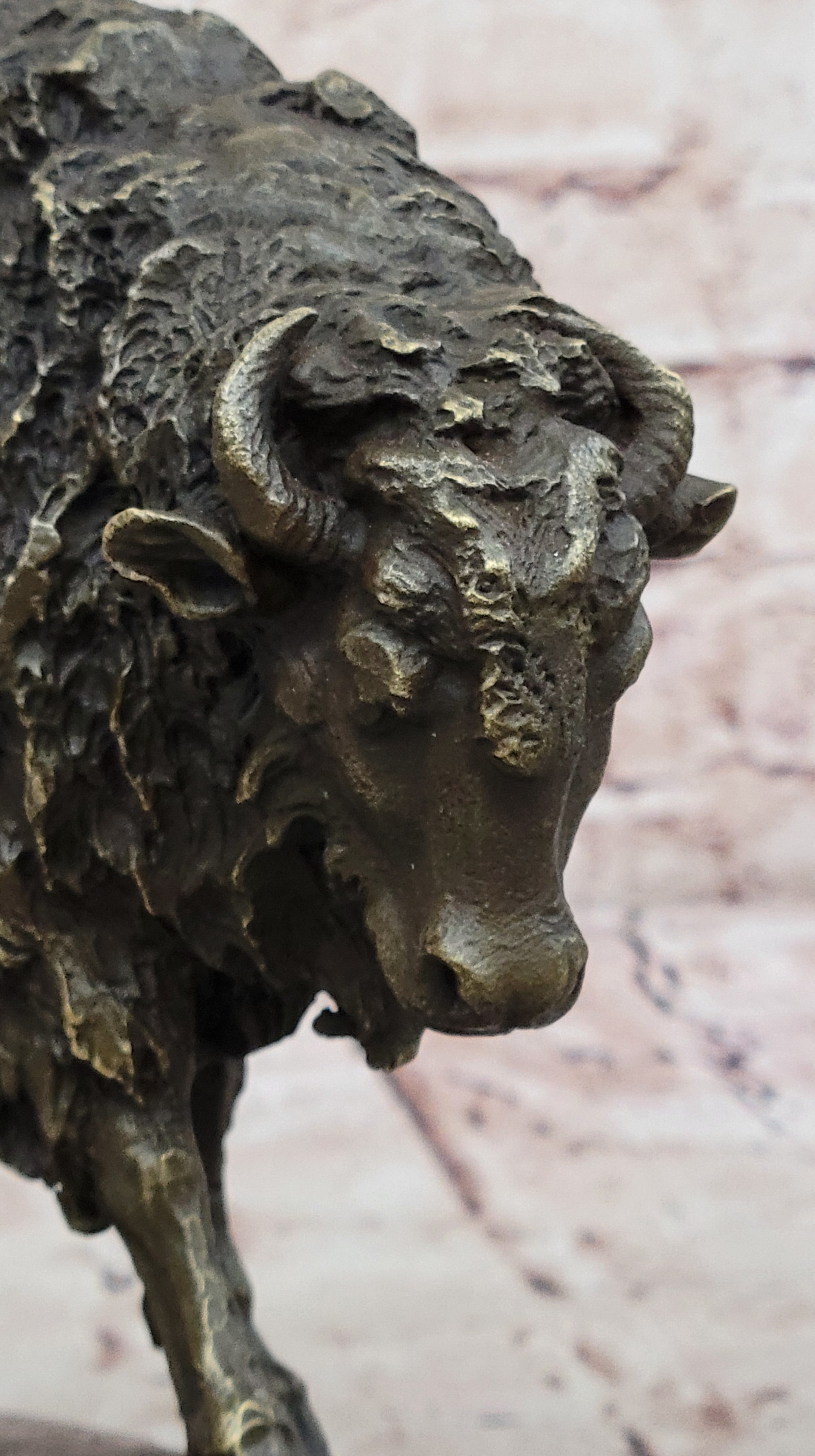 Whether displayed in a home, office, or gallery, this bronze sculpture serves as a powerful symbol of strength, resilience, and cultural significance. Its depiction of the buffalo's majesty and symbolism makes it a captivating addition to any art collection, inviting viewers to connect with the natural world and appreciate the timeless beauty of this iconic animal.Bronze Dimensions with Marble Base: Height 7" X Width 10"