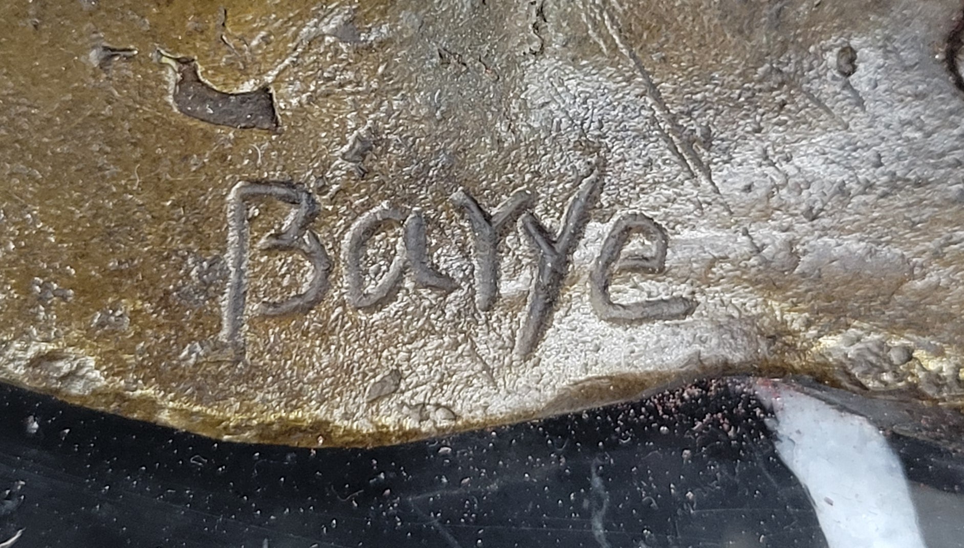 Crafted using the archaic methods of lost-wax casting, this sculpture showcases the artist's skill and dedication to preserving traditional craftsmanship. The brown patina finish enriches the details of the sculpture, highlighting the textures and nuances of the buffalo's coat. Mounted on a black marble base and bearing the signature of the artist Barye, this piece not only reflects artistic excellence but also carries a sense of quality and prestige.
