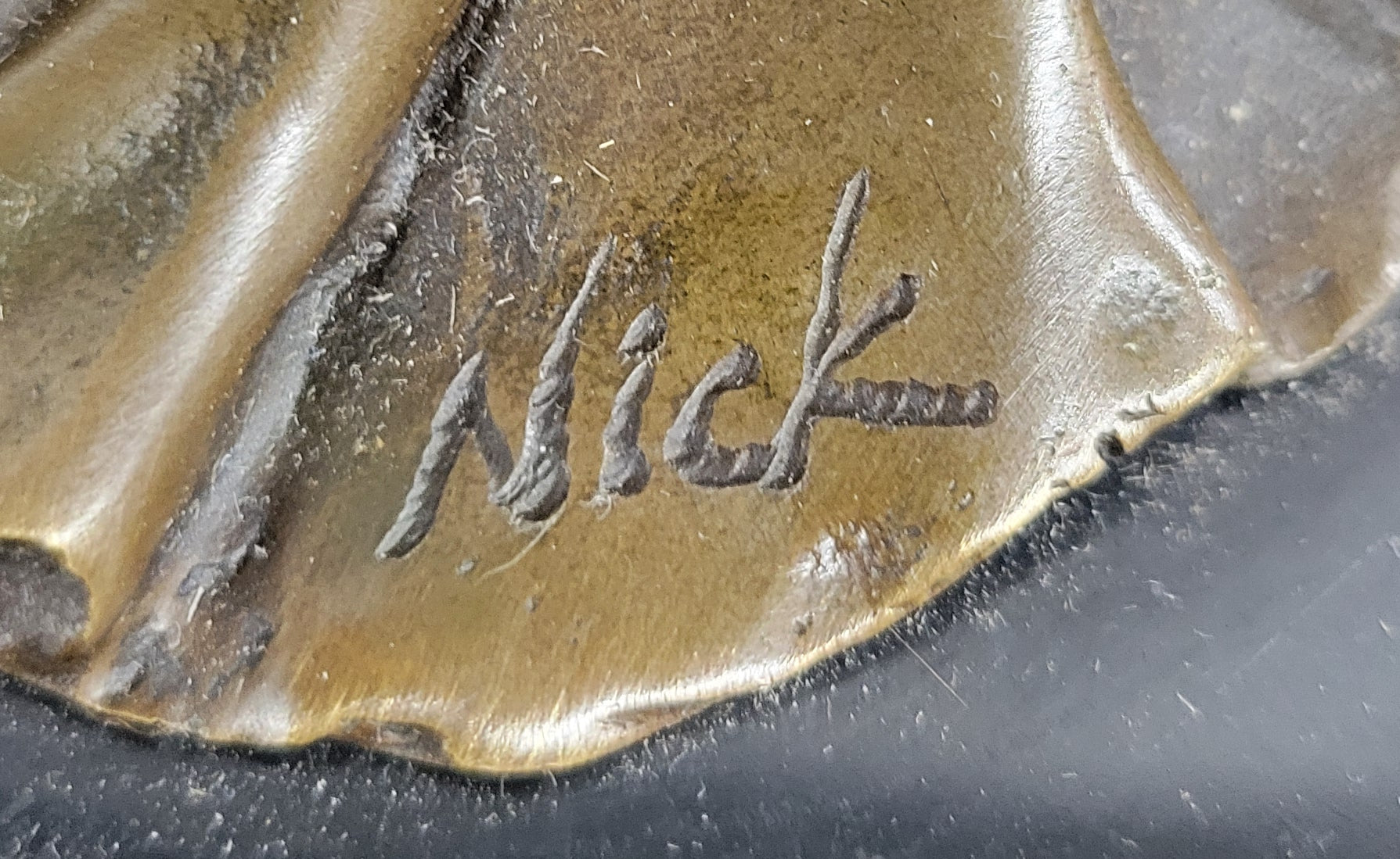 Mounted on a marble base, the sculpture becomes a poignant representation of the artistic process and the intimate connection between the artist and the muse. The artist's signature, Nick, not only identifies the creator but also adds a personal touch to the artwork. This sculpture invites viewers to appreciate the simplicity and beauty of the human form and the unique relationship between the artist and the subject in the act of creation.Bronze Dimensions with Marble Base: Height 7" X Width 6.5"