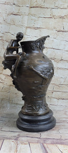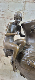 Elevate your home decor with this exquisite bronze vase that commands attention and admiration in any room. This captivating piece features a nude woman gracefully perched high on the edge of water, while her partner swims alongside her. His outstretched hand beckons her to join in their aquatic embrace.