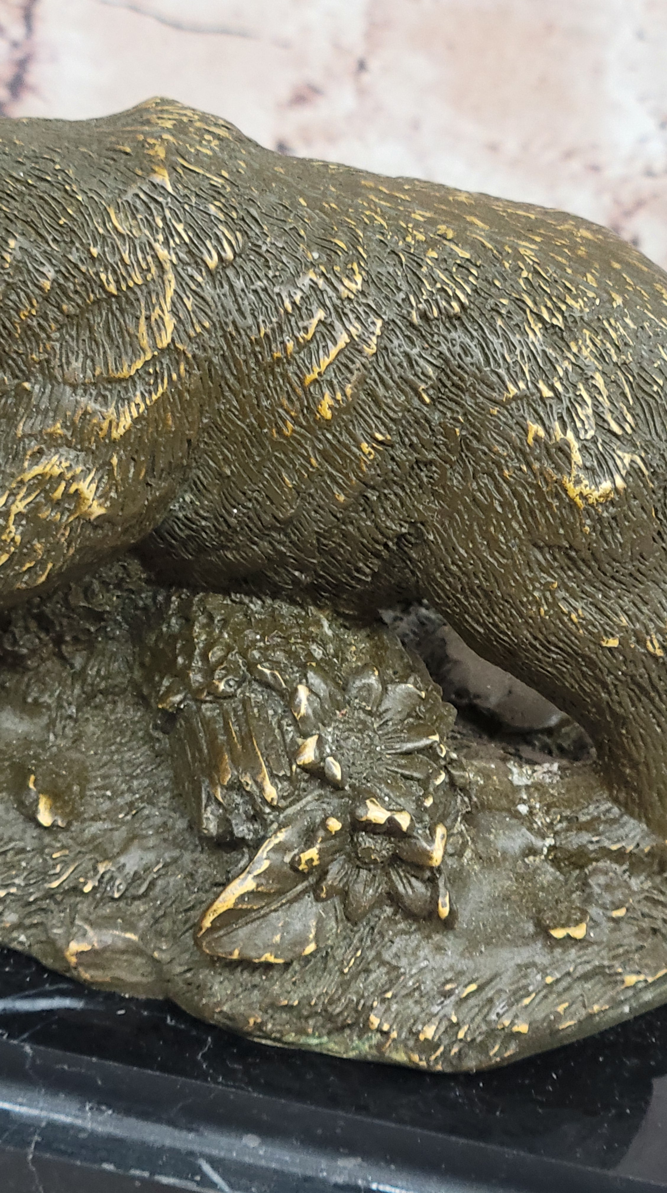 Mounted on a black marble base and signed by Barye, this timeless sculpture is a tribute to nature's bond and a perfect centerpiece for wildlife art collectors and lovers of fine bronze craftsmanship.Bronze Dimensions with Marble Base: Height 5" X Width 6"