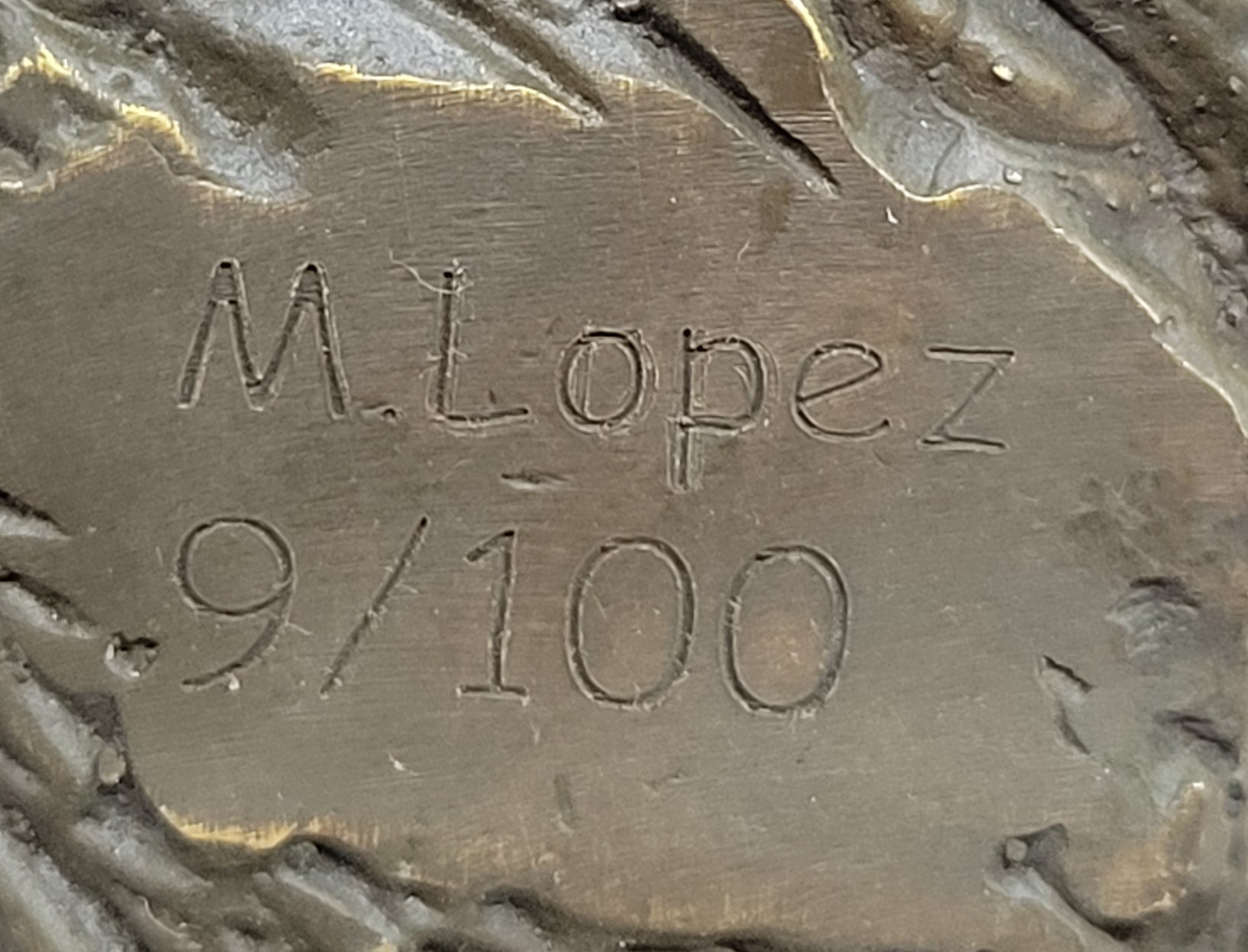 Signed by M. Lopez, also known as Milo, and presented as a limited edition, this piece is mounted on a smooth black marble base for added elegance and stability. Whether displayed in a garden, foyer, or on a porch, this sculpture brings rustic charm and artistic craftsmanship together in a heartwarming collectible.Bronze Dimensions with Marble Base: Height 12" X Width 6"