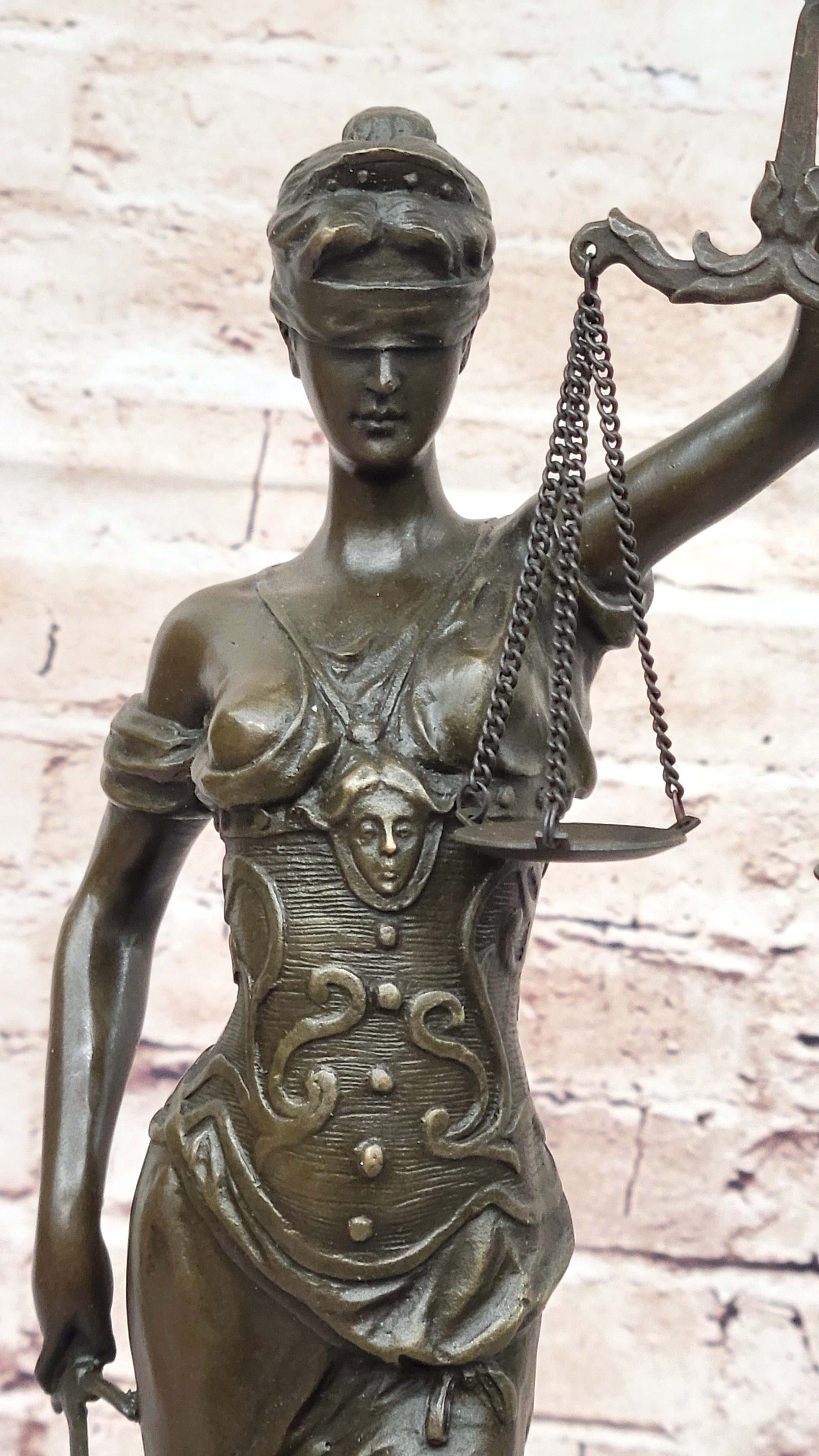 In one hand, the statue firmly grasps a sword, representing the power necessary for delivering justice. In the other, the scales of justice hang delicately from metal chains, symbolizing the impartial weighing of evidence and the careful balance required in legal proceedings. Adhering to tradition, the statue is blindfolded, ensuring that judgment is based solely on merit and devoid of prejudice.