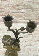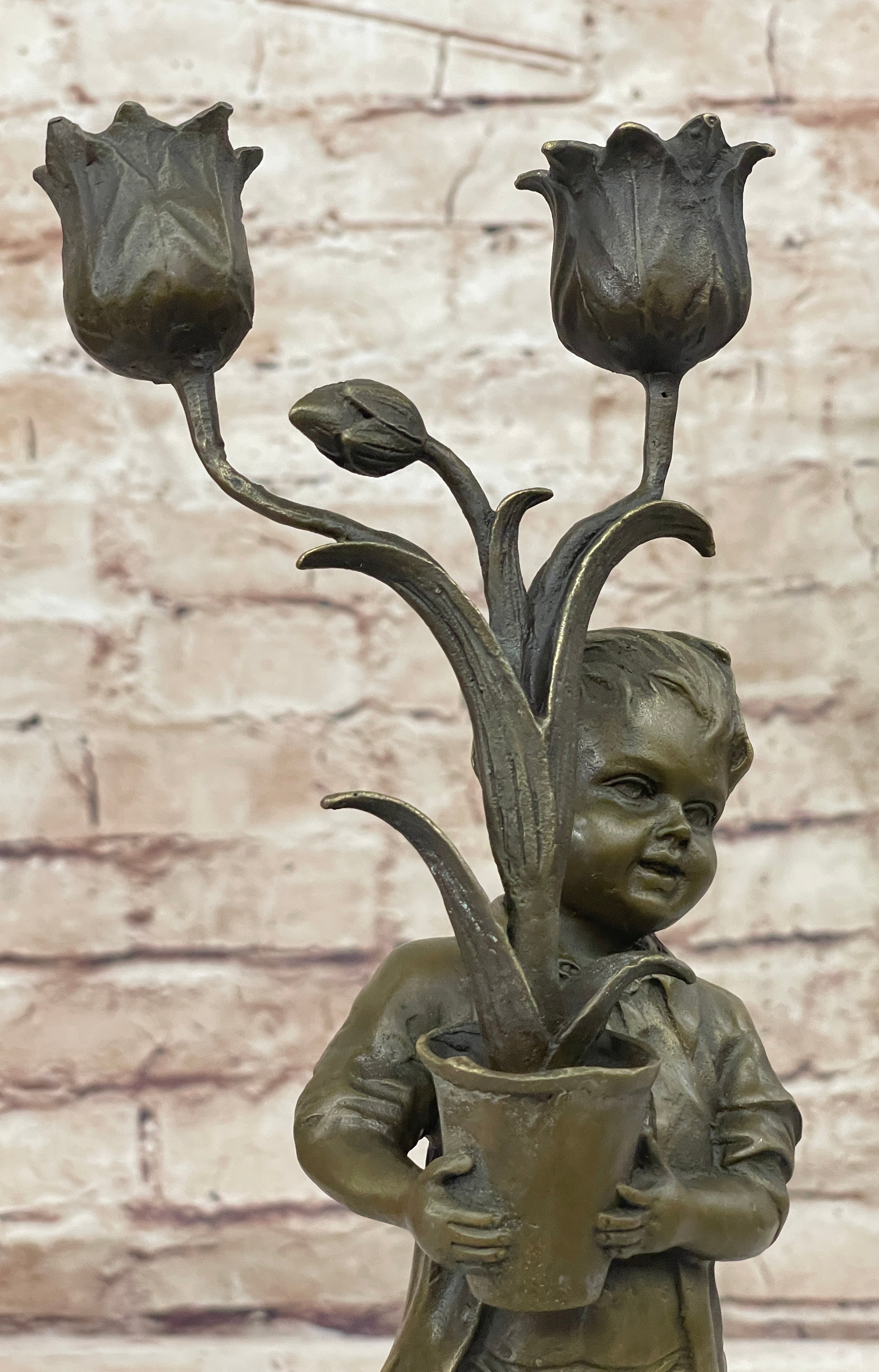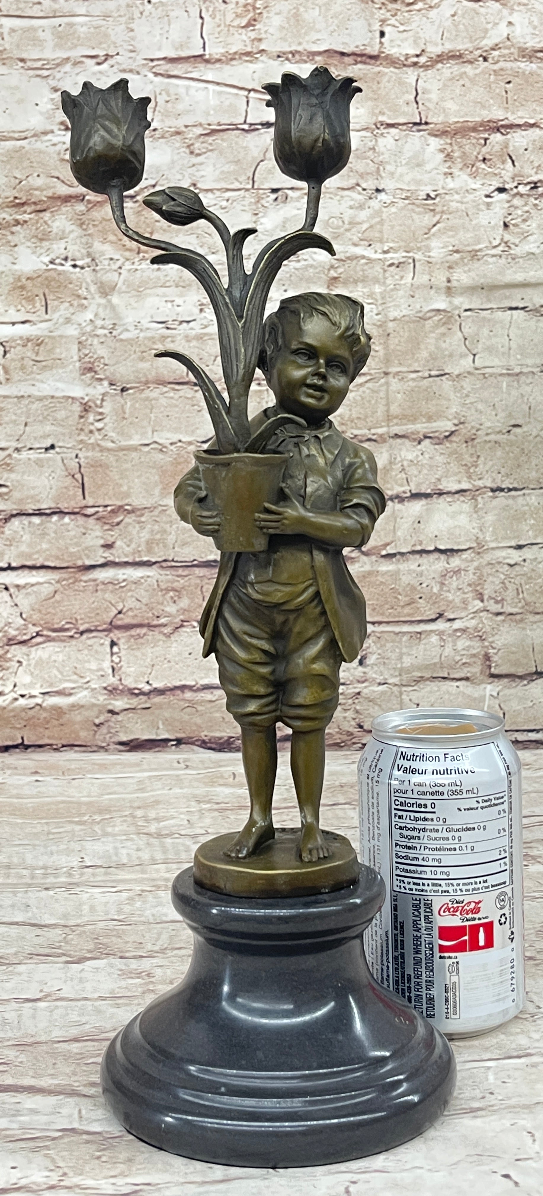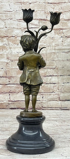 Bronze Boy Holding Flower Pot Candelabra Candle Holder Sculpture on Marble Base