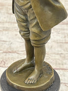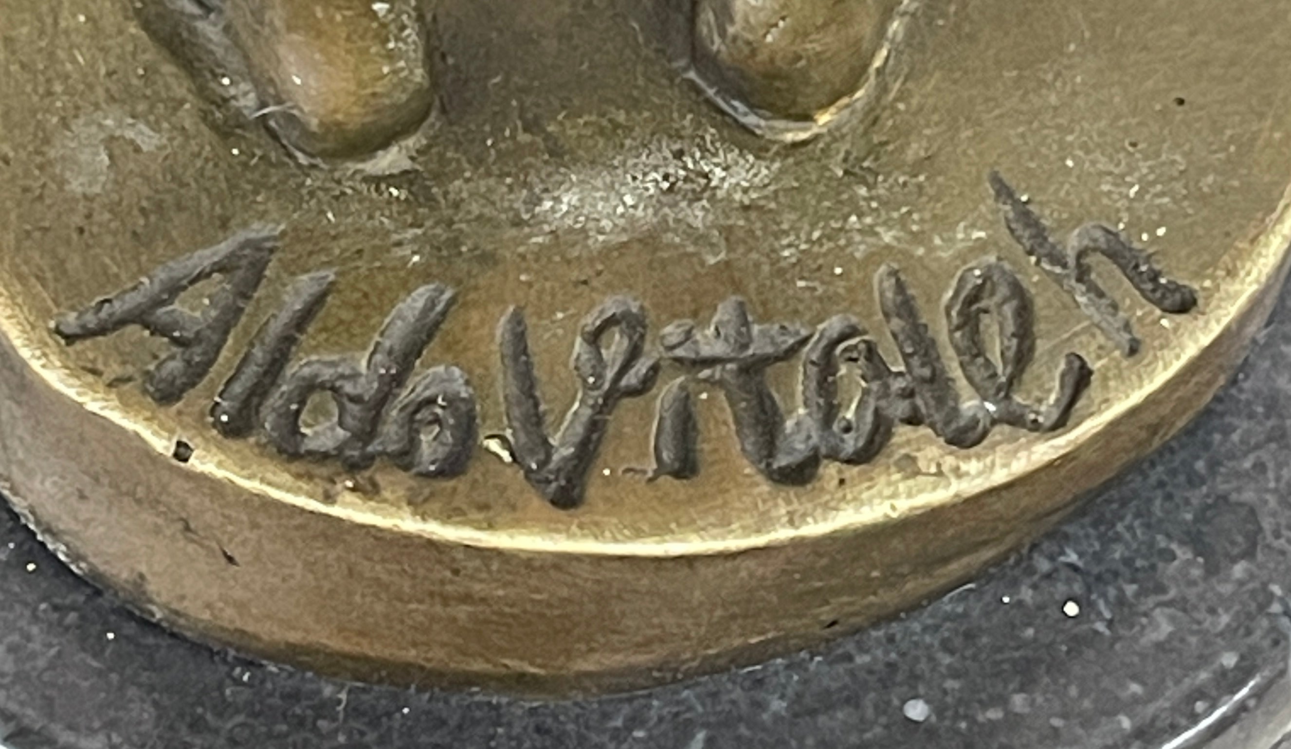 Transport yourself back in time with this enchanting bronze sculpture titled "Original Aldo Vitaleh Boy Holding a Tulip Vase." Crafted with exquisite attention to detail, this hand-made candle holder captures the innocence and charm of a young boy delicately holding a tulip vase. The artist, Aldo Vitaleh, masterfully brings life to the figure through the intricate lost wax method, ensuring a timeless and authentic piece of art.