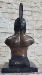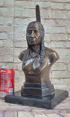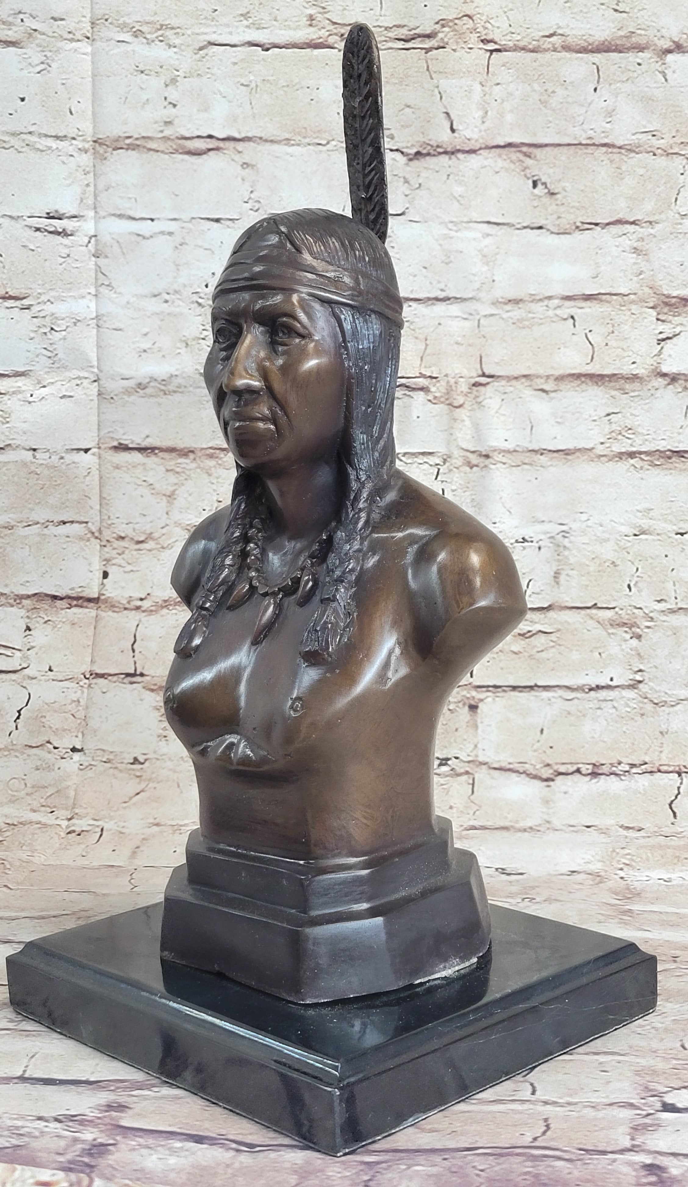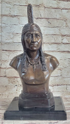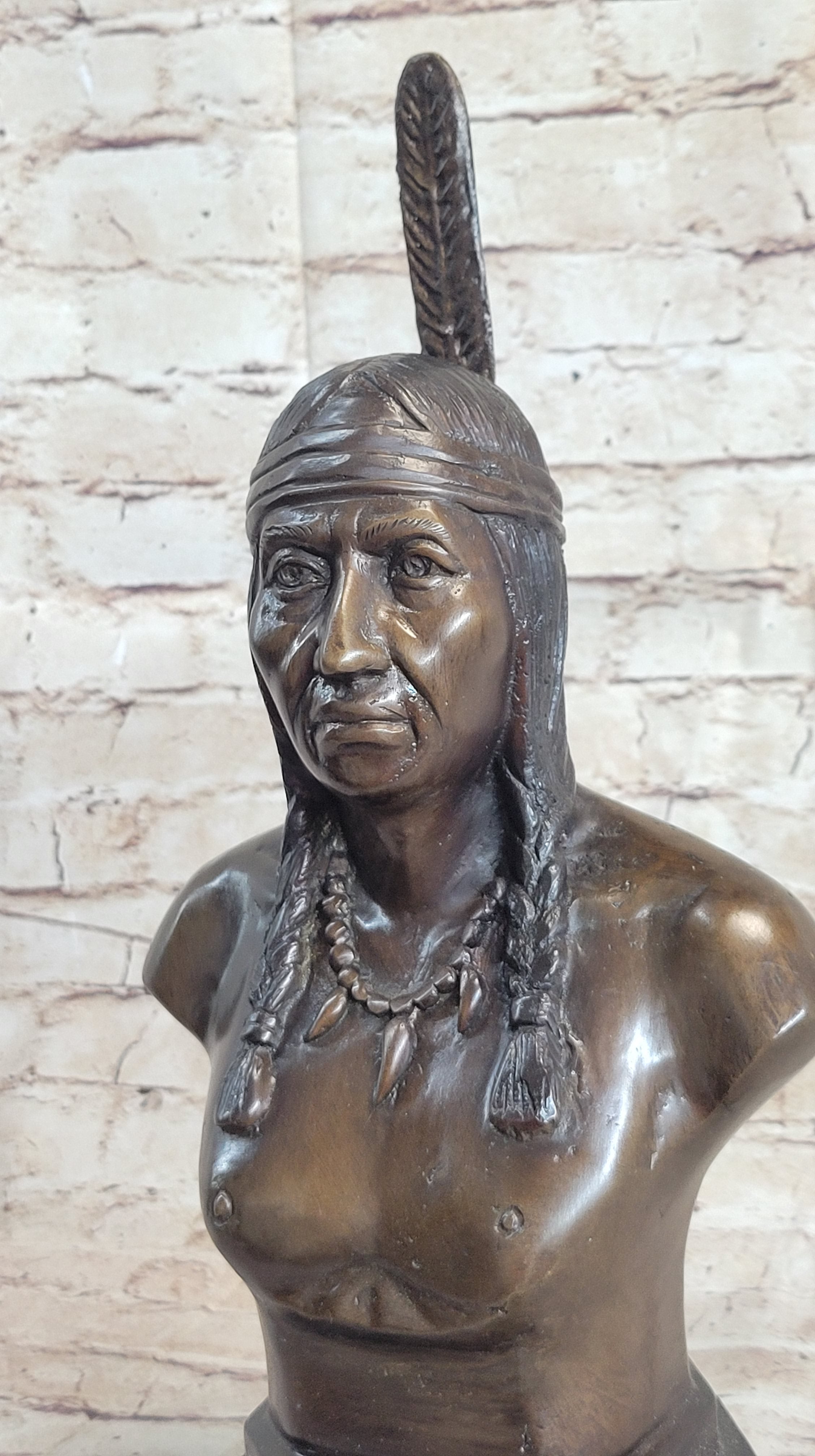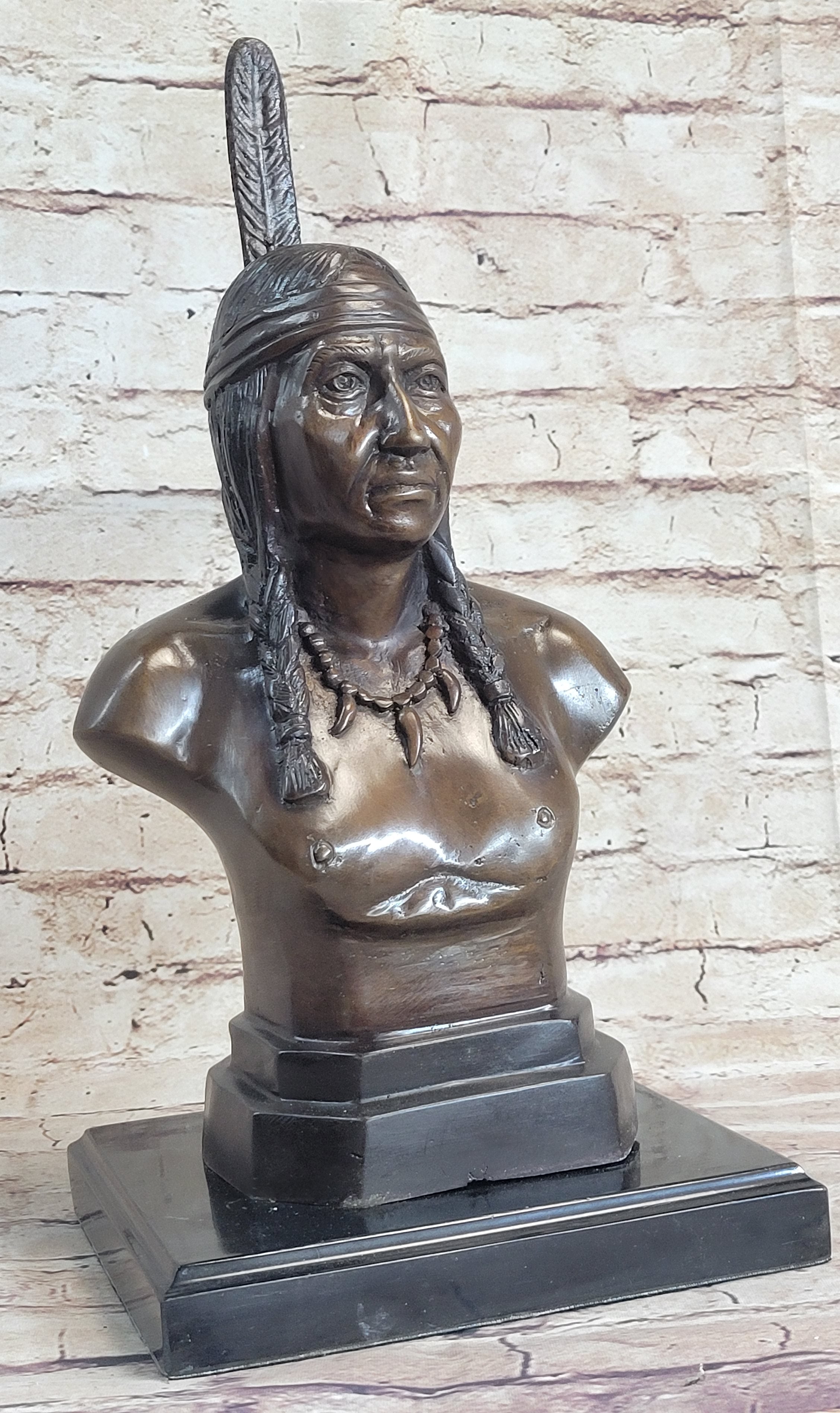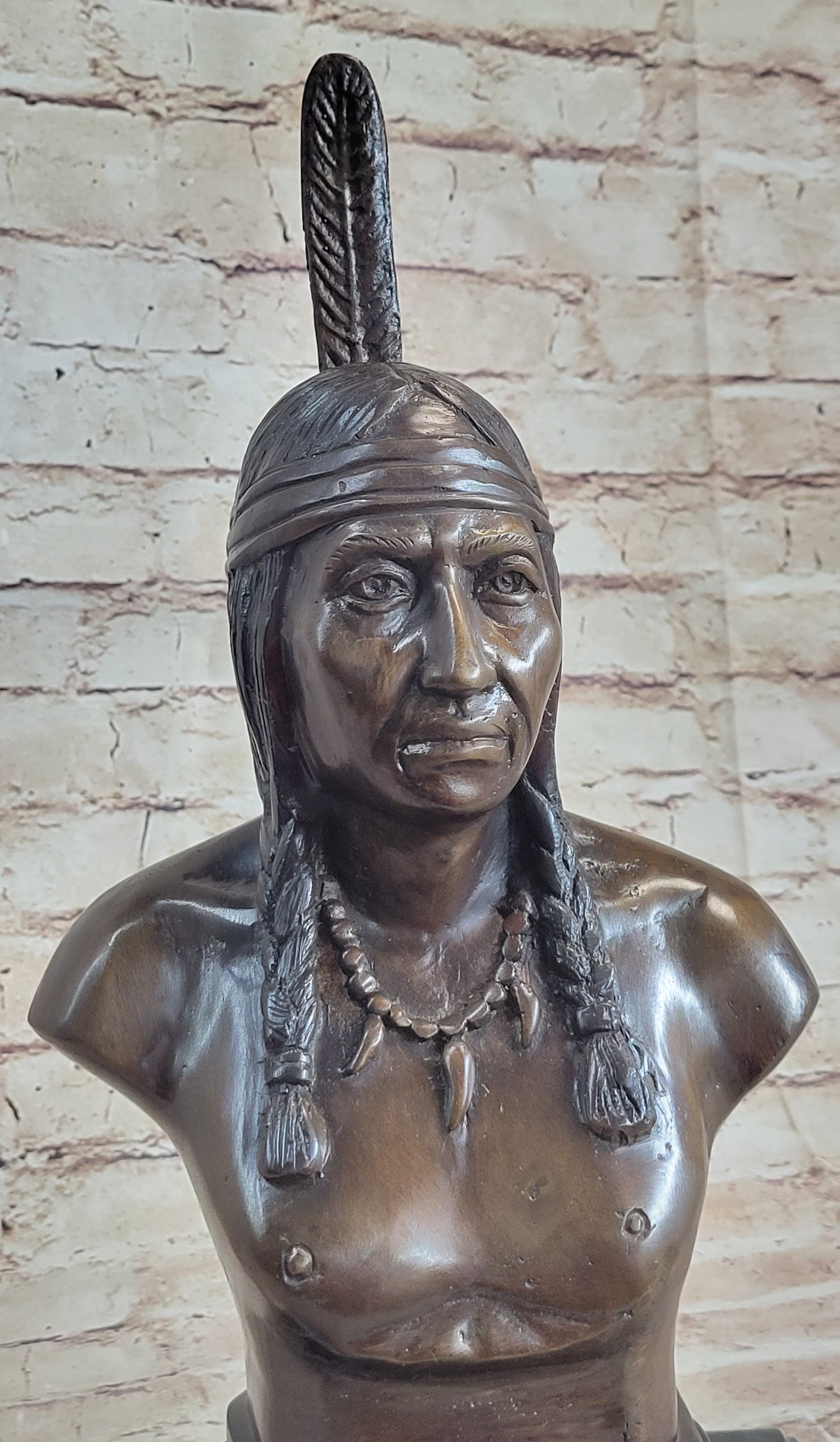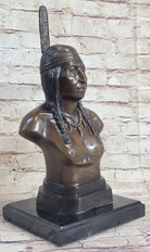 Bronze Bust Native American Indian w/ Braided Hair Statue on Marble Base 12" x 7"