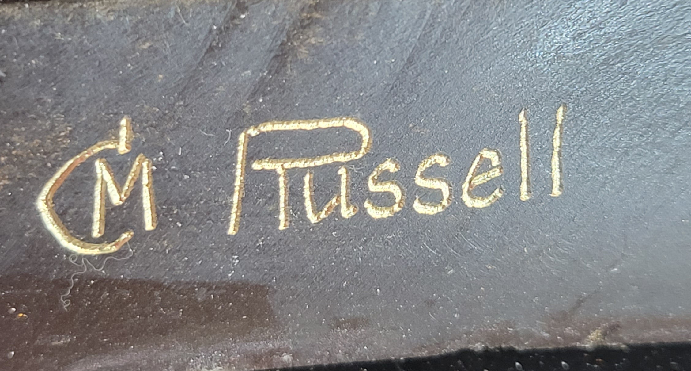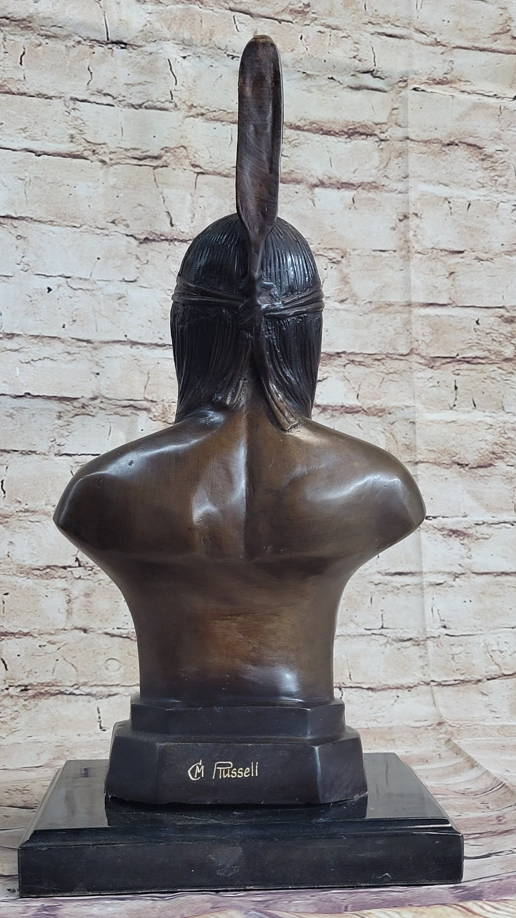 Molded using the archaic method of lost-wax casting, this sculpture achieves a level of detail that brings the warrior chief to life. The skin tones are finished in a brown patina stain, contributing to the overall lifelike appearance and providing a sense of permanence. The bust is skillfully mounted upon a black marble base, creating a visually striking and stable presentation. The signature of C.M. Russell, the artist behind this remarkable piece, adds quality and recognition to the sculpture, showcasing the dedication and expertise involved in its creation.