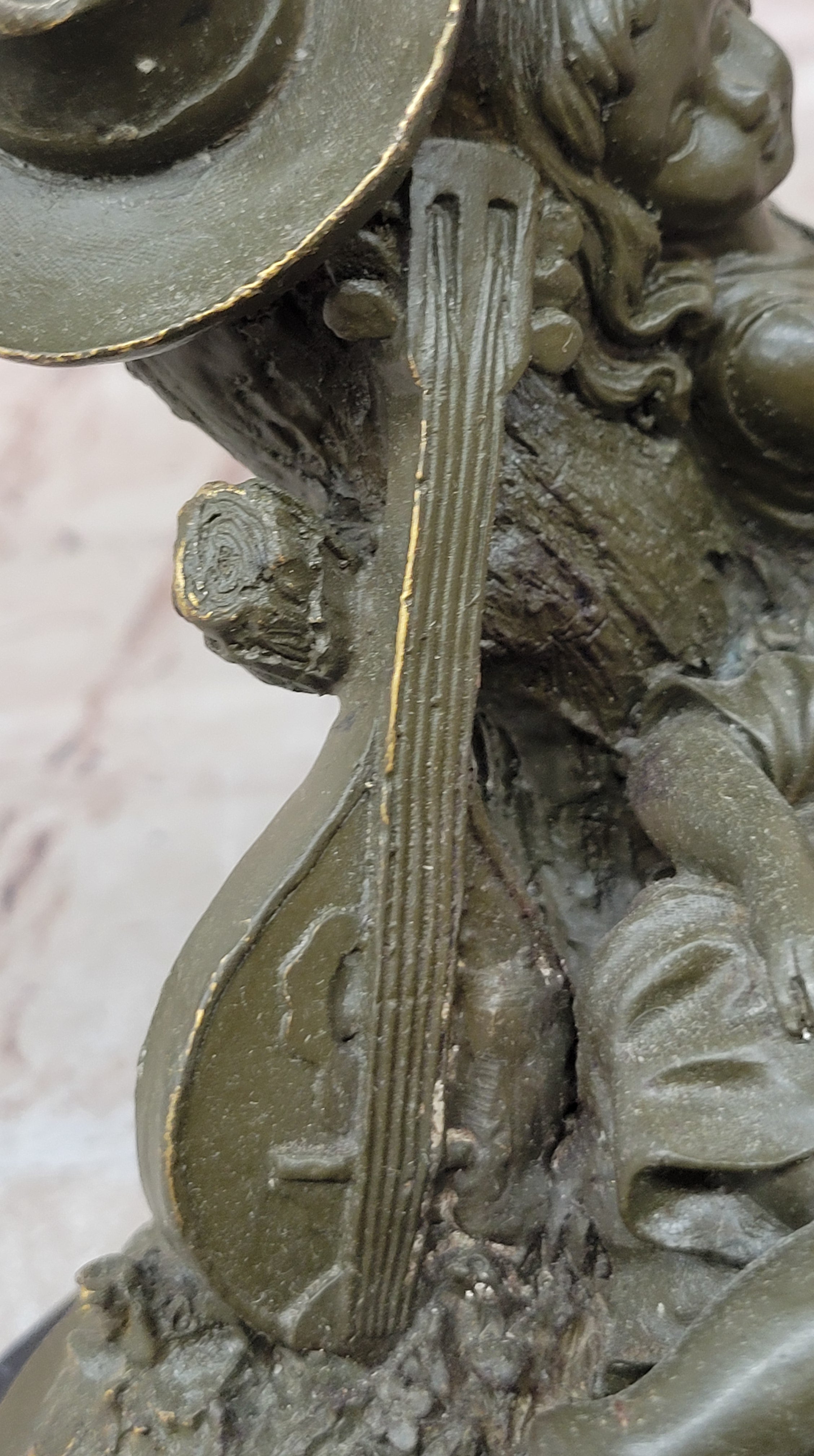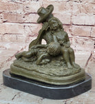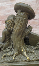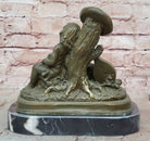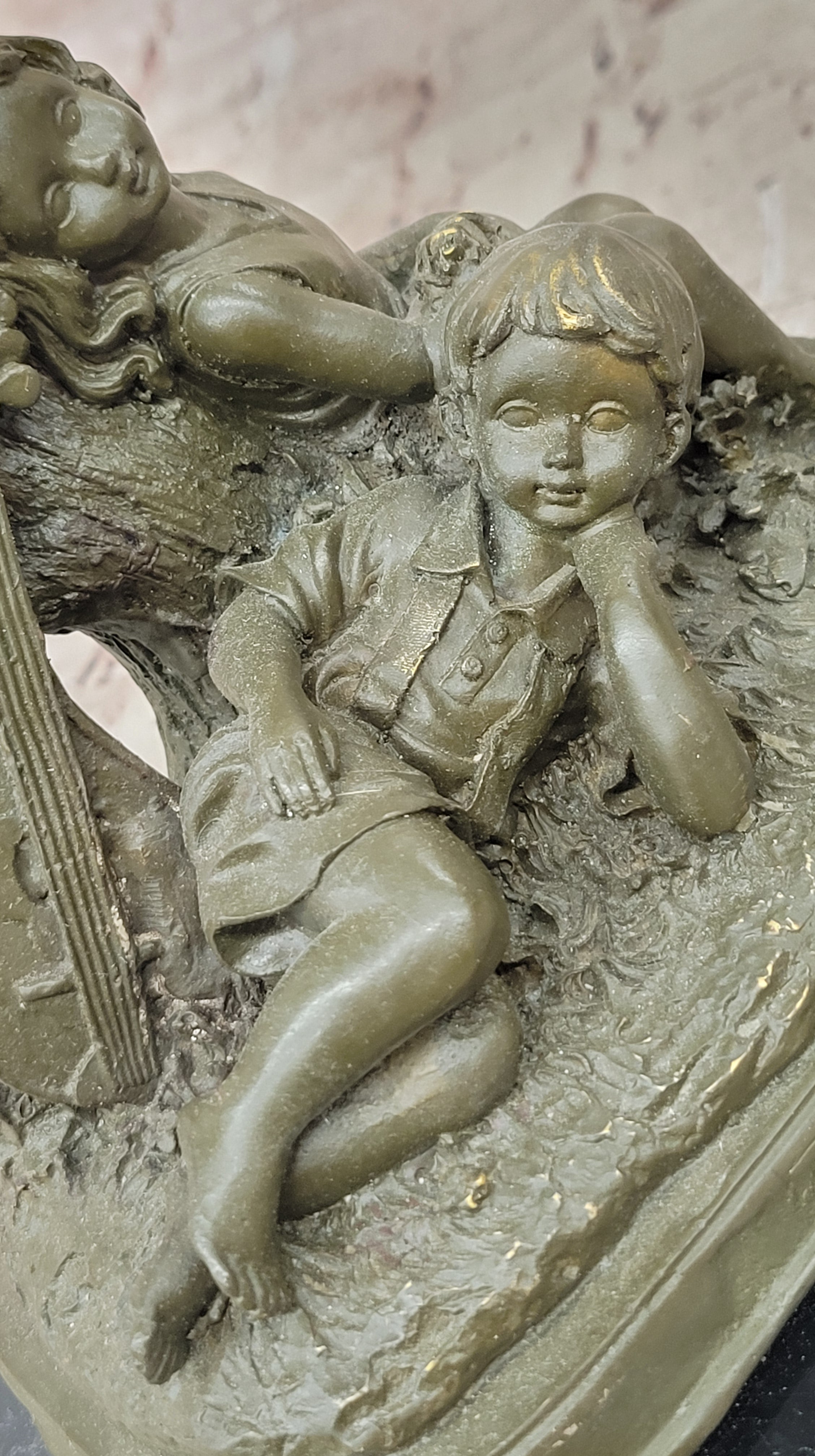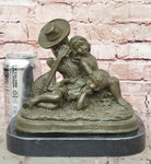 This charming bronze sculpture by J. Patoue captures a heartwarming moment of innocence and rest, featuring a young boy and girl peacefully napping side by side after playing music. Their relaxed postures and gentle expressions convey a sense of contentment and serenity, evoking memories of carefree childhood and the simple joy of companionship. The instruments beside them hint at the melody that preceded their slumber, adding a poetic touch to the scene.