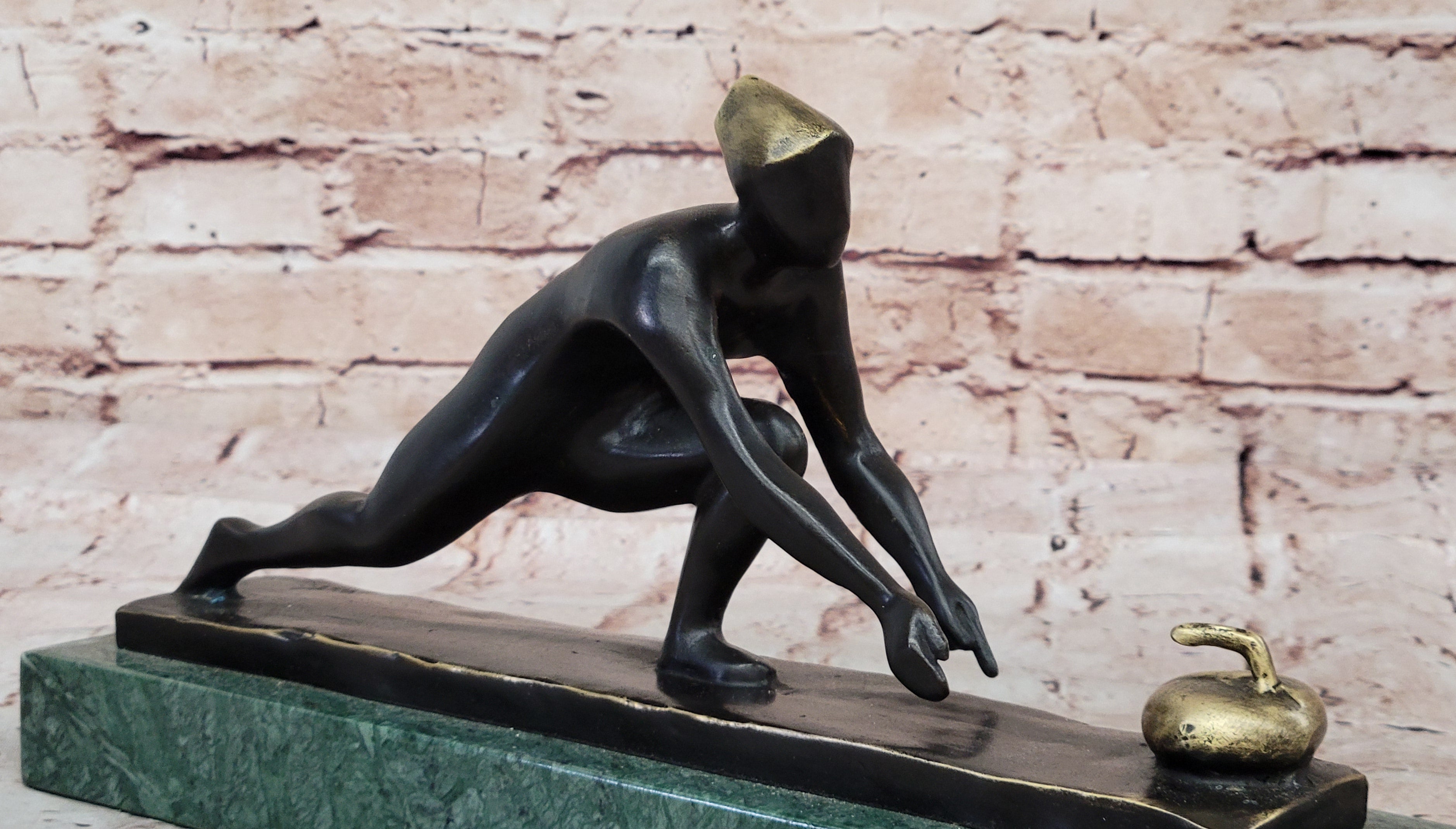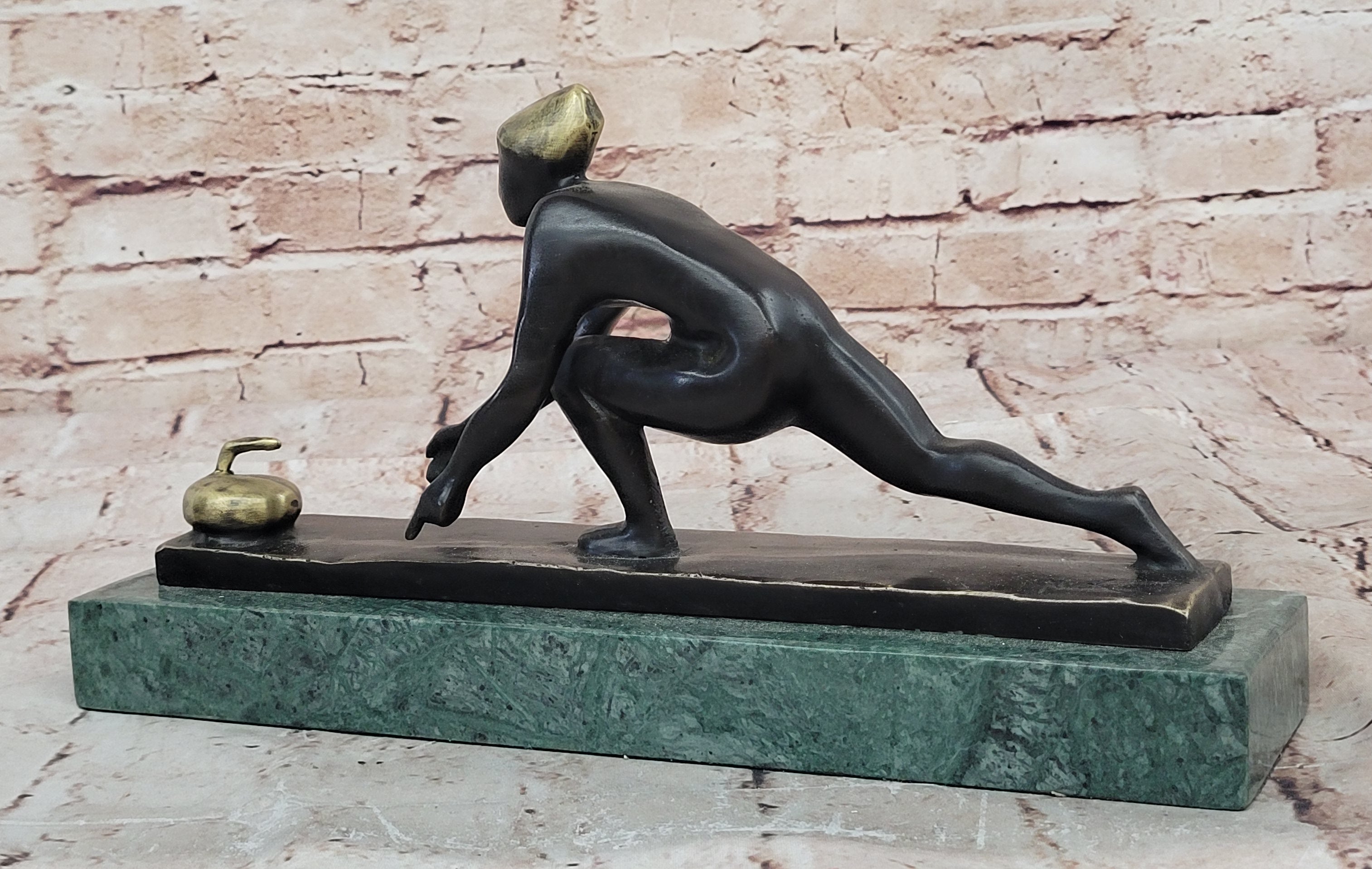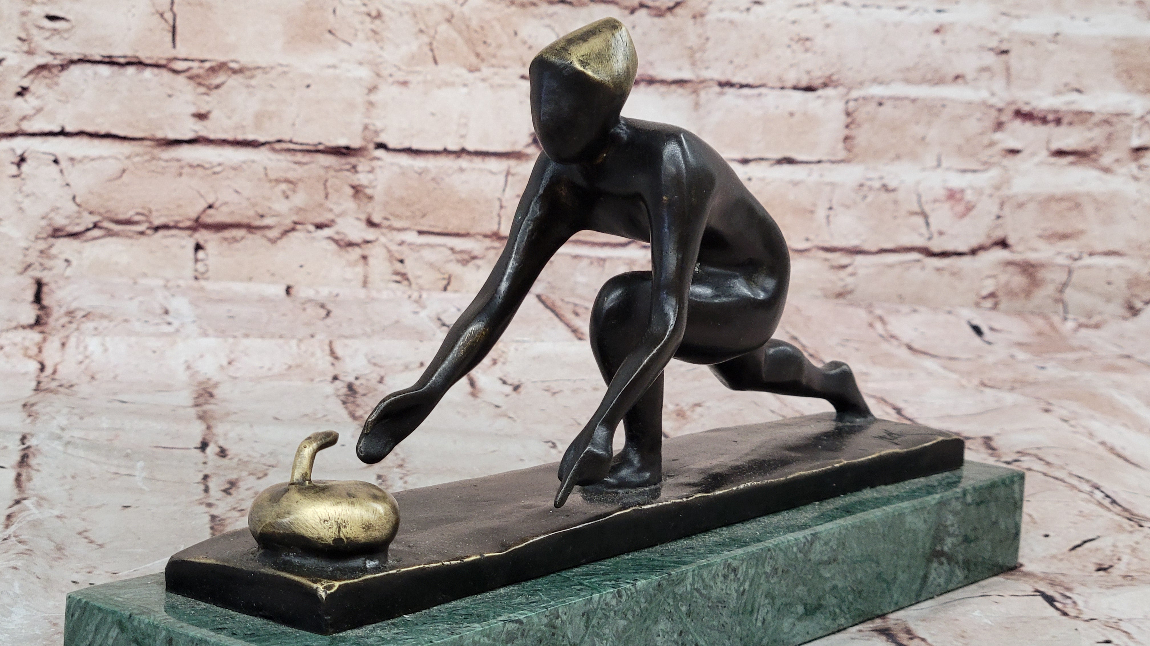 Bronze Curling Player Sculpture – Sports Themed Artwork on Marble Base