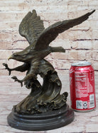 Introducing a captivating bronze sculpture depicting a majestic eagle in the midst of its hunt. With wings outstretched and talons poised for action, the eagle descends upon the ocean's surface, ready to snatch its prey. The sculpture beautifully captures the intensity and focus of this remarkable bird of prey.