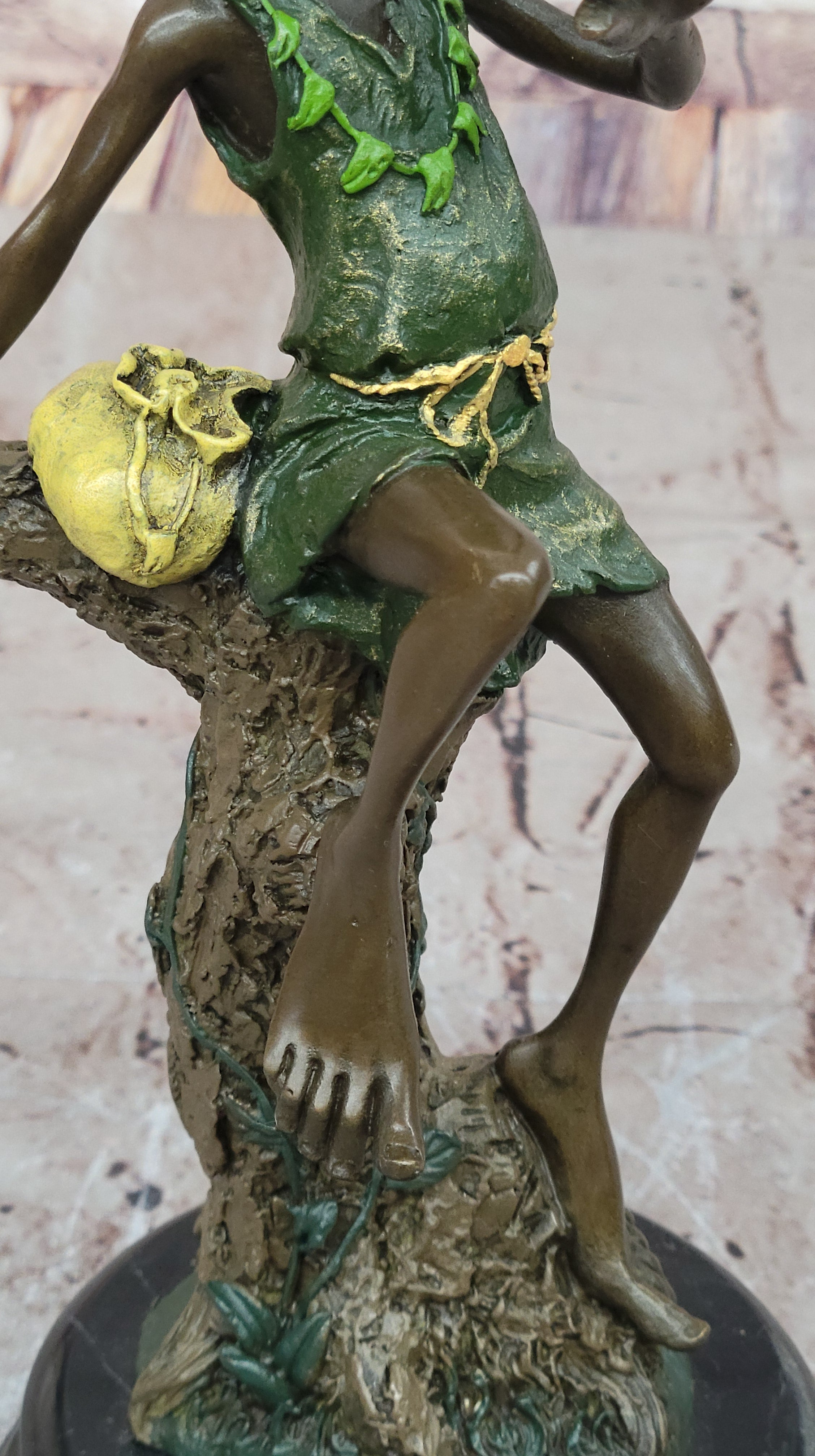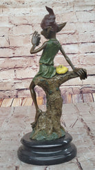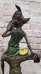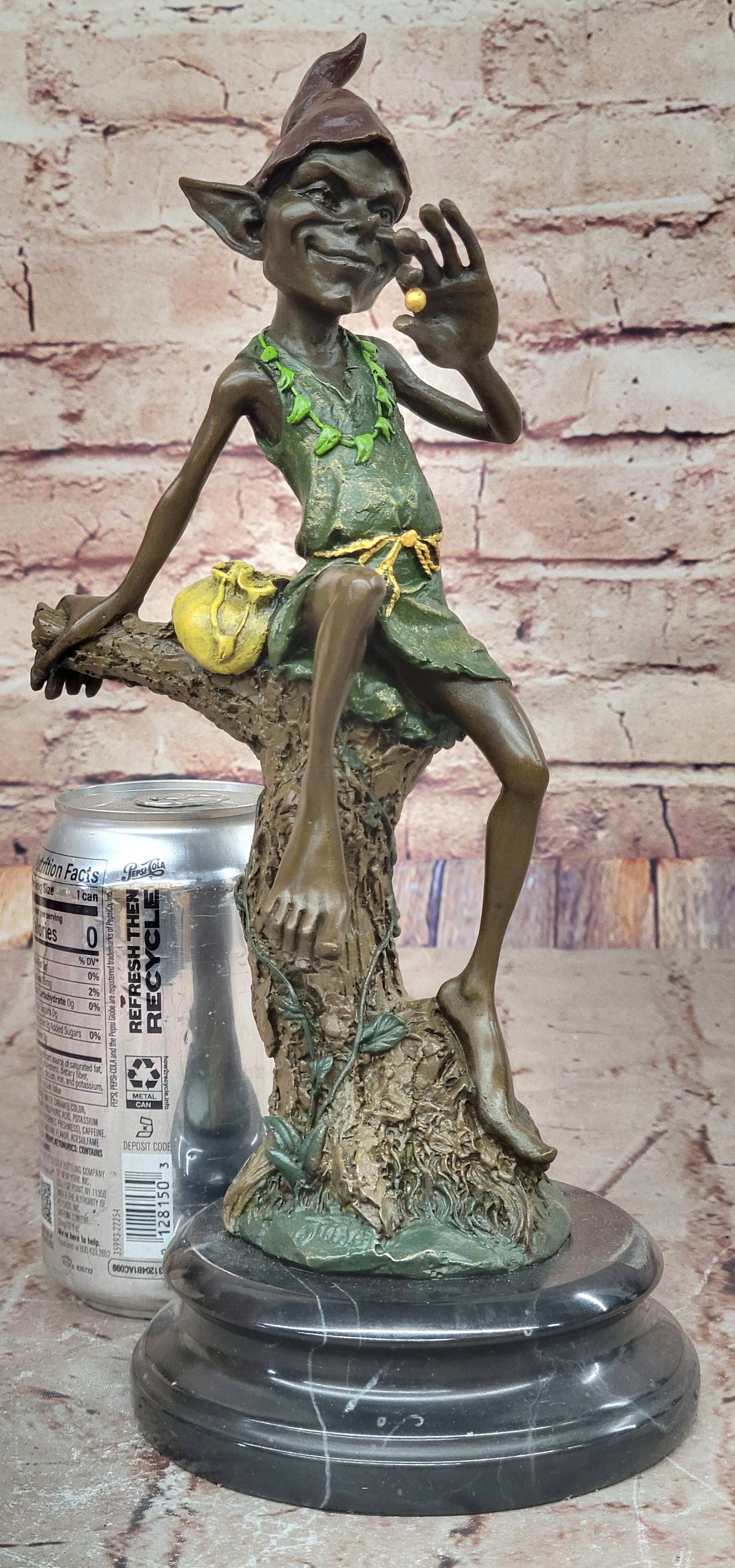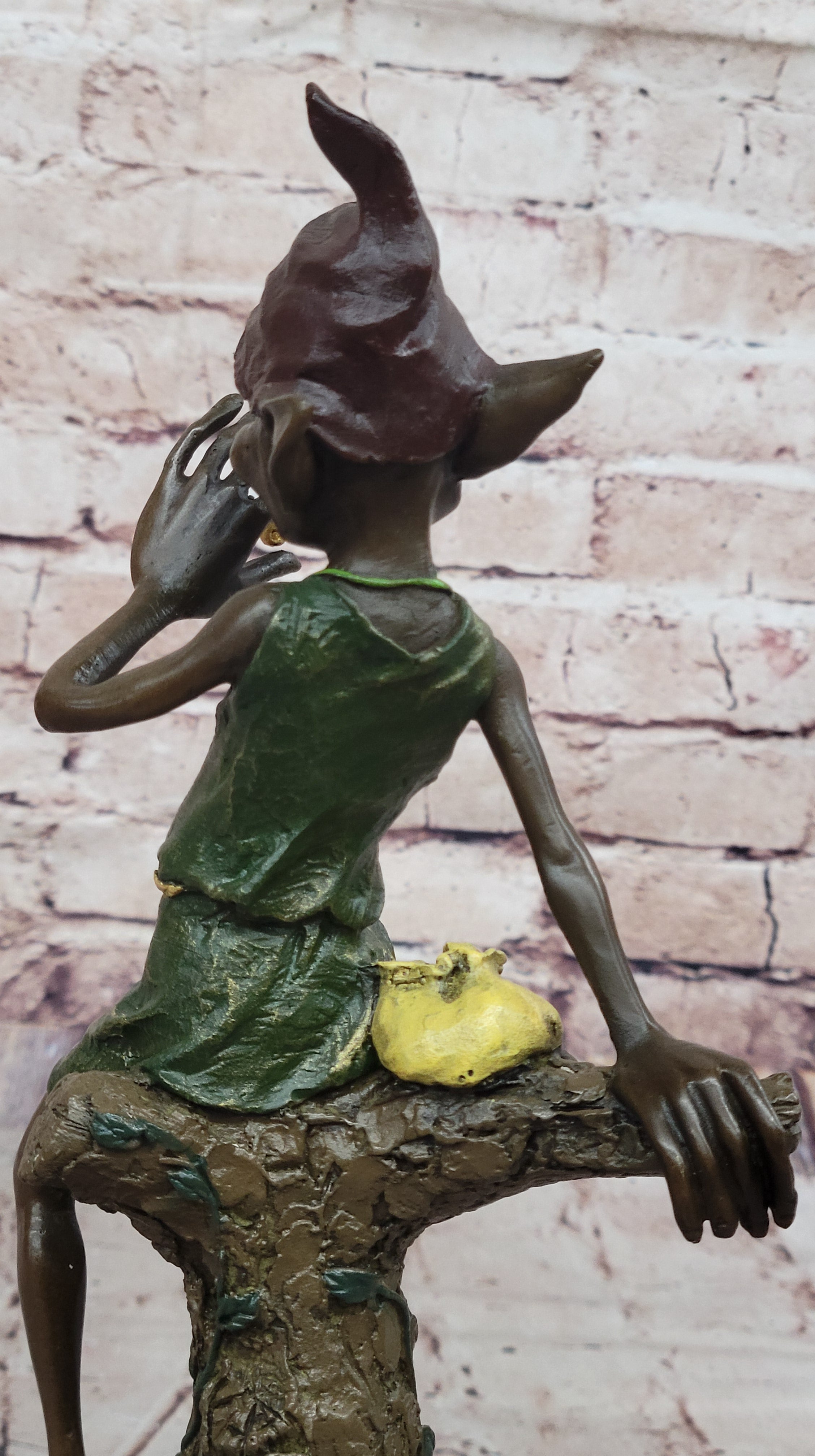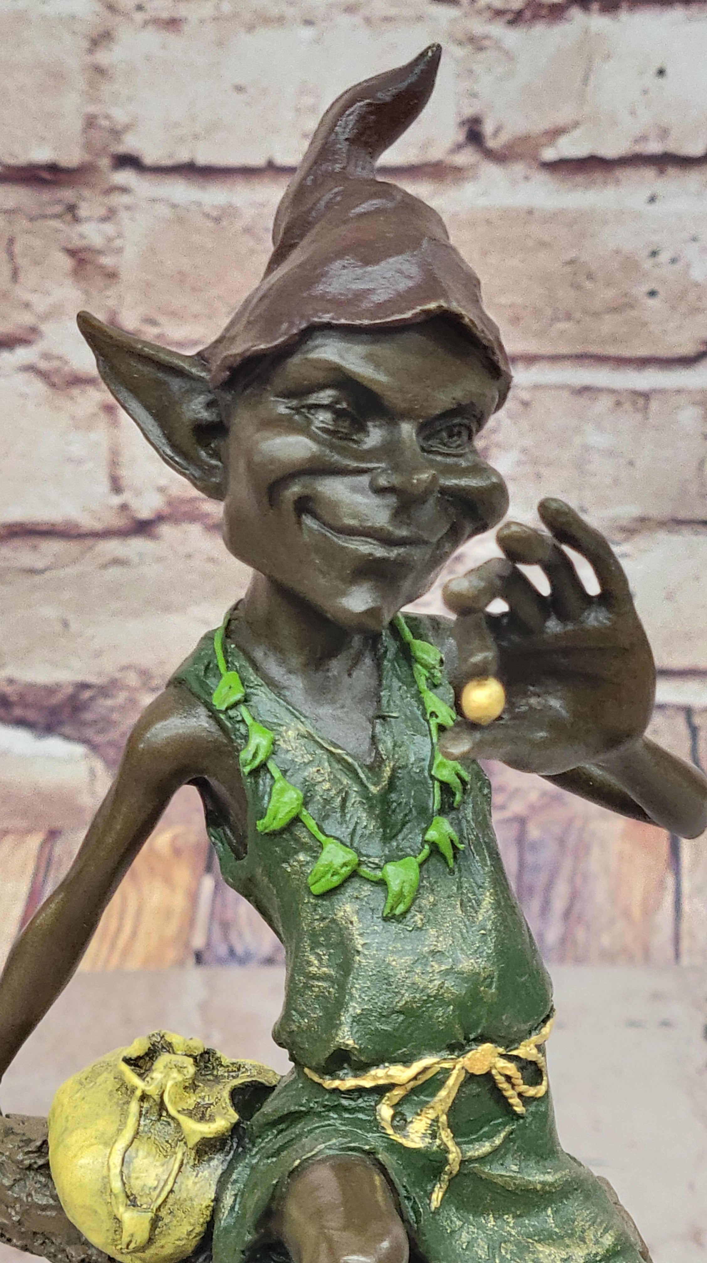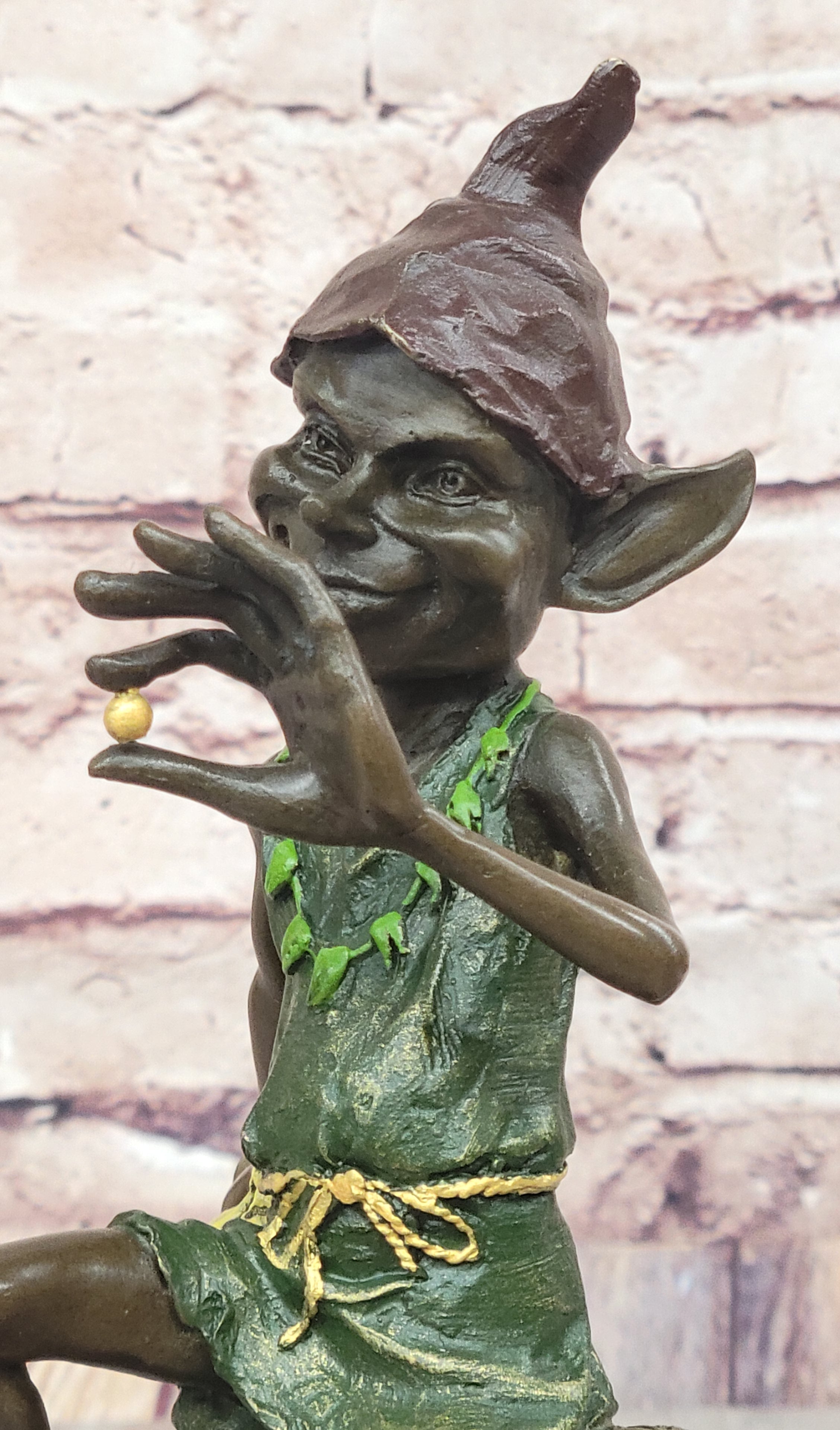 Bronze Elf Leprechaun Sitting on Tree Stump Fantasy Sculpture with Marble Base