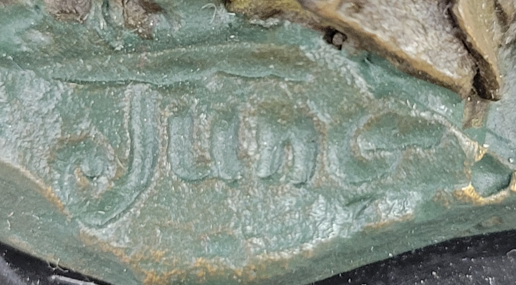 This outstanding bronze sculpture is 100% handmade and features a beautiful patina finish. The sculpture is mounted on a sturdy marble base and is signed by the renowned artist Juno. One of the figures has a small stress line, but it is still strong and solid.