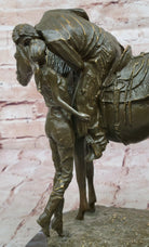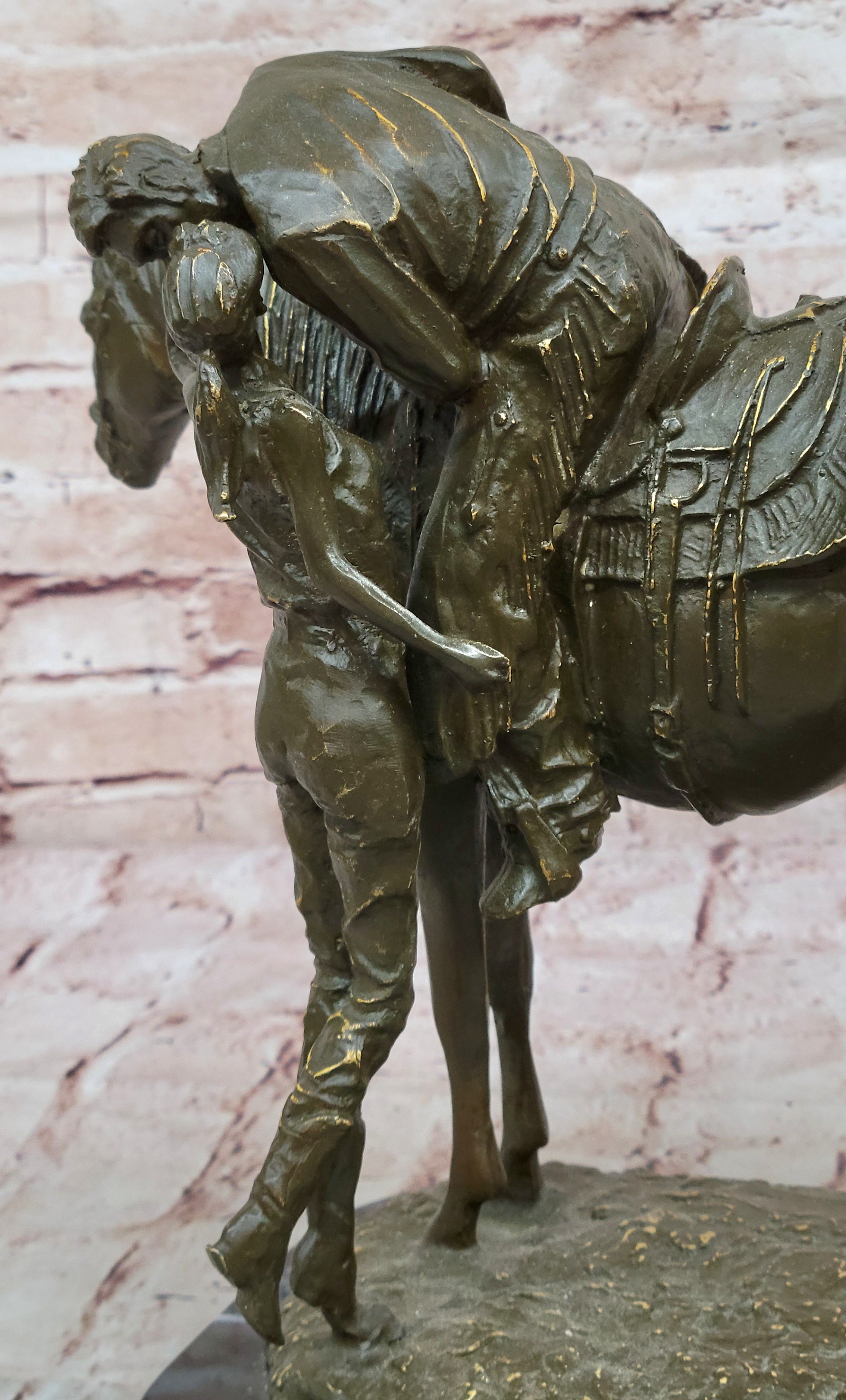 Expertly handcrafted using the traditional lost wax method, this hot cast bronze sculpture reflects Vitaleh’s mastery in detail and form. From the finely sculpted musculature of the horse to the expressive postures of the couple, every element is thoughtfully rendered. The rich brown patina enhances the sculpture’s depth and texture, giving it a classic and enduring finish that complements its nostalgic theme.