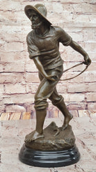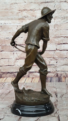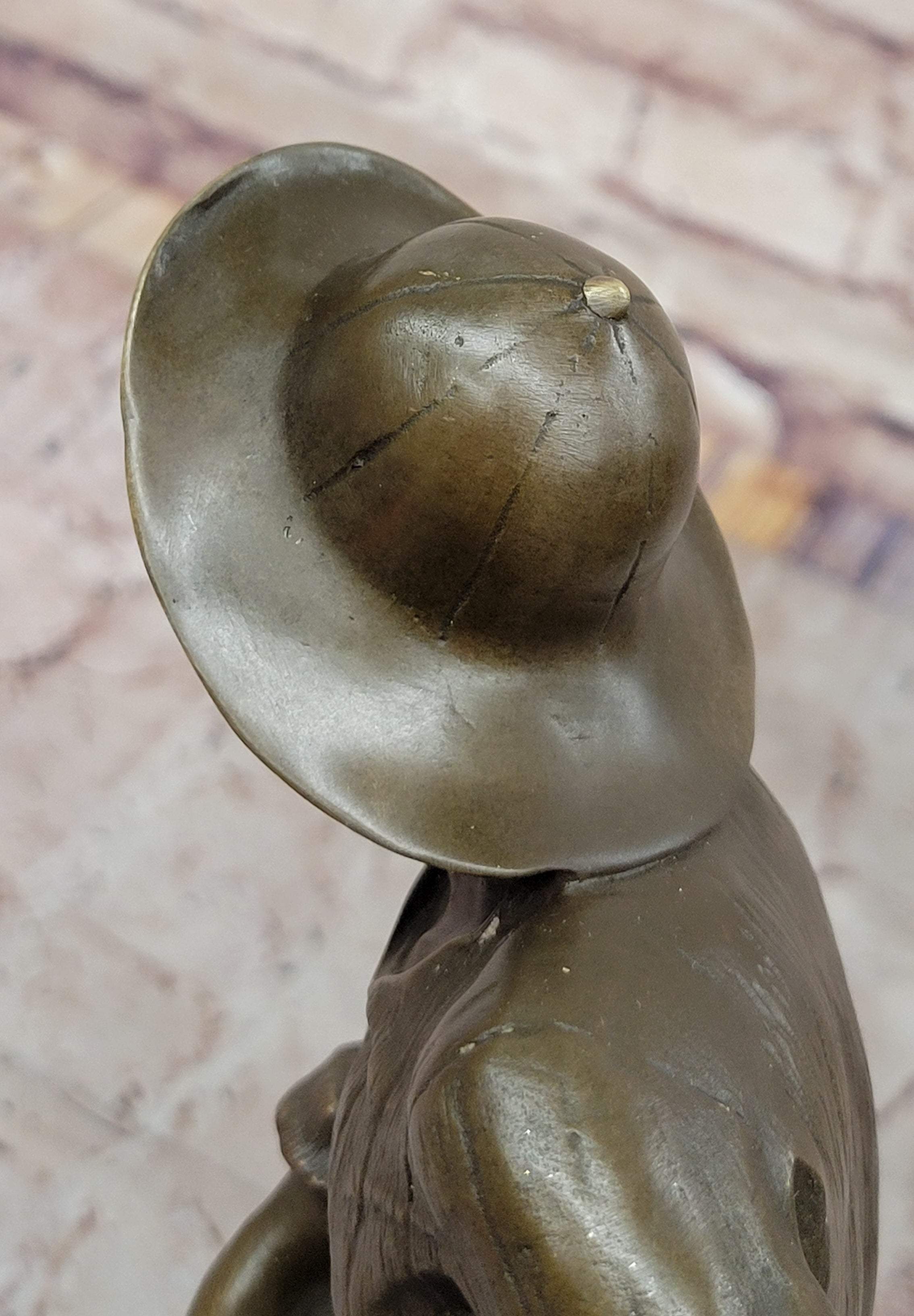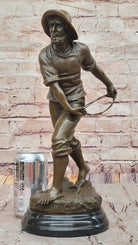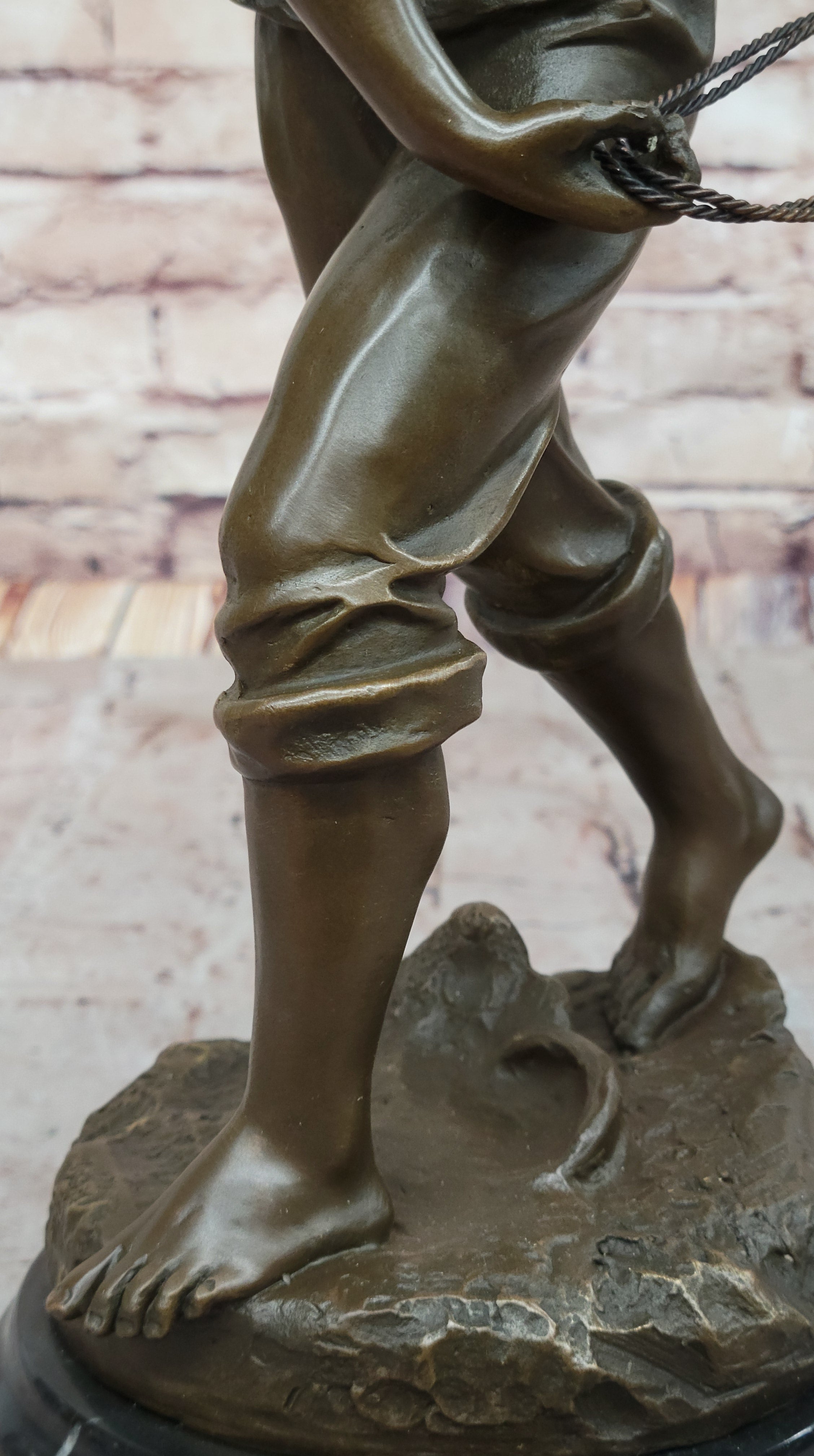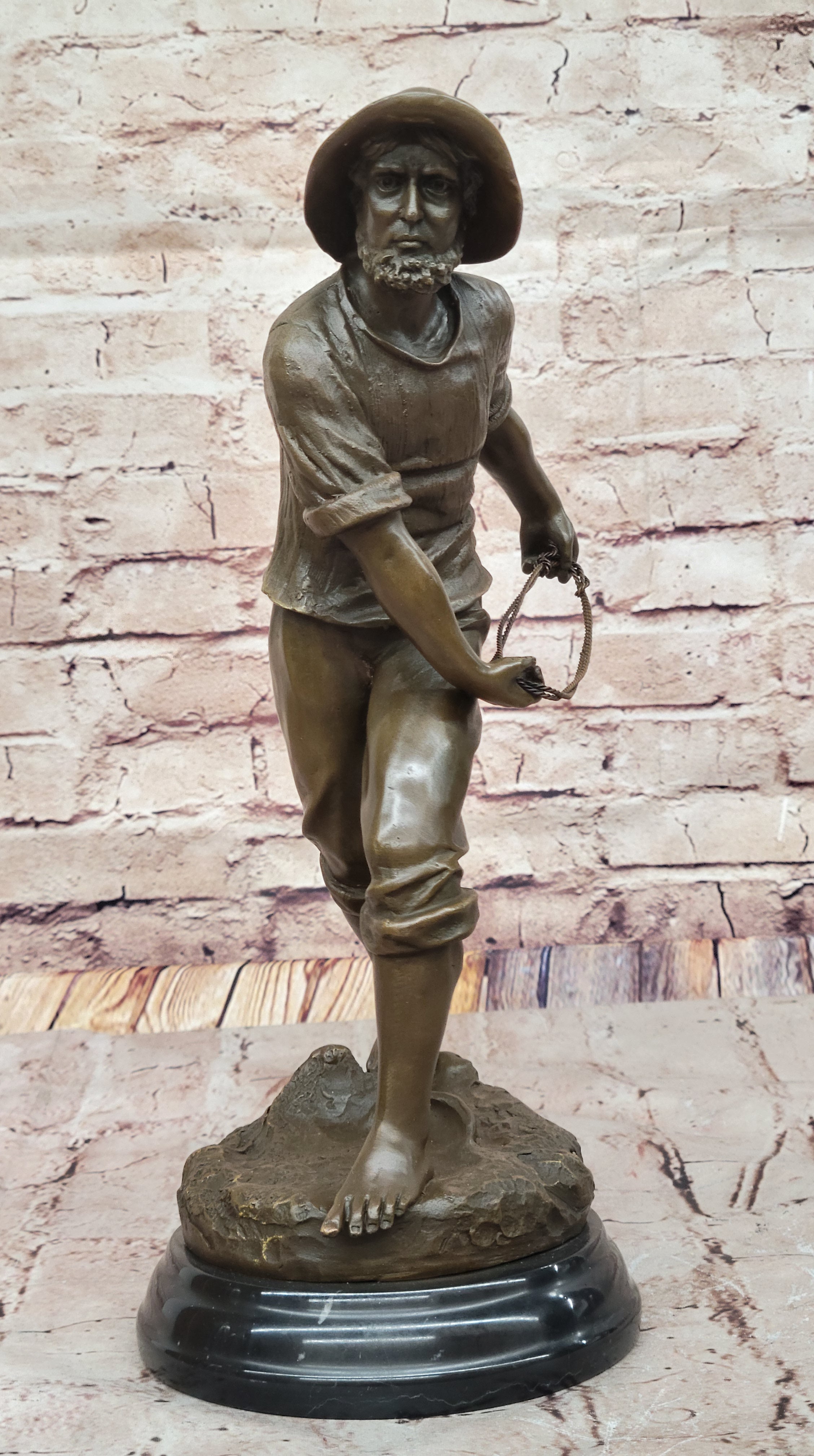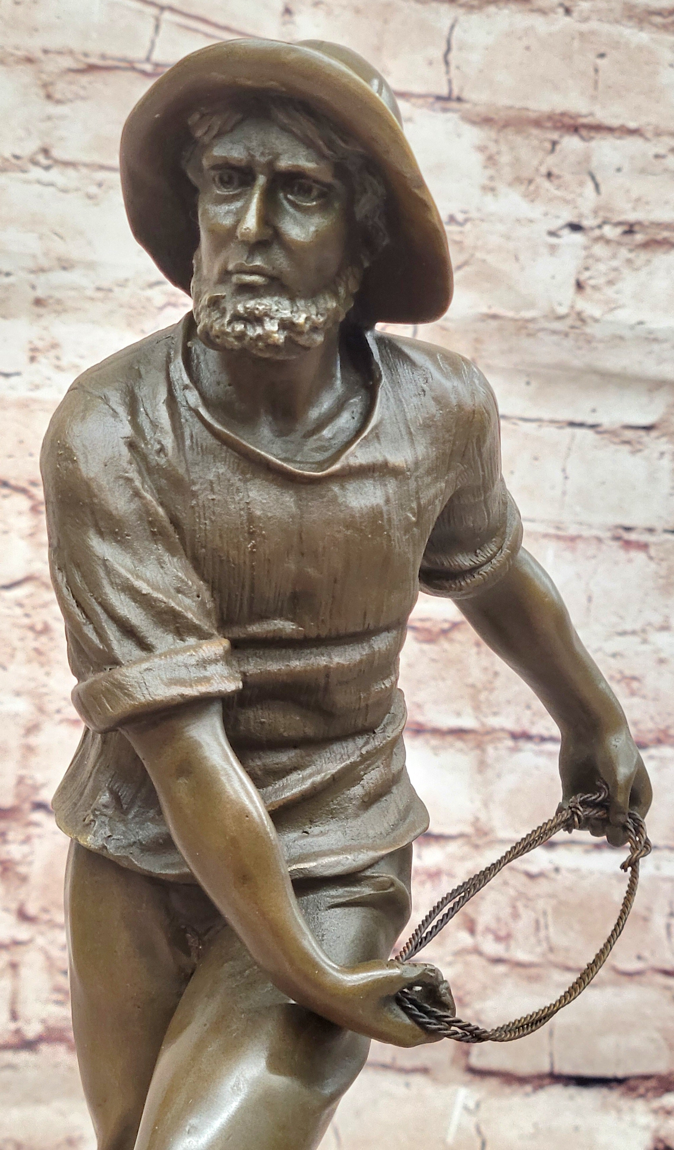 Crafted using the lost wax method, this sculpture ensures incredible detail and lifelike realism, from the texture of the fisherman’s clothing to the tension in his muscles as he pulls the rope. The dark brown patina enhances the depth and character of the piece, lending it a sense of timelessness and authenticity. Every element of the composition speaks to the artist’s dedication to realism and storytelling through bronze.