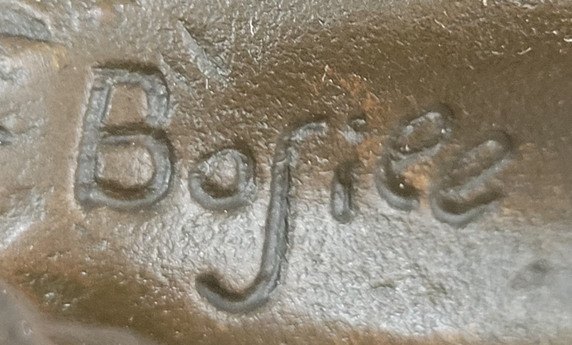 Mounted on a round black marble base, the sculpture is not only visually striking but also balanced and durable. The polished marble contrasts beautifully with the bronze, emphasizing the richness of the patina. Signed by Antoine Bofill, this piece is a remarkable addition for collectors of maritime art, historical sculptures, or those who appreciate the skillful representation of hardworking individuals in classic bronze artistry.Bronze Dimensions with Marble Base: Height 14" X Width 6"
