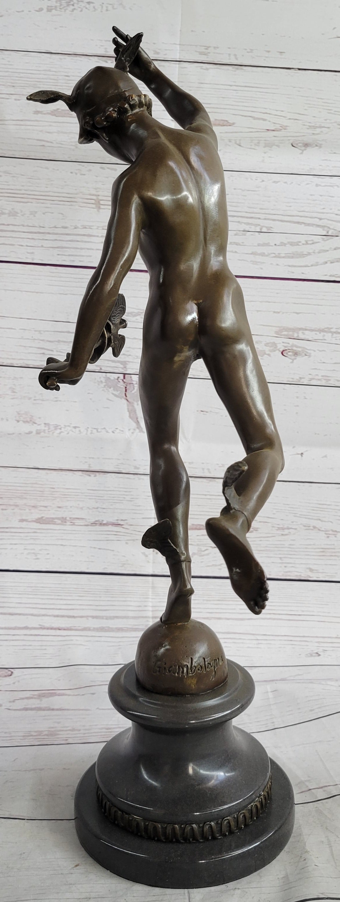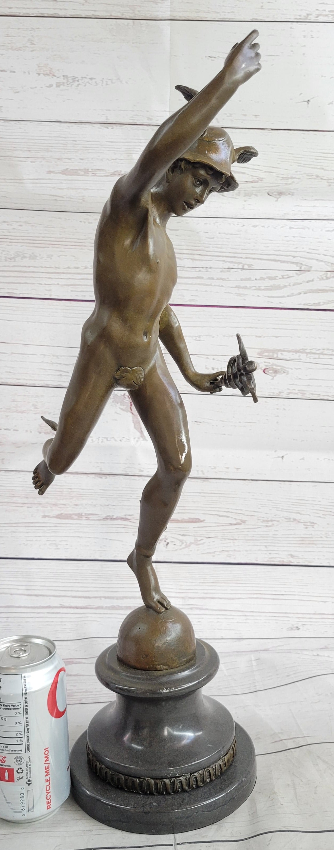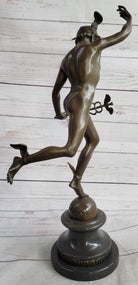 Bronze Flying Mercury w/ Caduceus Statue Sculpture Nude Figure on Marble Base
