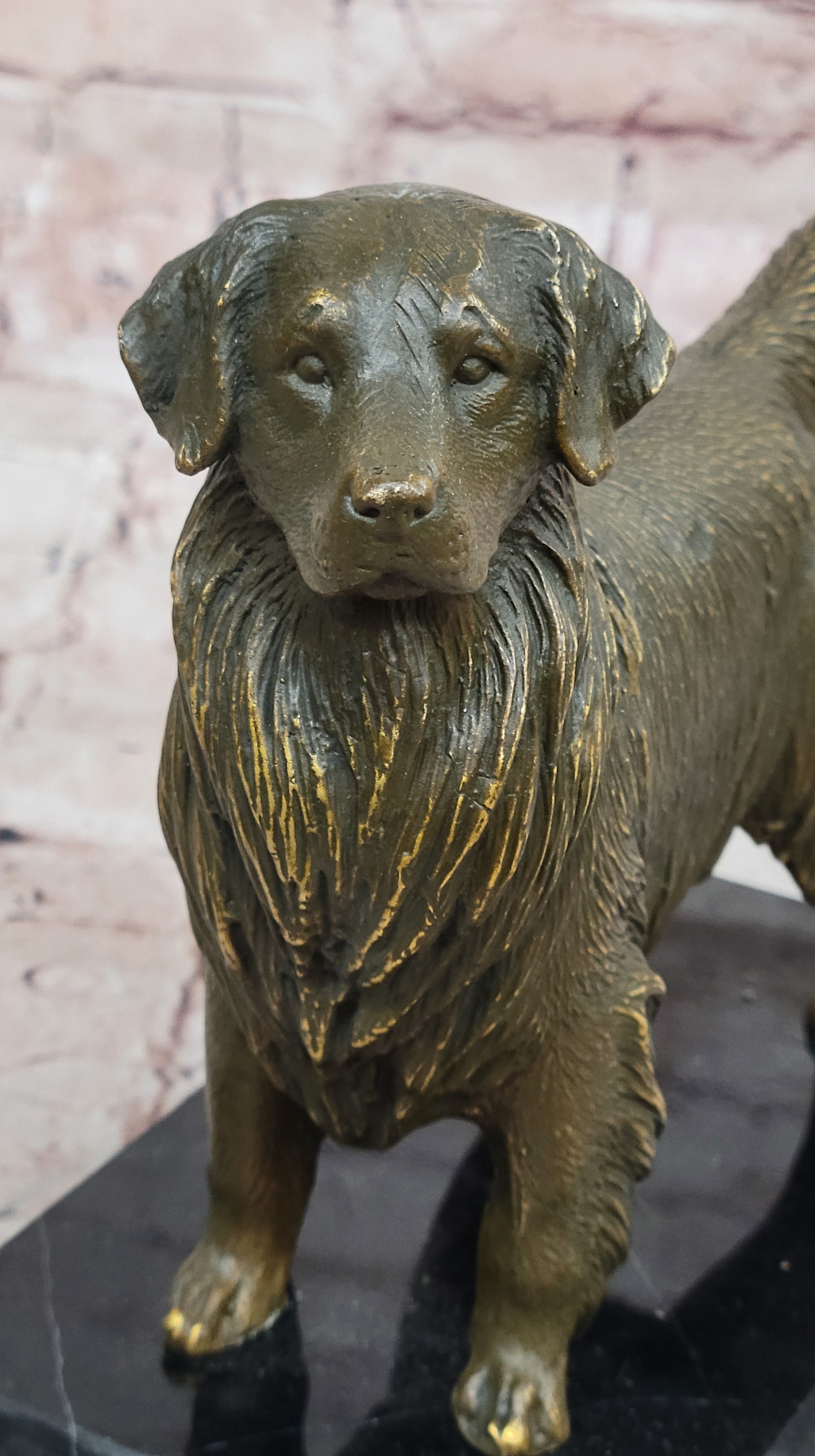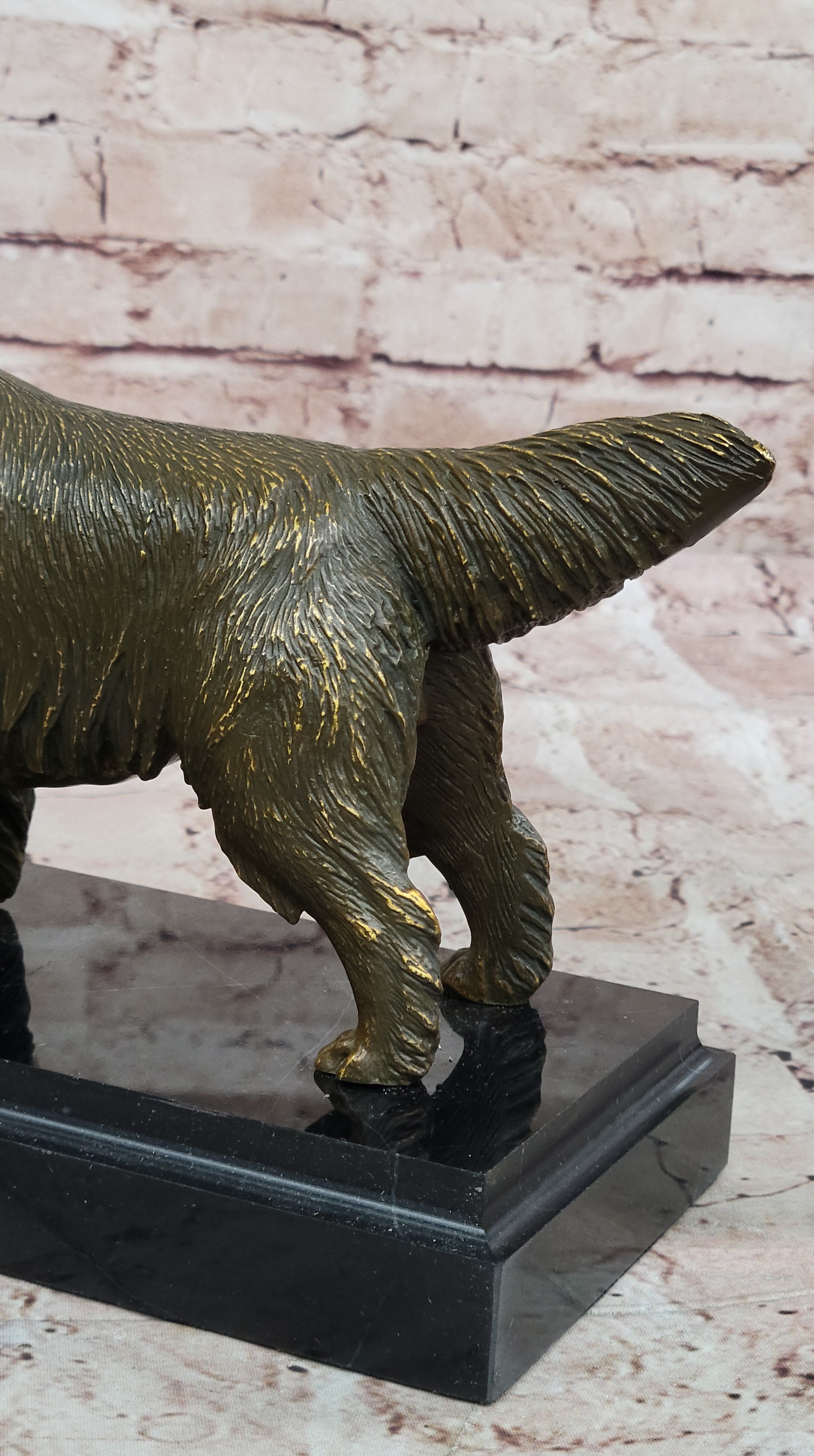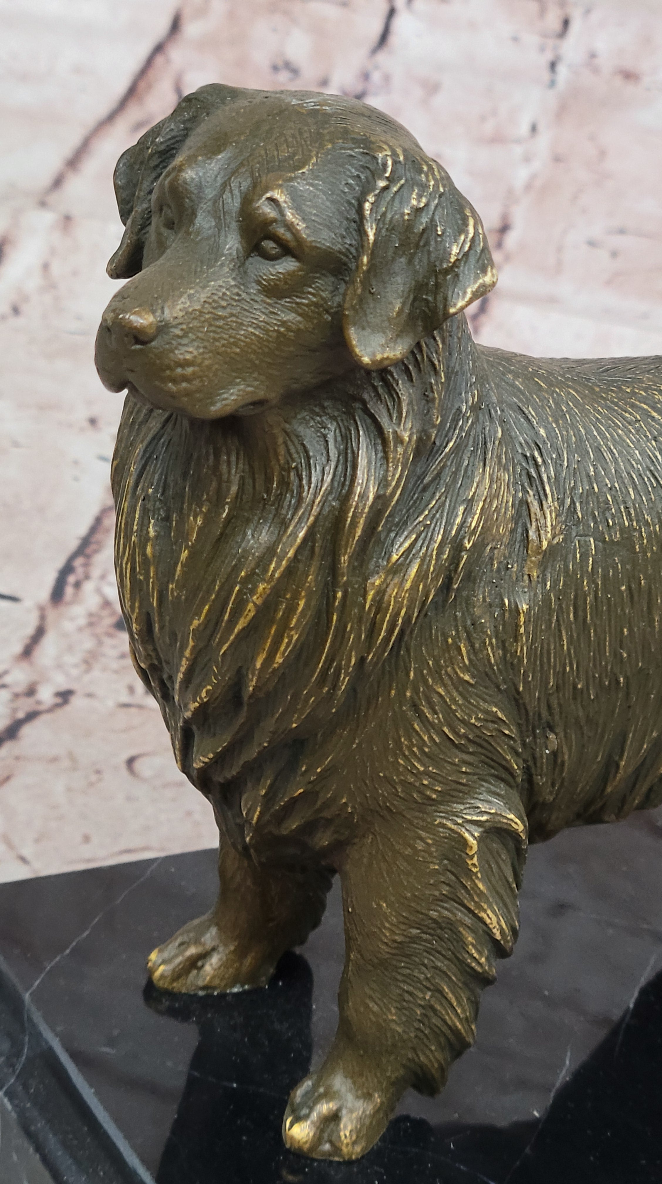 Expertly handmade using the traditional lost wax casting method, this genuine bronze sculpture features a rich brown patina that accentuates the detailed texture of the dog’s coat and form. The piece is securely mounted on a solid black marble base, enhancing both its elegance and durability. This classic combination of bronze and marble ensures a timeless presence, making it a distinguished addition to any collection or living space.