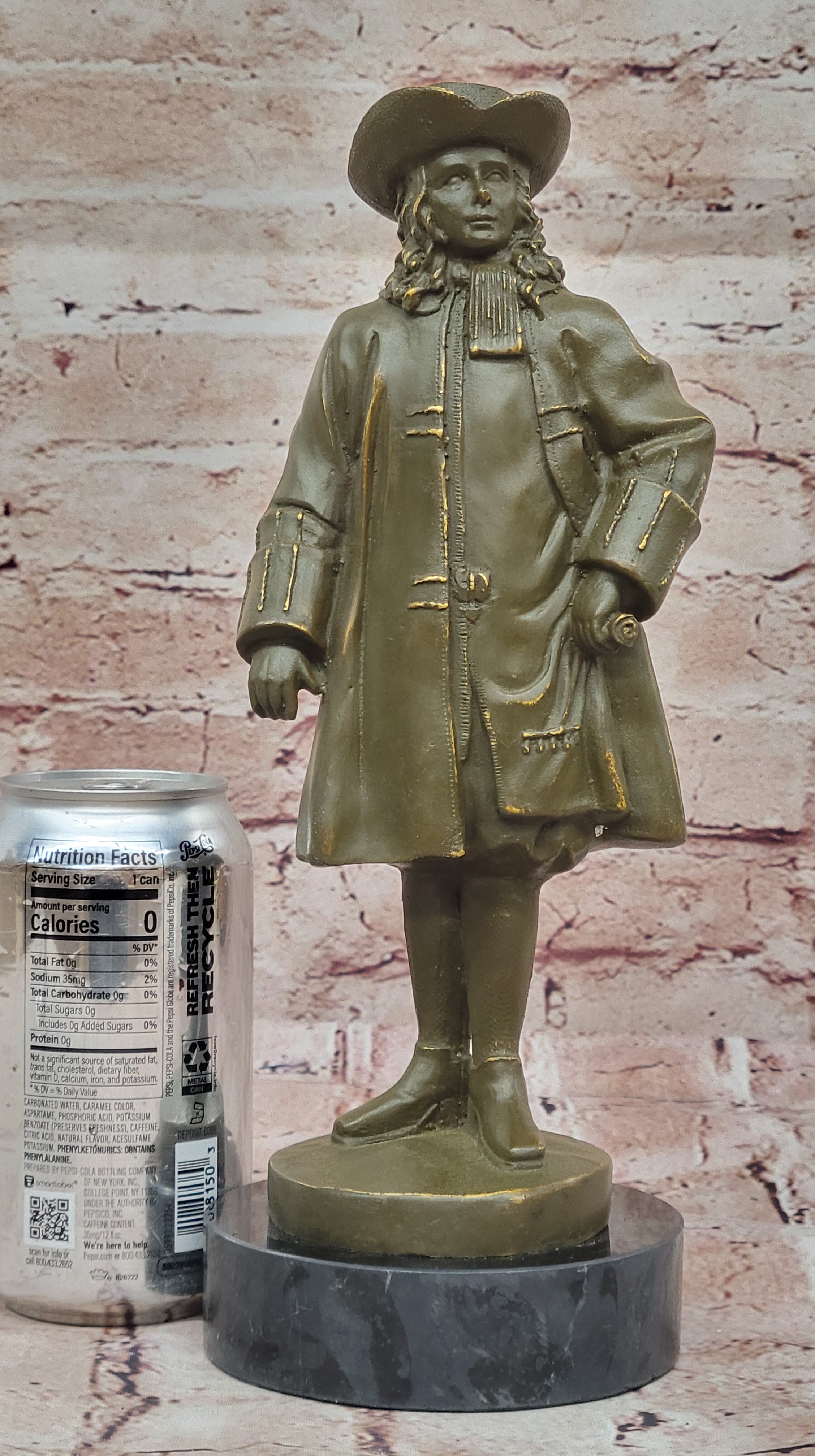 Bronze Historical Figure William Penn Statue with Hat on Marble Base Home Decor