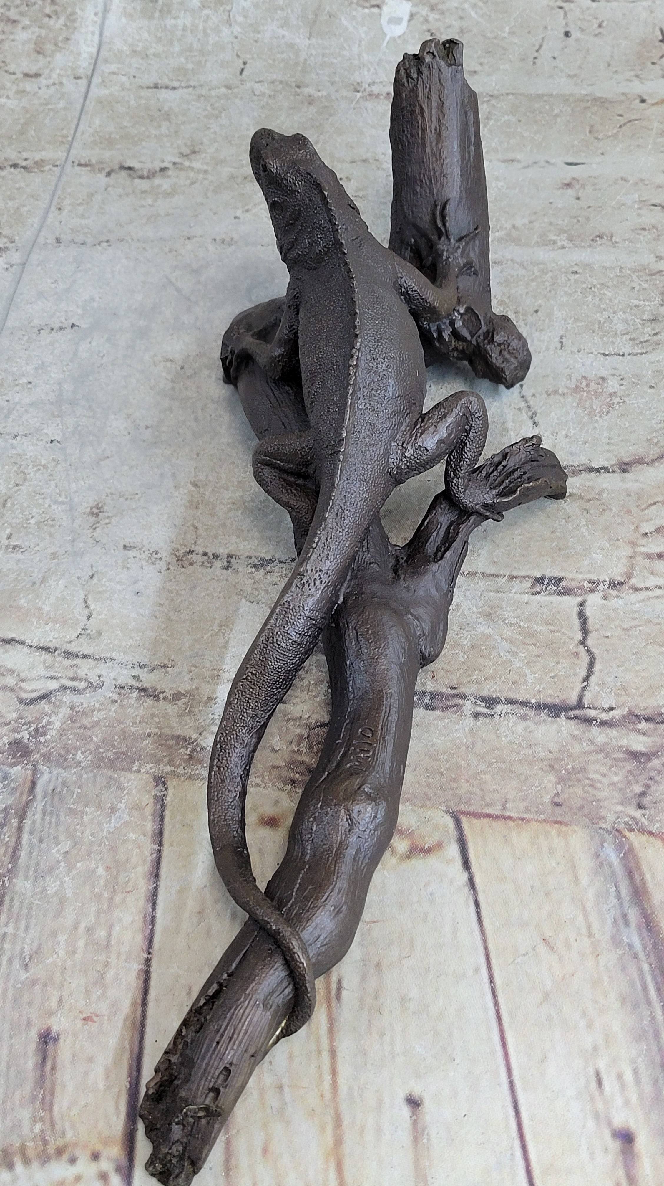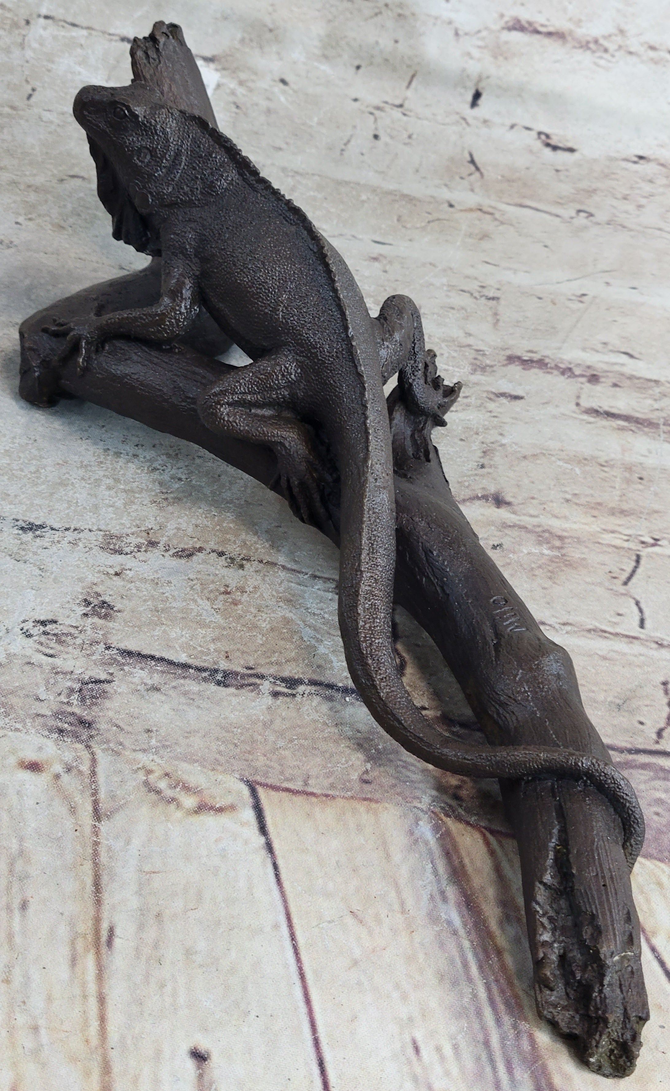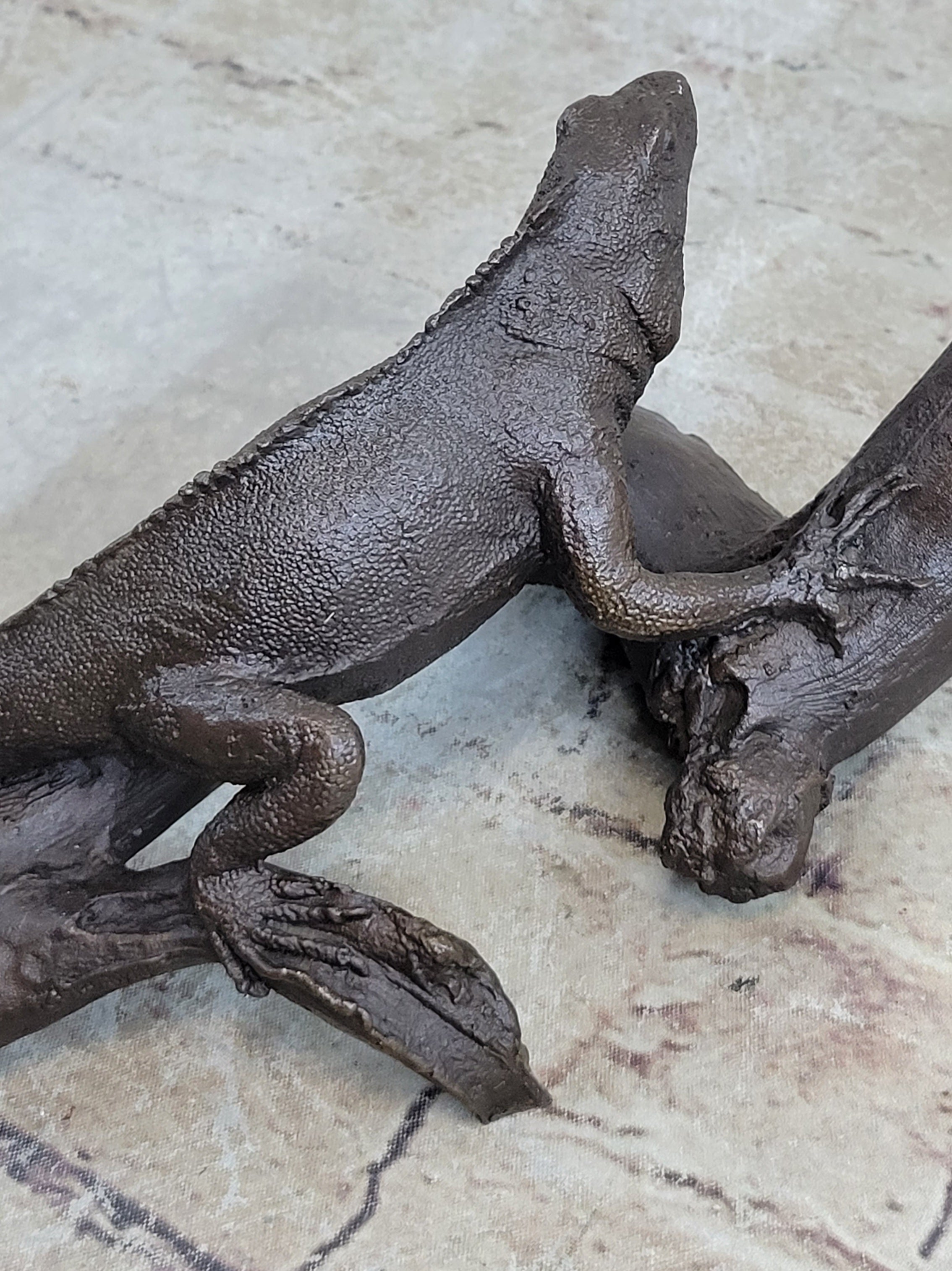 Bronze Iguana on Tree Branch Sculpture Hand Made Classic Reptile Artwork Statue