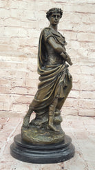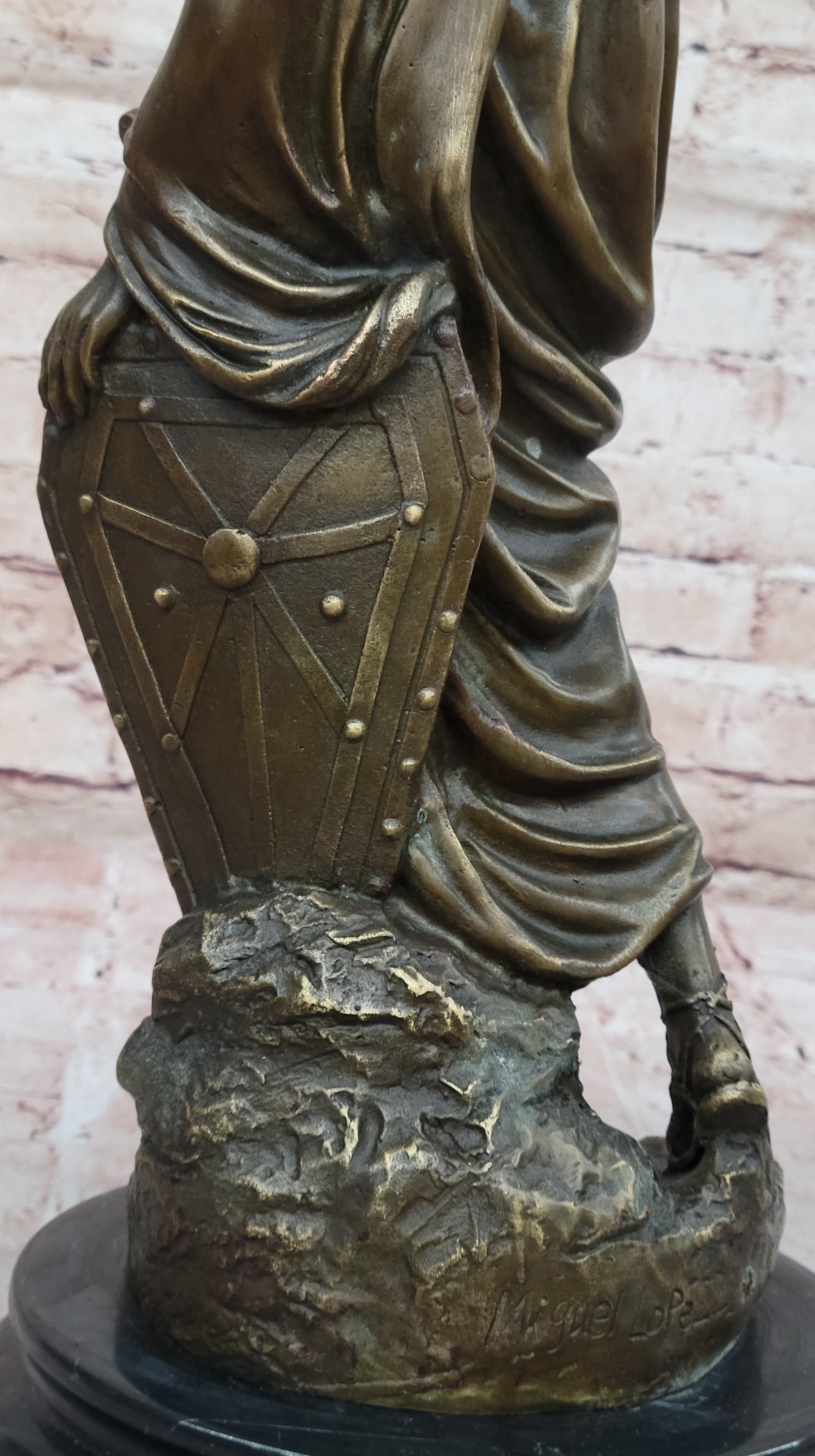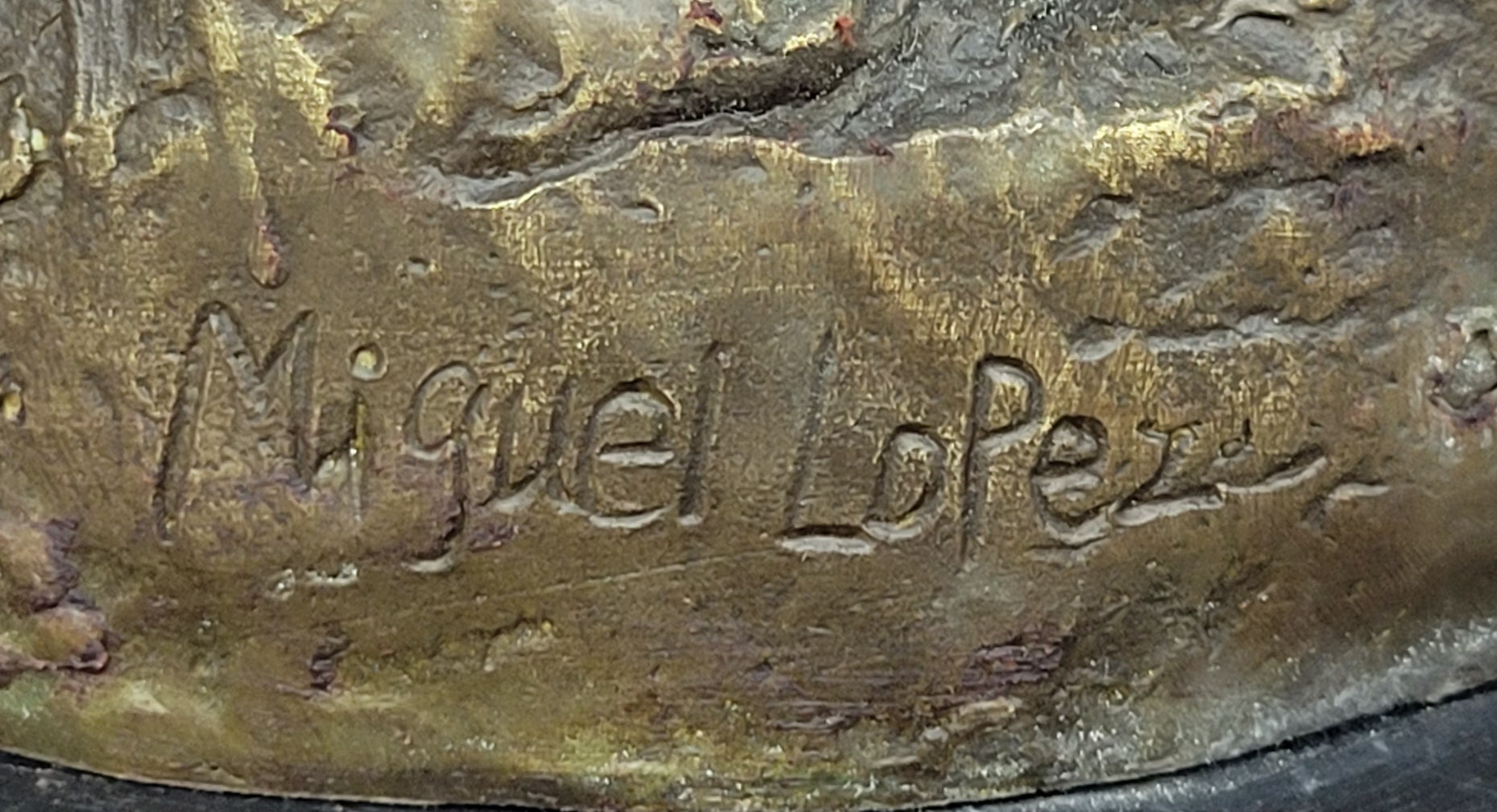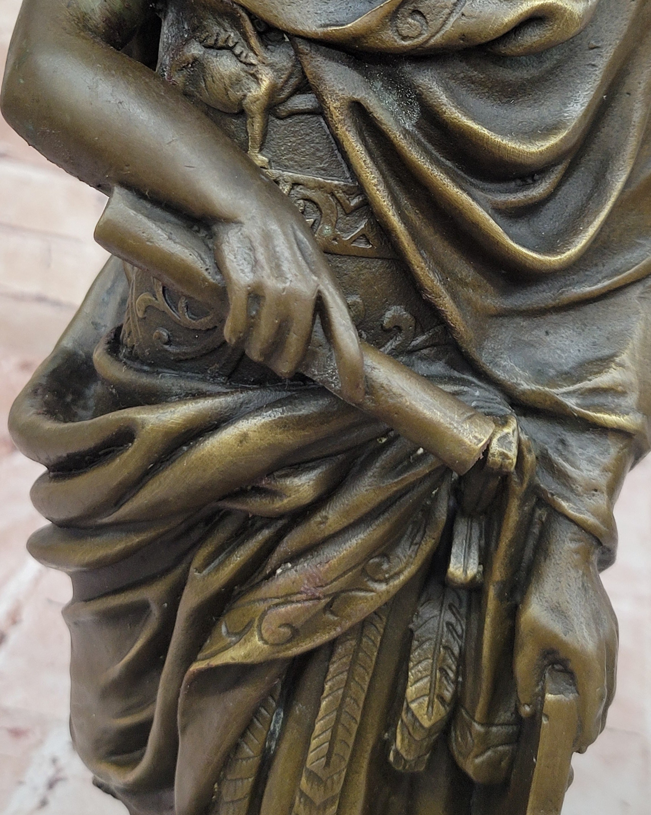 This piece was meticulously crafted using the age old lost wax casting method, ensuring high quality craftsmanship. Finished with a rich brown patina for preservation, Caesar stands proudly upon a black marble base and is signed by the artist Miguel Lopez, making this sculpture a timeless tribute to one of Rome’s greatest leaders.Bronze Dimensions with Marble Base: Height 17" X Width 7.5"