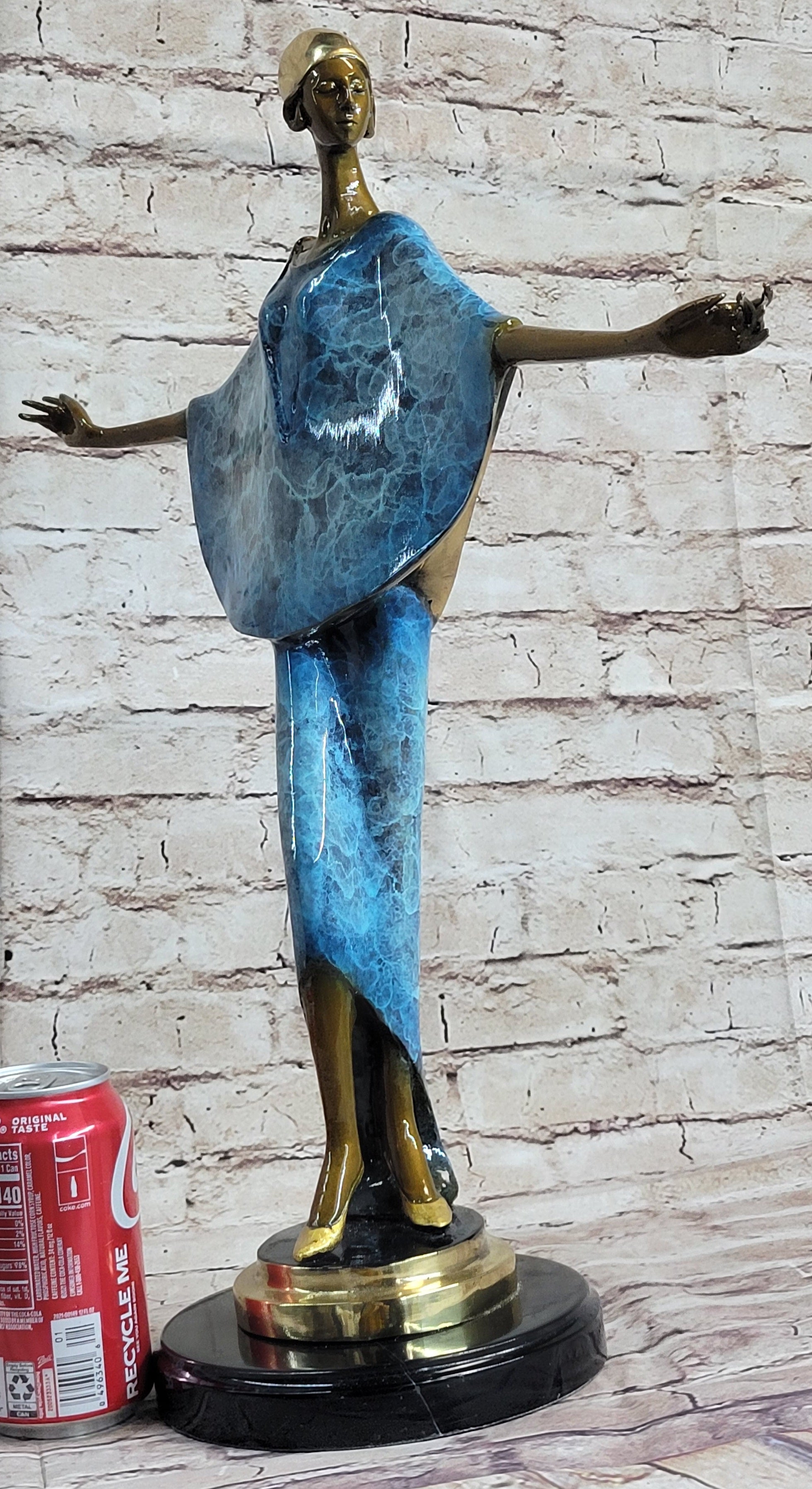 This exquisite bronze sculpture captures the essence of high fashion and the allure of the runway. The figure, a striking fashionista, stands confidently at the end of the runway, arms spread wide as she showcases her avant-garde outfit. Her unique poncho dress, a marvel of design, drapes elegantly over her slender frame, dipping low at the cleavage and transforming into a sleek pencil skirt that hugs her long legs. The rich silver patina of the dress contrasts beautifully with her bronze, brown-toned skin, creating a striking visual impact that commands attention. This piece embodies the excitement and glamour of the fashion world, freezing a moment of pure confidence and style.