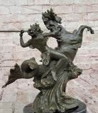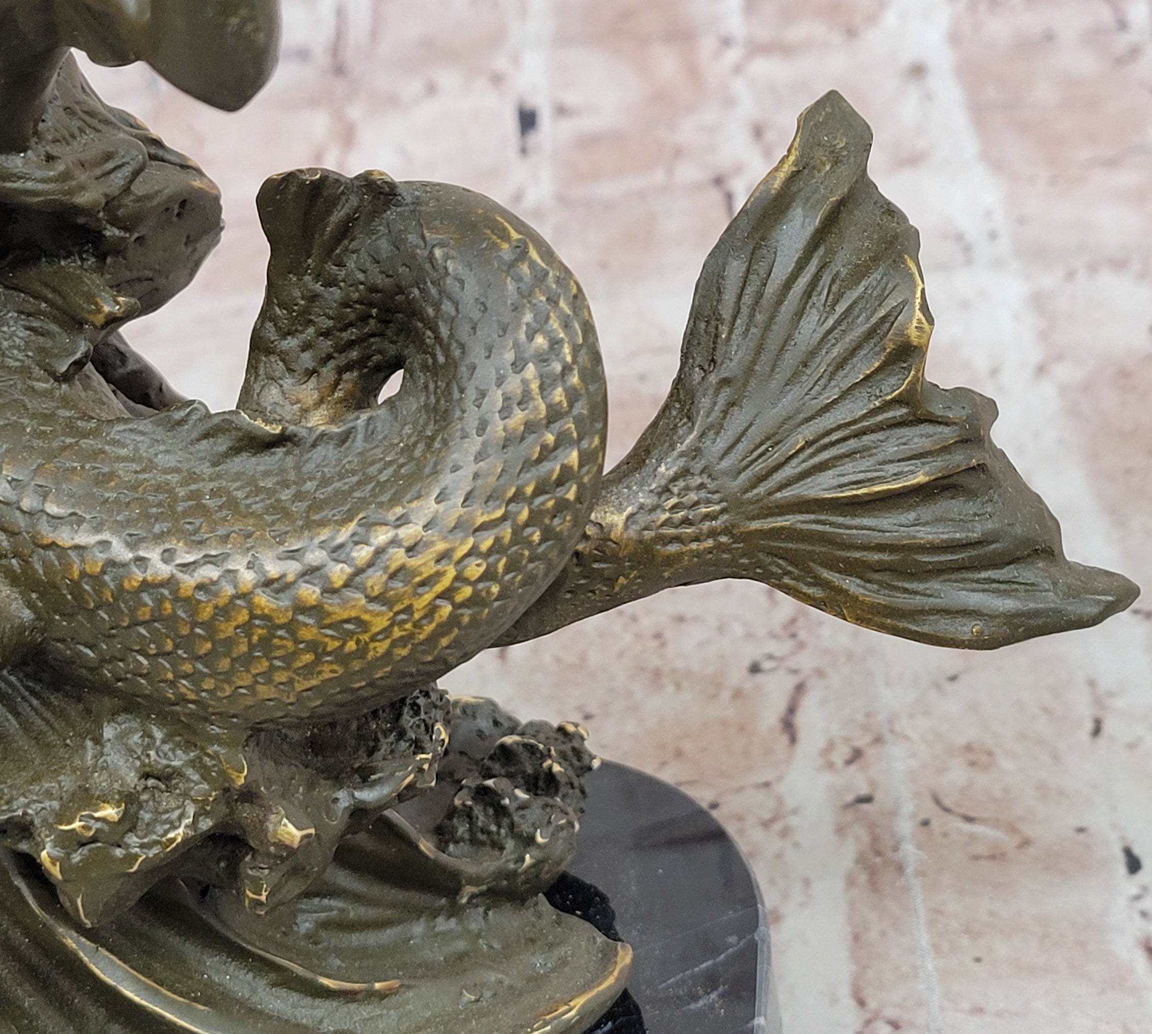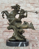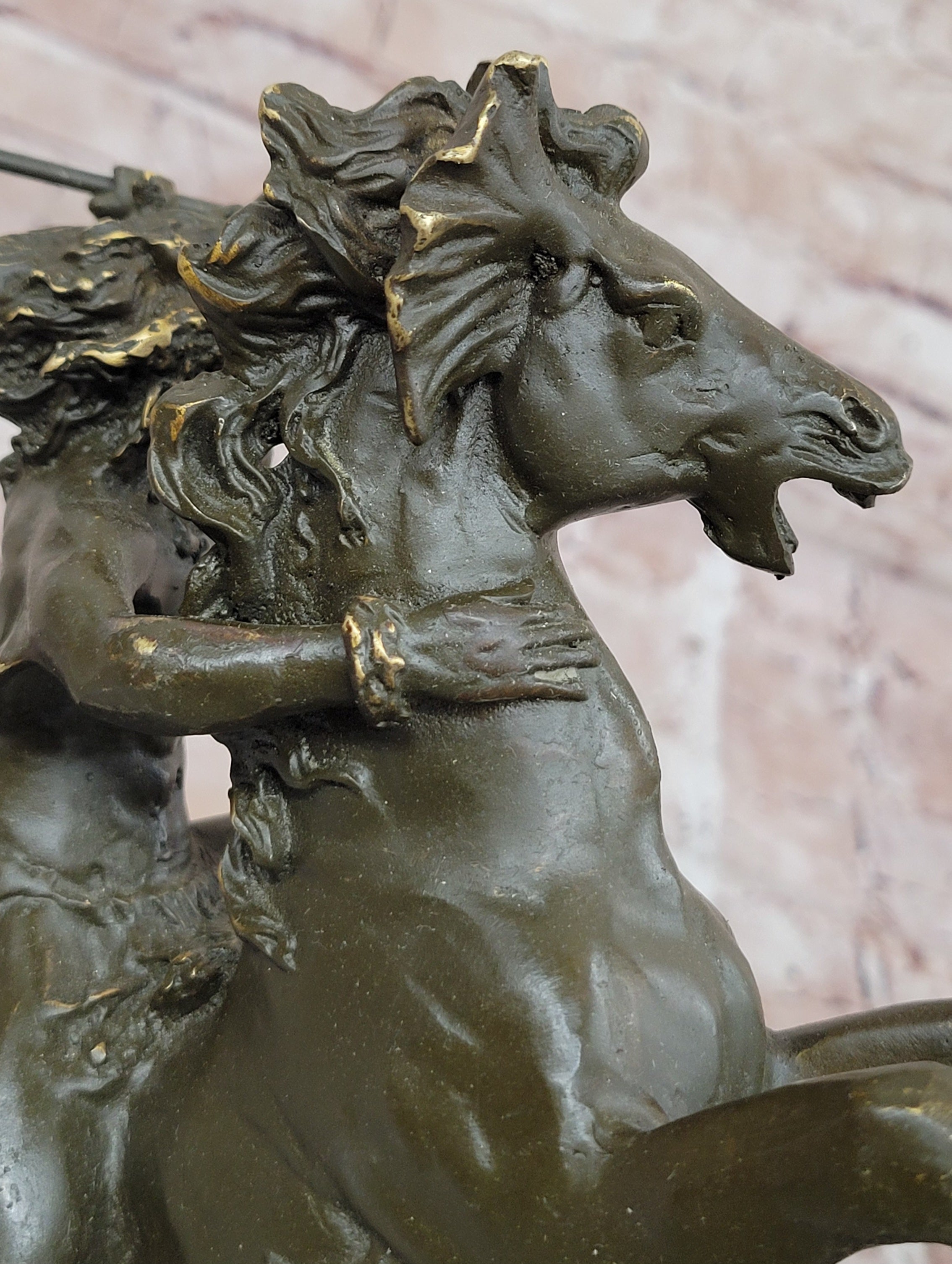Expertly handcrafted using the ancient lost wax casting method, this sculpture is hot cast in genuine bronze and features a rich brown patina that accentuates the intricacies of the design. The texture of Poseidon's muscular form, his windswept hair, and the dynamic lines of his garment are rendered with precision, bringing this legendary figure to life. The artist’s signature ensures authenticity and the collectible nature of the piece.
