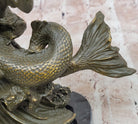 Set on a polished black marble base, the sculpture is both dramatic and refined—ideal for display in homes, offices, or art collections inspired by mythology, classical history, or marine themes. This signed artwork is a bold homage to the enduring legacy of Poseidon, capturing the timeless allure of ancient gods in exquisite bronze form.Bronze Dimensions with Marble Base: Height 12" X Width 12"