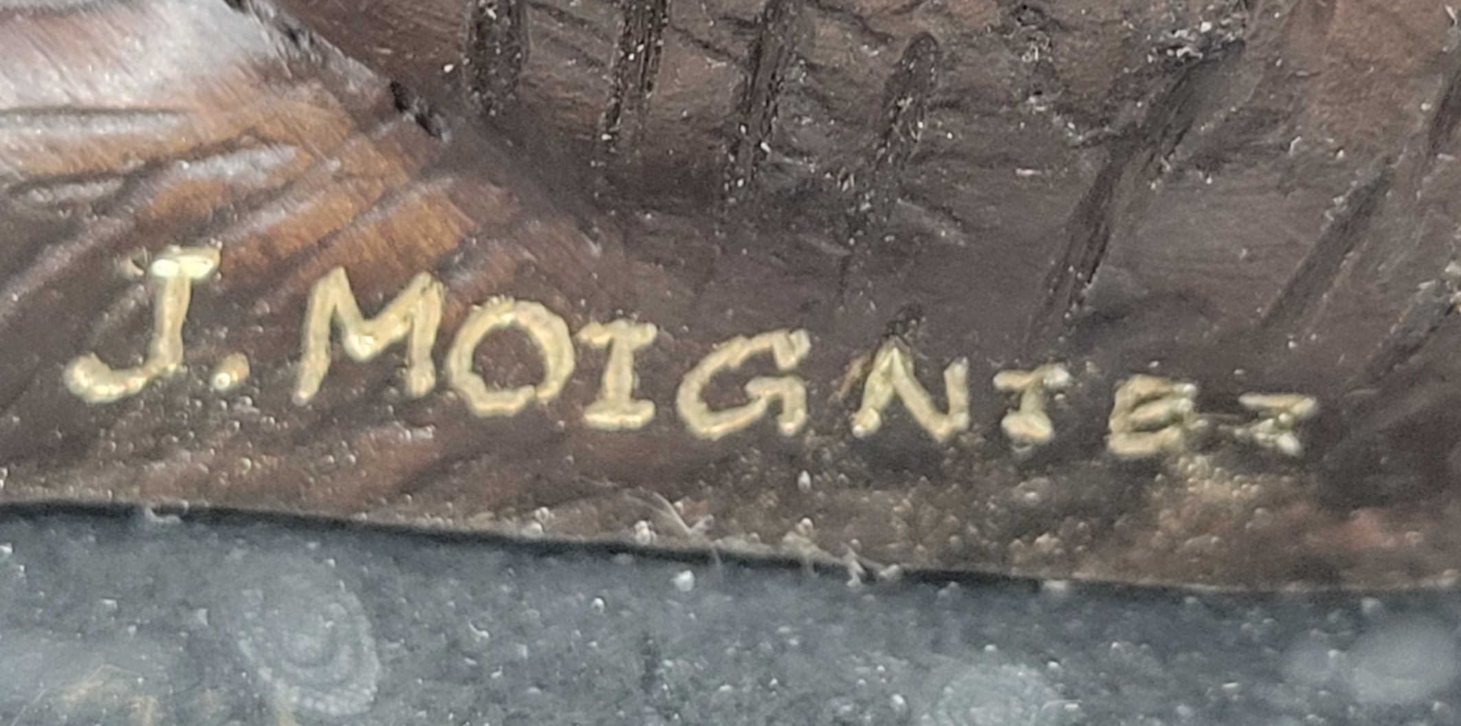 Mounted on a polished black marble base, this genuine bronze work combines durability with sophistication. Signed by the artist J. Moigniez, it is not only a decorative accent but also a collectible piece of classic canine artwork.Bronze Dimensions with Marble Base: Height 6" X Width 8"